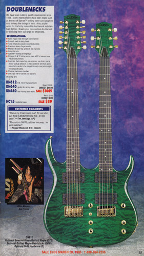 The catalog DN612 doubleneck marked the end of an era for Carvin. This was the last official production doubleneck that would appear in a catalog, one year short of the 40th anniversary of the first Carvin doubleneck model. Evidently, their popularity had waned, which was probably partly due to the rather dramatic price increases over the years. The base price of this model was $1649, although with the sale that was going on, all three doubleneck models (DN612, DN640 6-string/bass, DN440 fretted/fretless bass) were advertised at $1449, which by itself represented a $350 increase in 5 years. The catalog photo showed a DN612 in Emerald Green on quilt, with matching headstocks and gold hardware.