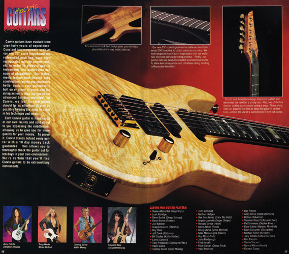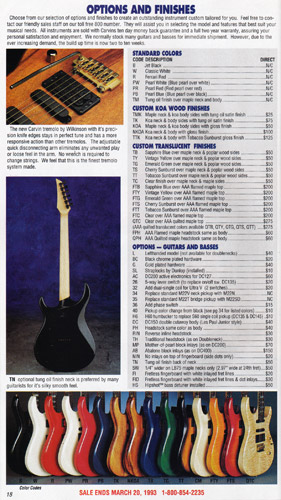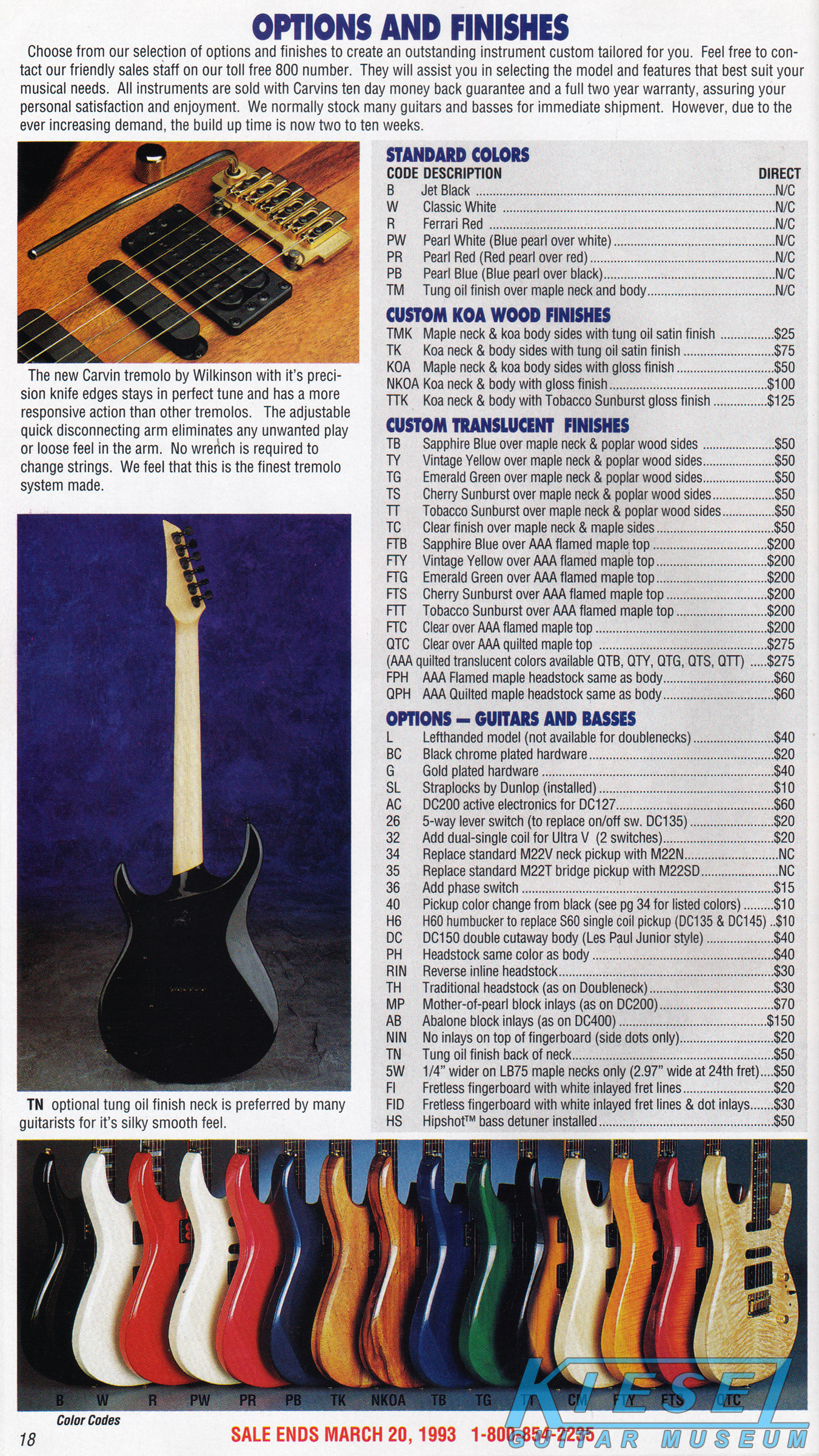 Carvin's line of colors continued to expand, with an assortment of 27 finishes available in various combinations of solid colors,