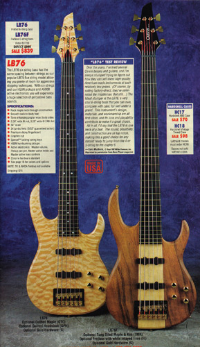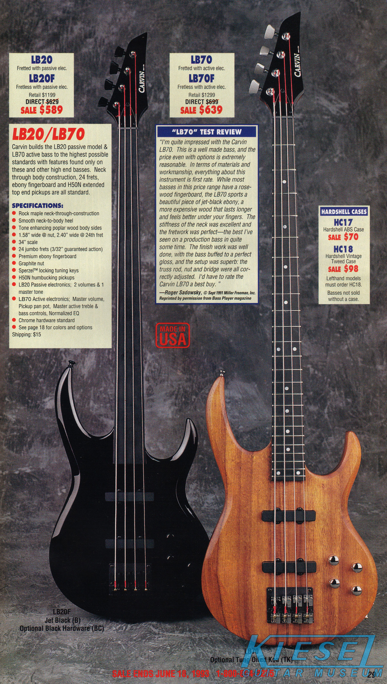 The LB20 and LB70 remained the same as the '92 models, although the list of options were expanding. In addition to more color, finish and wood options, a neat new gadget was added for bassist - the Hipshot de-tuner. This allowed the bassist to "drop" the tuning a whole step with the flip of a lever on the headstock (generally from E to D). Like the Kahler bass tremolo (which was dropped after '92, as Kahler began to fold), this was an innovative tool, and Carvin was willing to gamble on whether or not bassist would like it, and it's still offered to this day. 1993 base prices were $589 and $639 on the LB20 and LB70, respectively.
