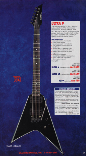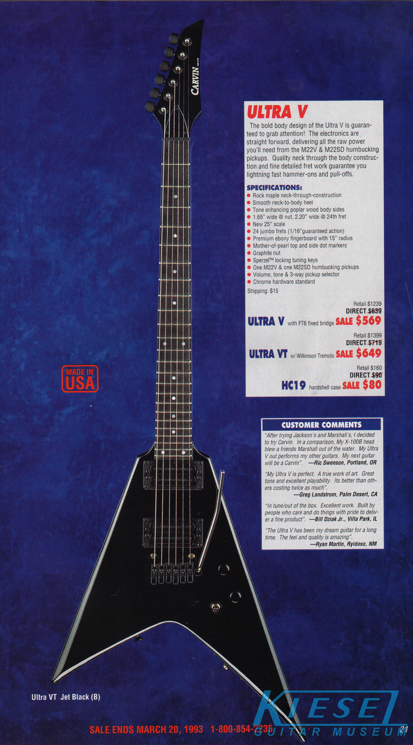 This was the last Ultra V that would appear in a Carvin catalog, bringing the pointy-guitar era to a close. The X220 had already been retired, and the V was riding off into the sunset right behind it. Apart from the scale length change, this Ultra V was essentially the same as it's predecessors, and sold for $569, or $649 with tremolo. The catalog showed the Ultra V in Jet Black with black hardware and tremolo.