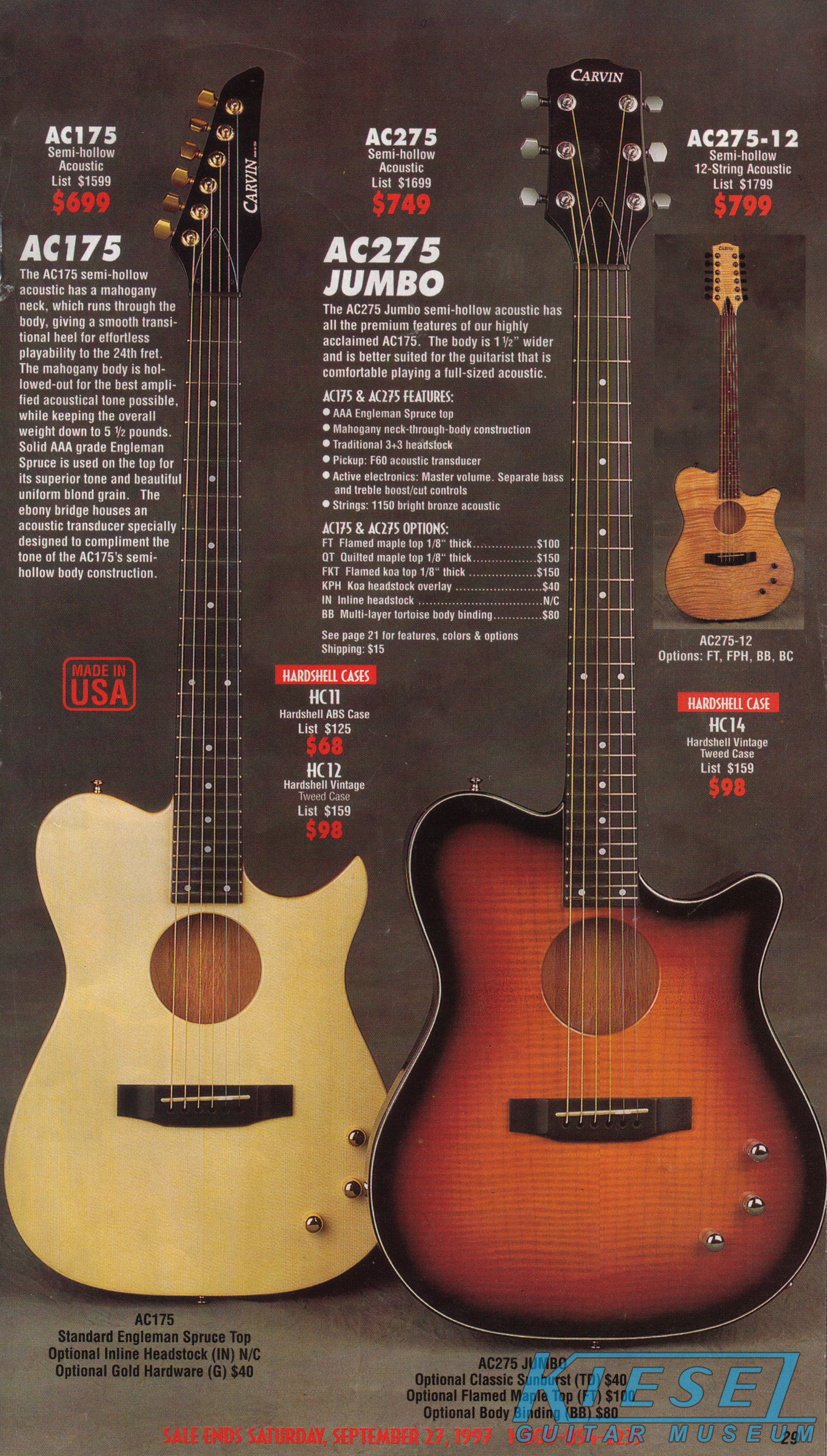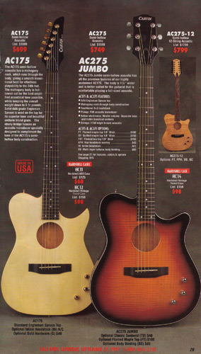 The AC175 and AC275 remained the same, down to the catalog photo and prices. Base price on the AC175 was $699, and base price on the AC275 was $769. The catalog showed an AC175 with natural spruce top, gold hardware, and inline headstock. The AC275 was shown in Classic Sunburst on flamed maple with body binding and chrome hardware.
