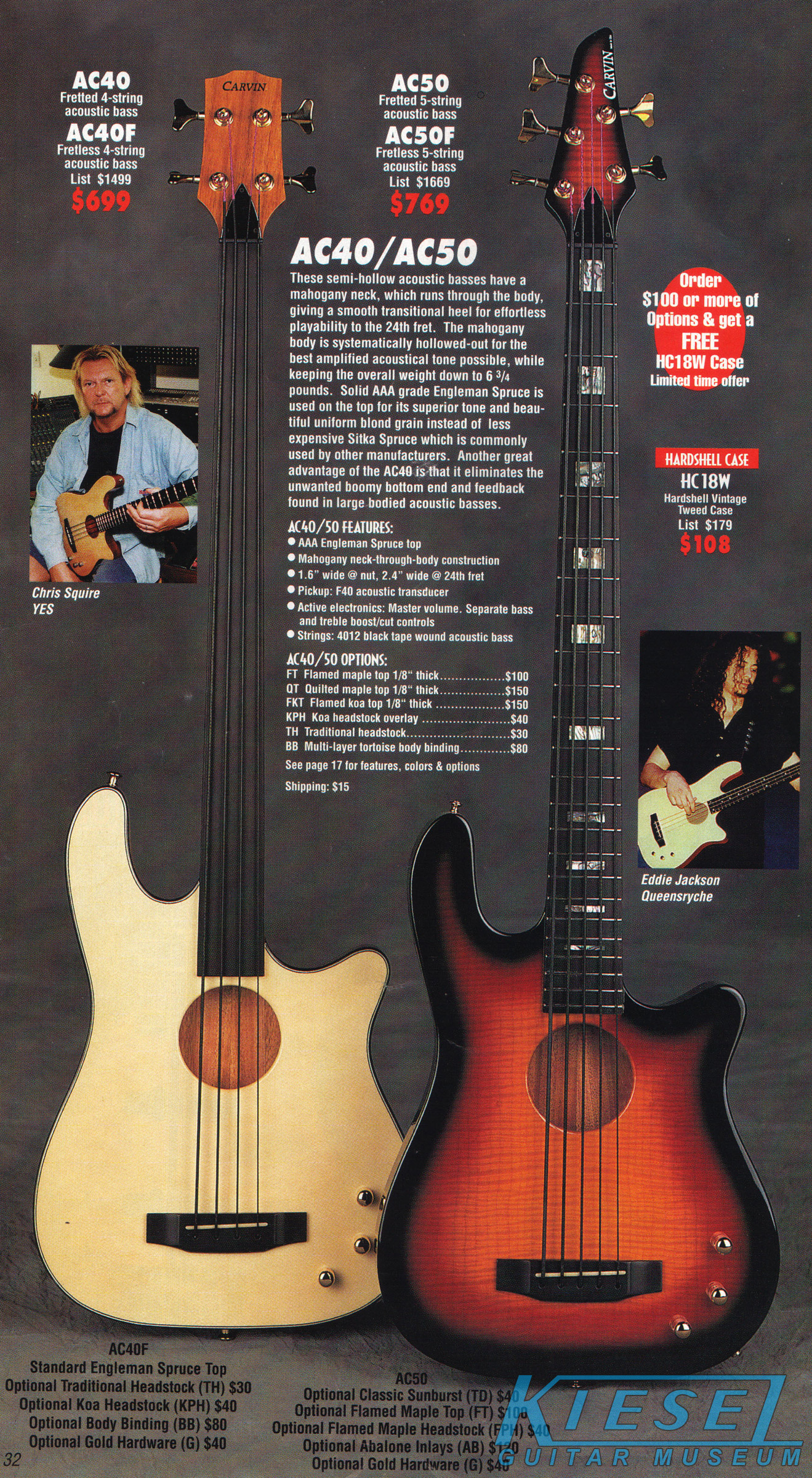 The AC40 and AC50 were now a year old, and going strong. Options and features were unchanged, but they did get a new catalog photo, showing in particular the Koa headstock overlay that was available. The base price on the AC40 was $699, and the base price on the AC50 was $769. The HC18 was the only case available for these models.