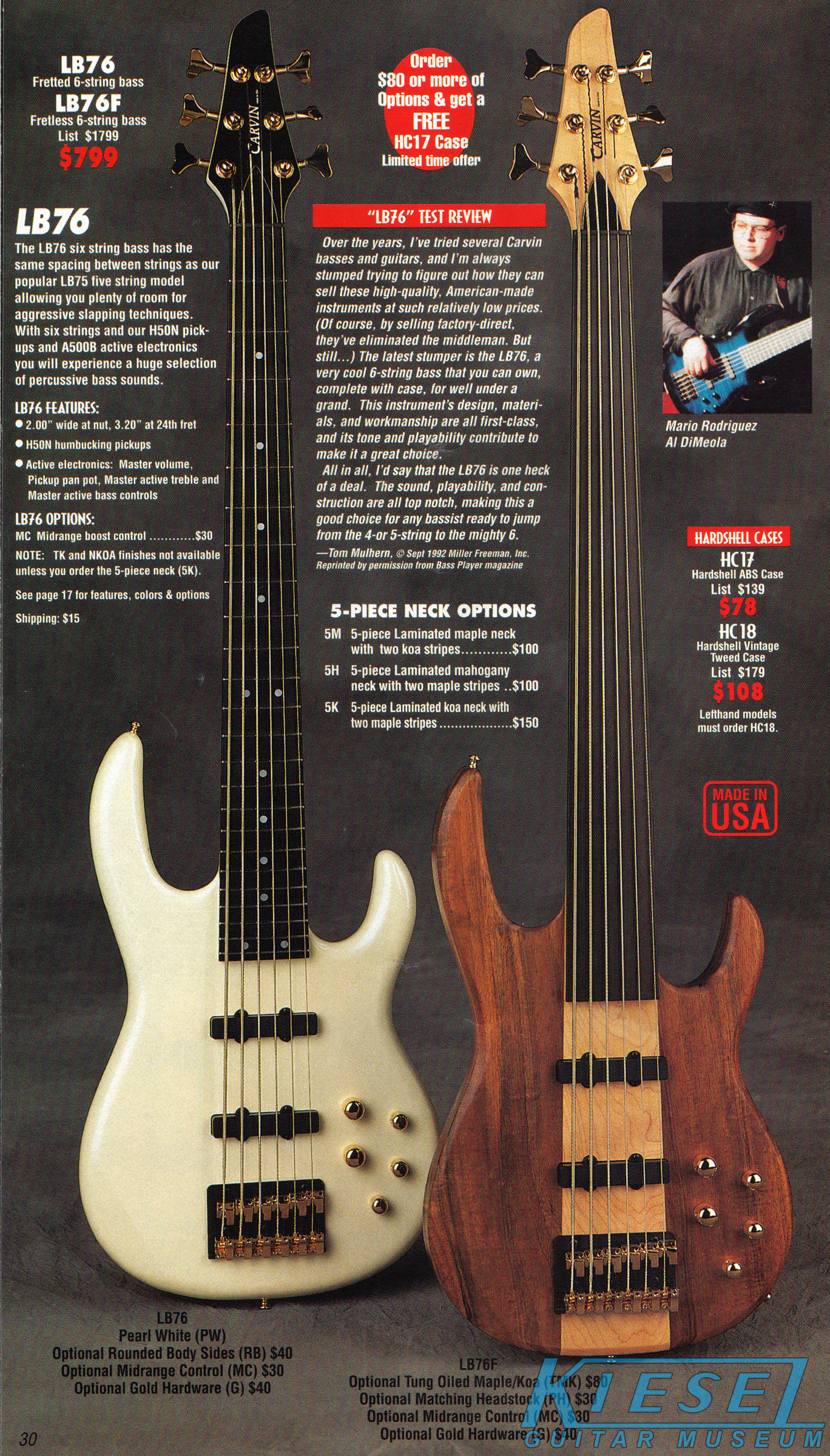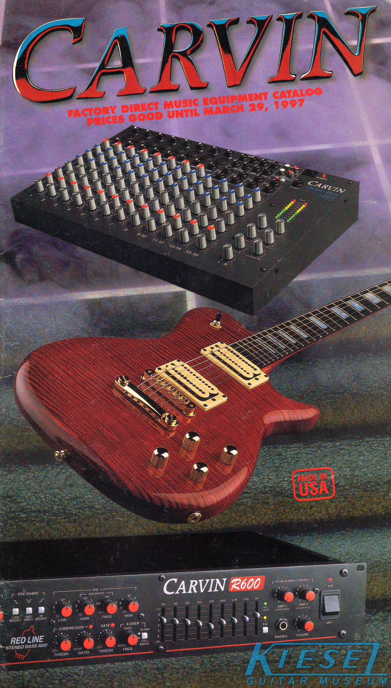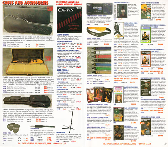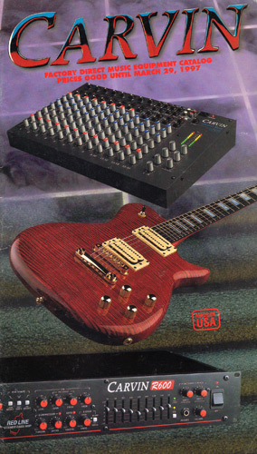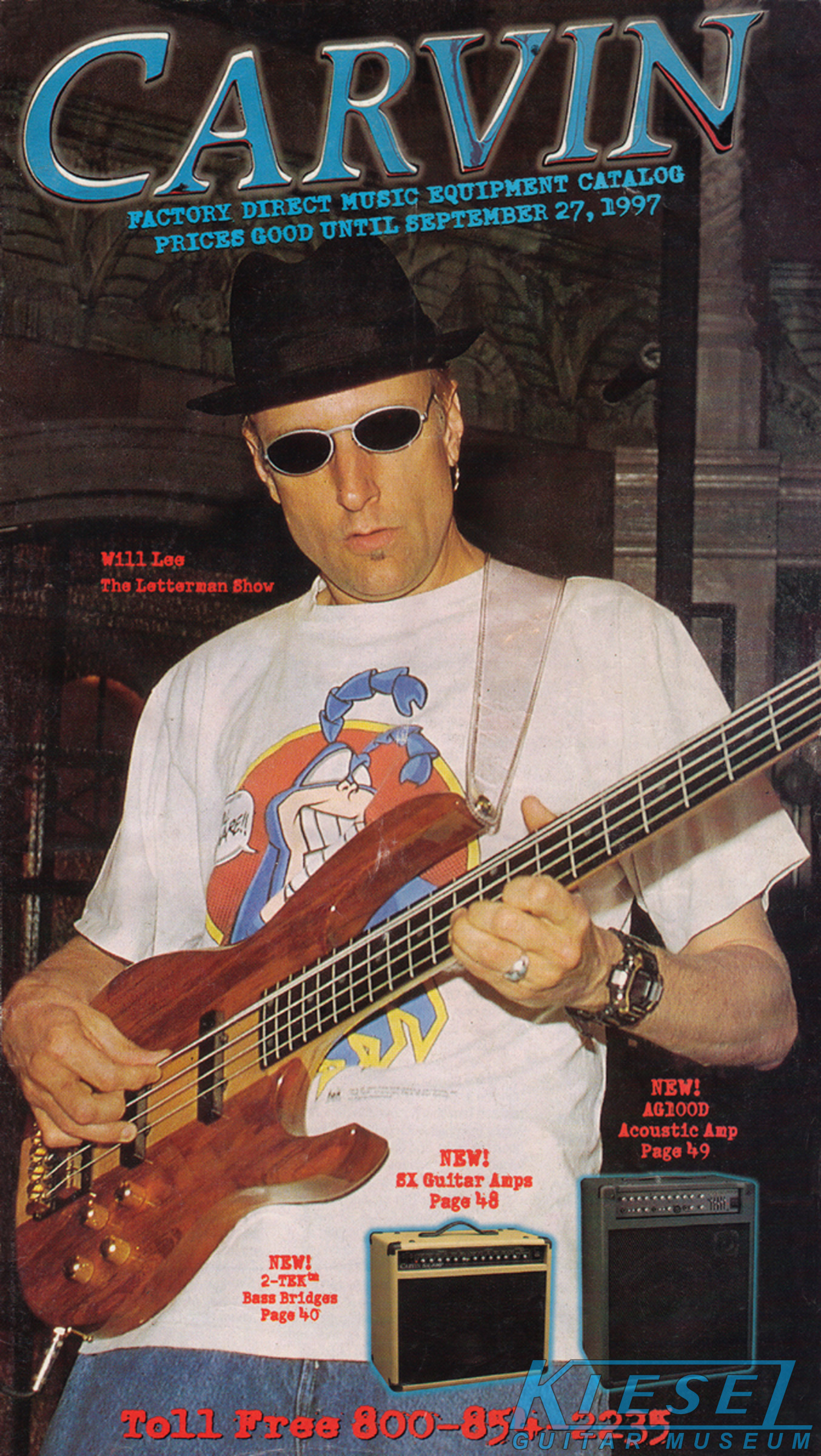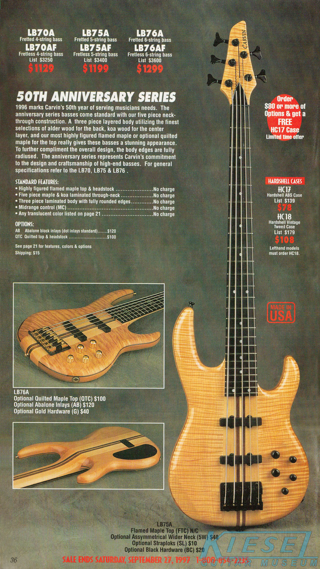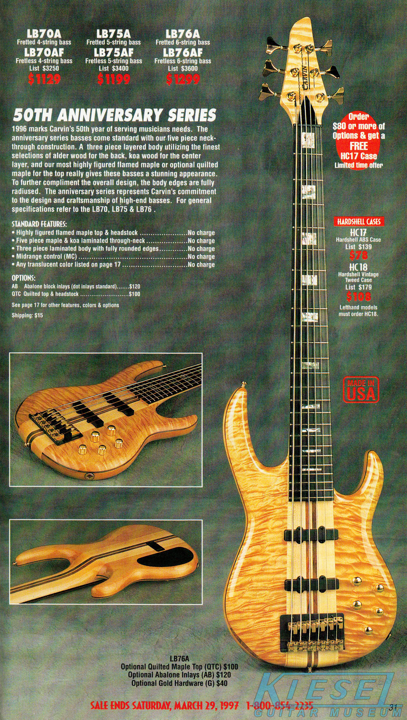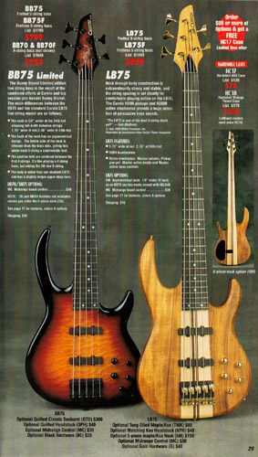 The BB75 was also unchanged for '97, as was the BB70, which was still not pictured in the catalog. The LB75 was unchanged as well. The inset photo in the catalog also shows another new option for Carvin basses, the 5-piece neck, in several combinations of wood, which made for a much stronger, more stable neck. Prices on the BB75 and LB75 were the same as '94 & '95, at $799 and $699. The new BB70 had a base price of $729. The HC17 ABS case for either model was $78, and the HC18 vintage tweed hardshell case for either model was $108.