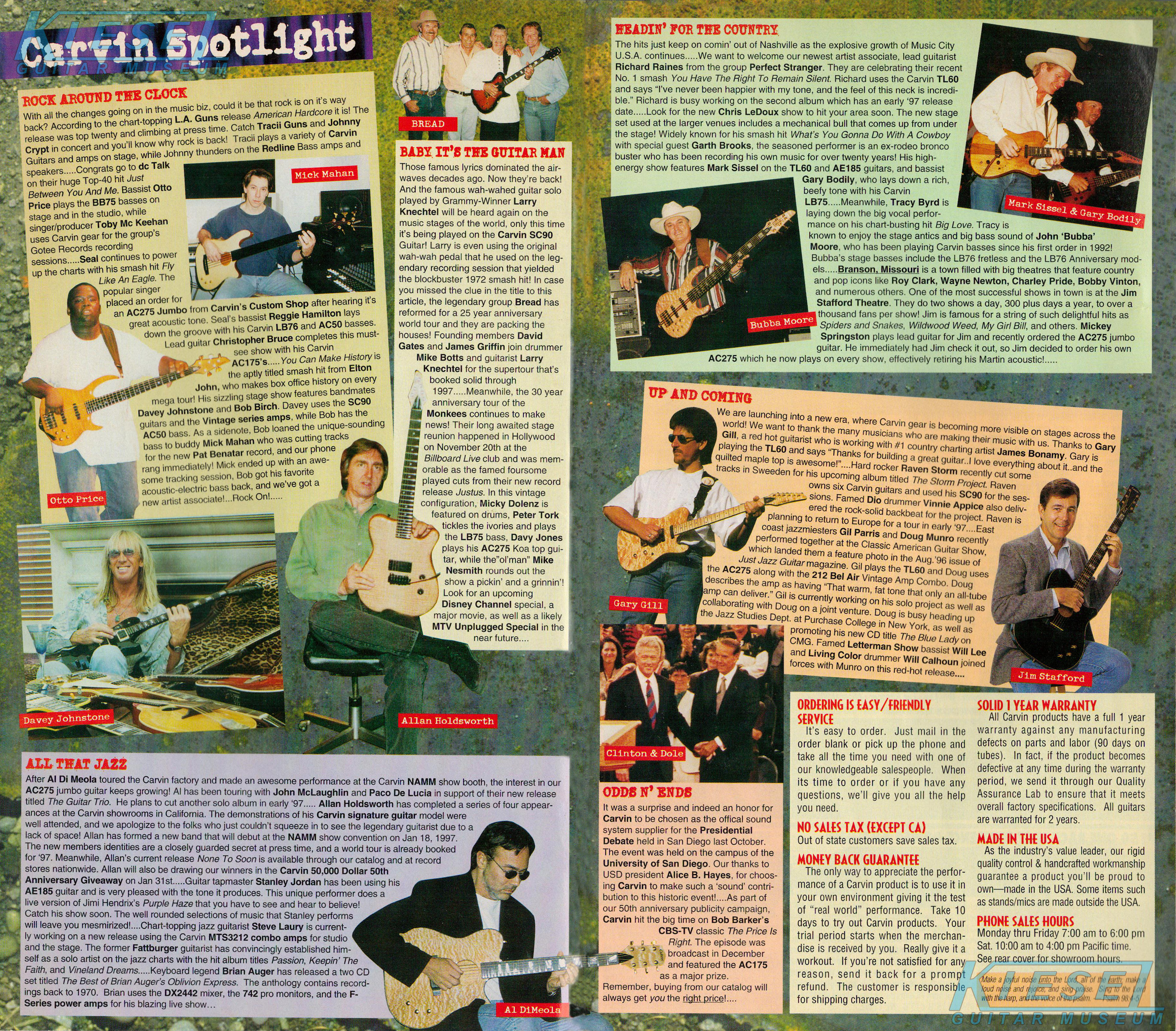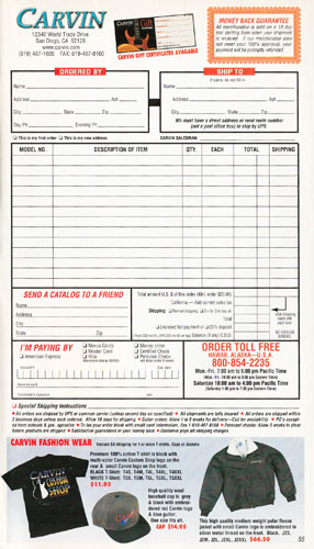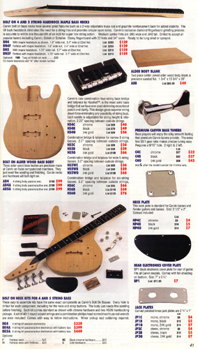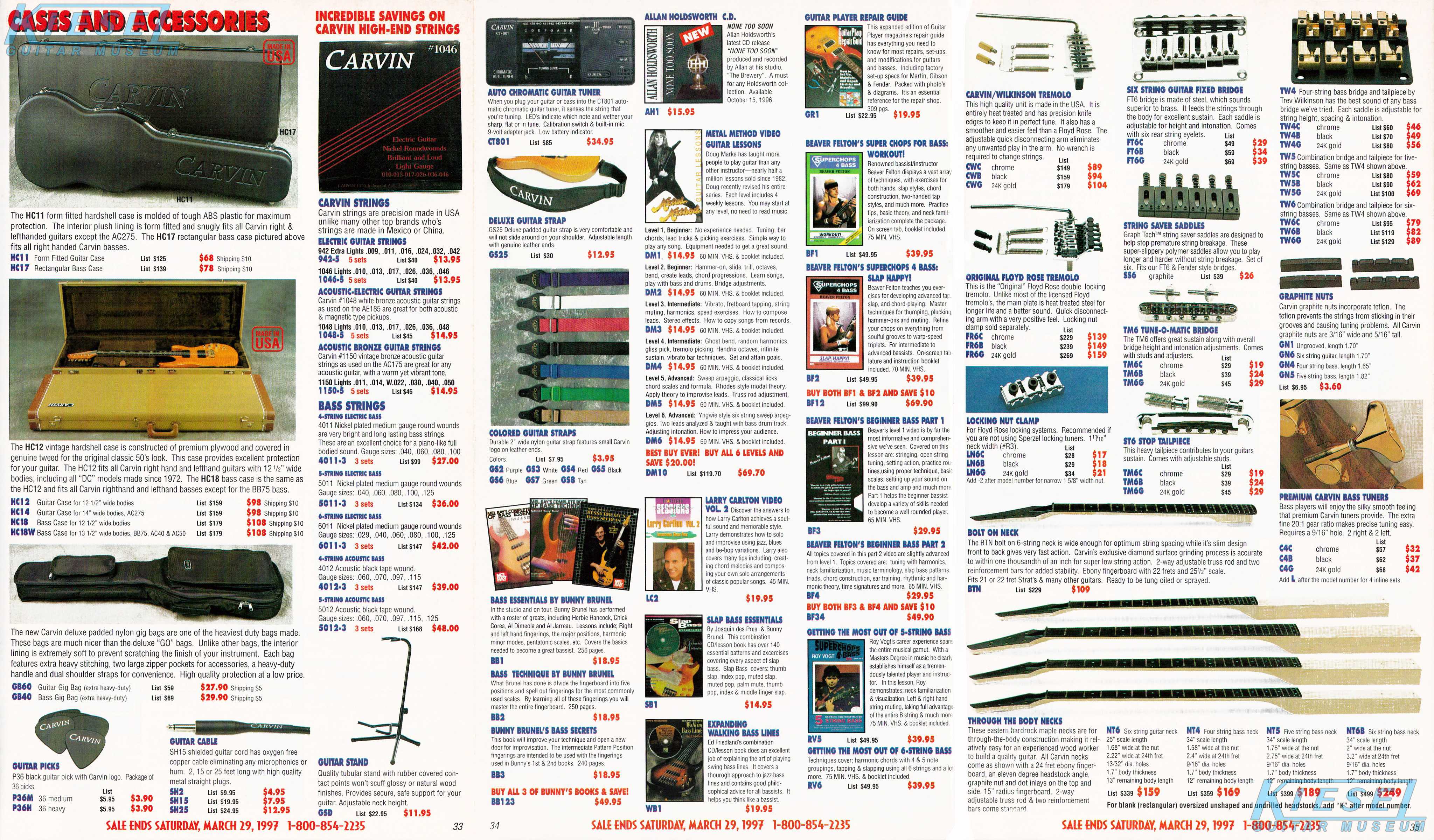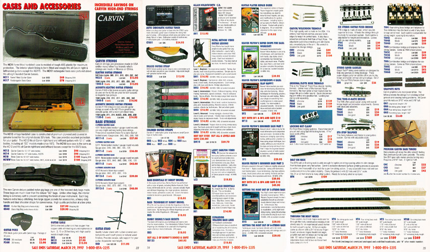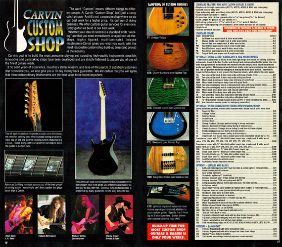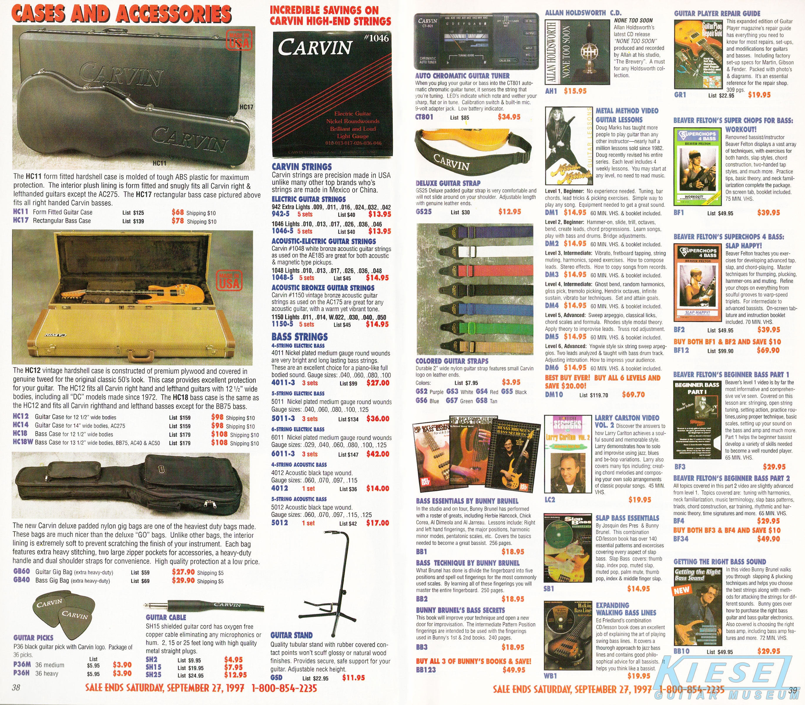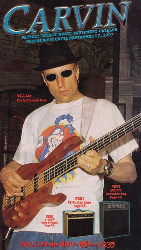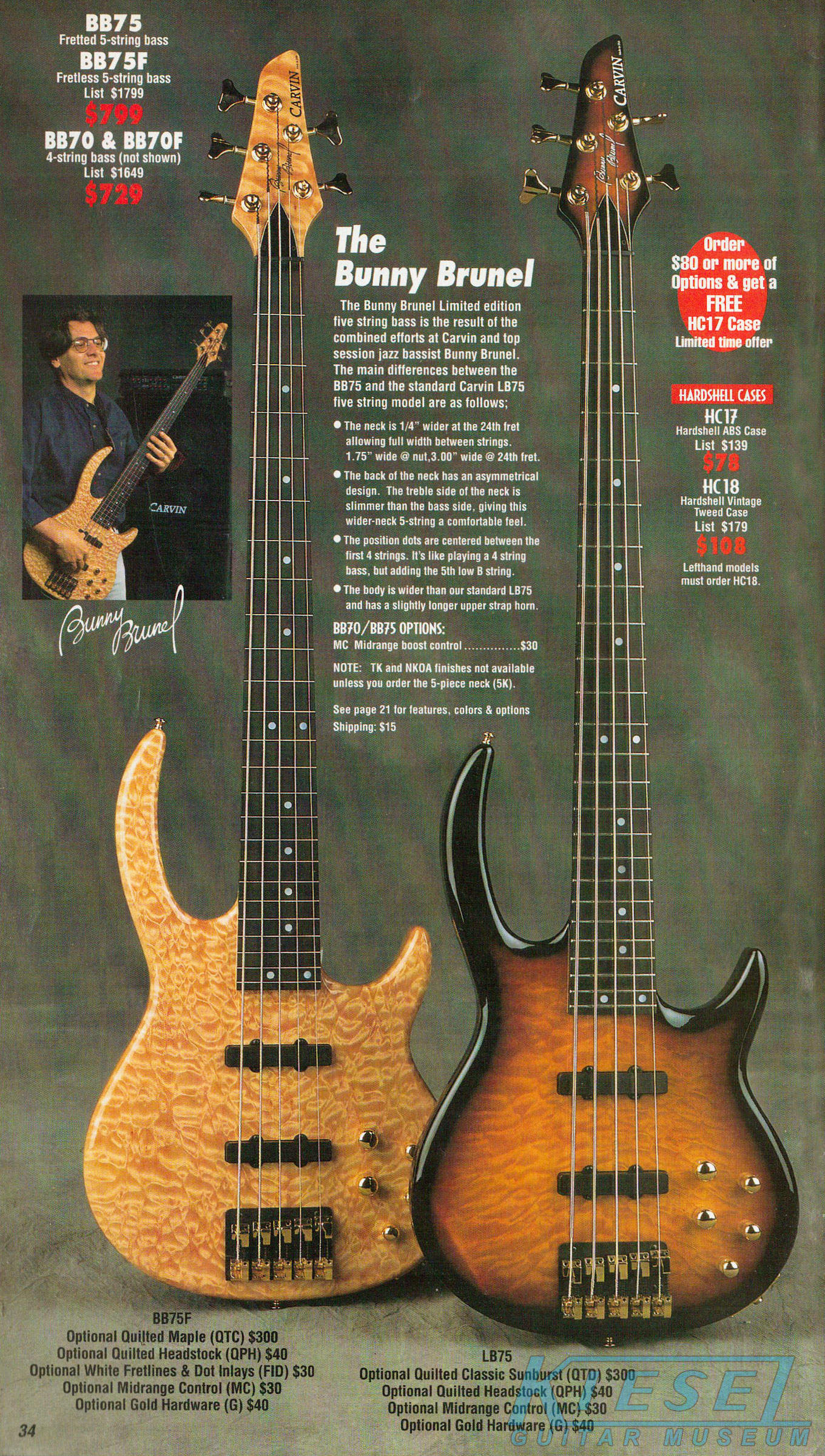 The BB75 was also unchanged for '97, as was the BB70, which was still not pictured in the catalog. The LB75 was unchanged as well. The inset photo in the catalog also shows another new option for Carvin basses, the 5-piece neck, in several combinations of wood, which made for a much stronger, more stable neck. Prices on the BB75 and LB75 were the same as '94 & '95, at $799 and $699. The new BB70 had a base price of $729. The HC17 ABS case for either model was $78, and the HC18 vintage tweed hardshell case for either model was $108.