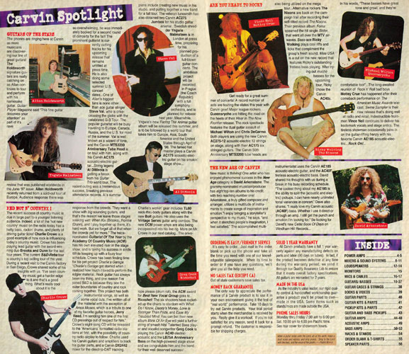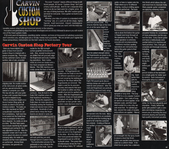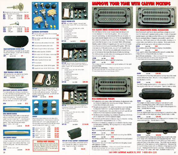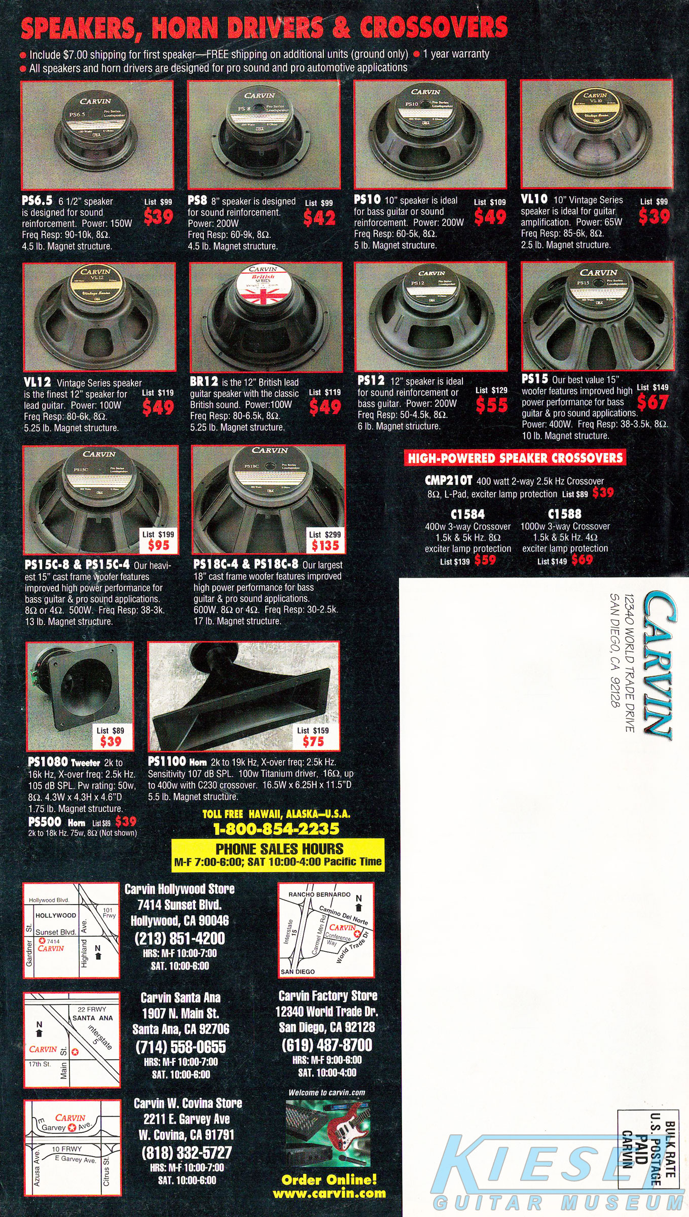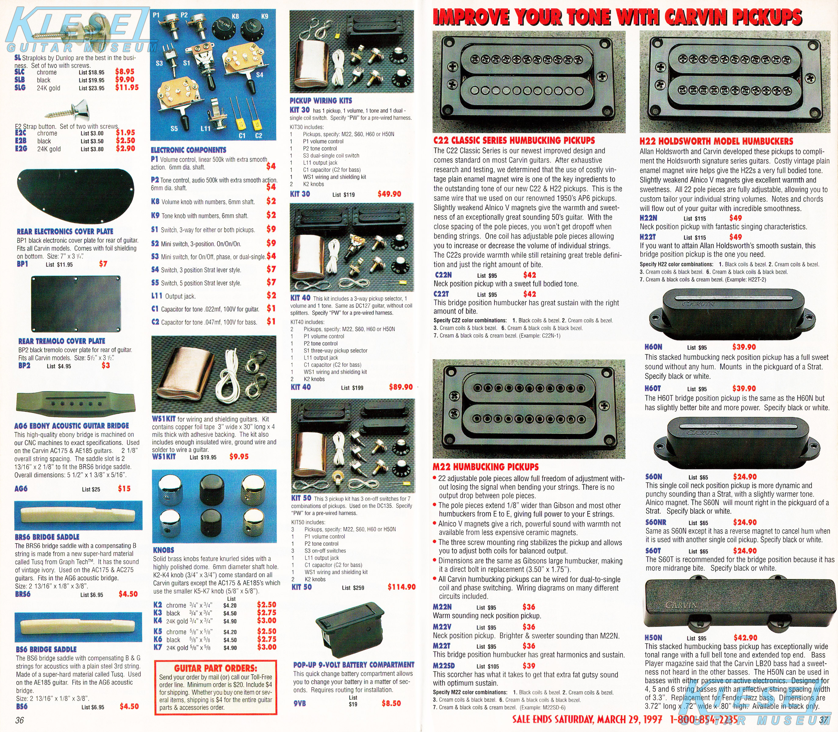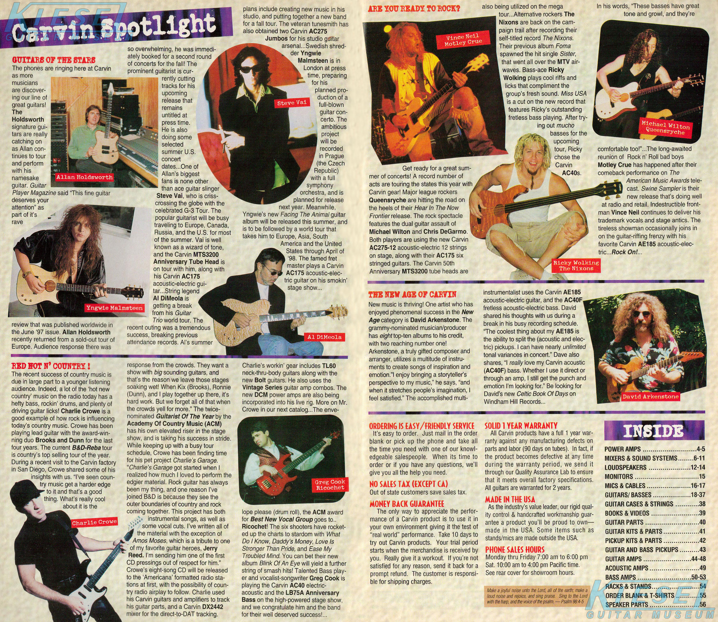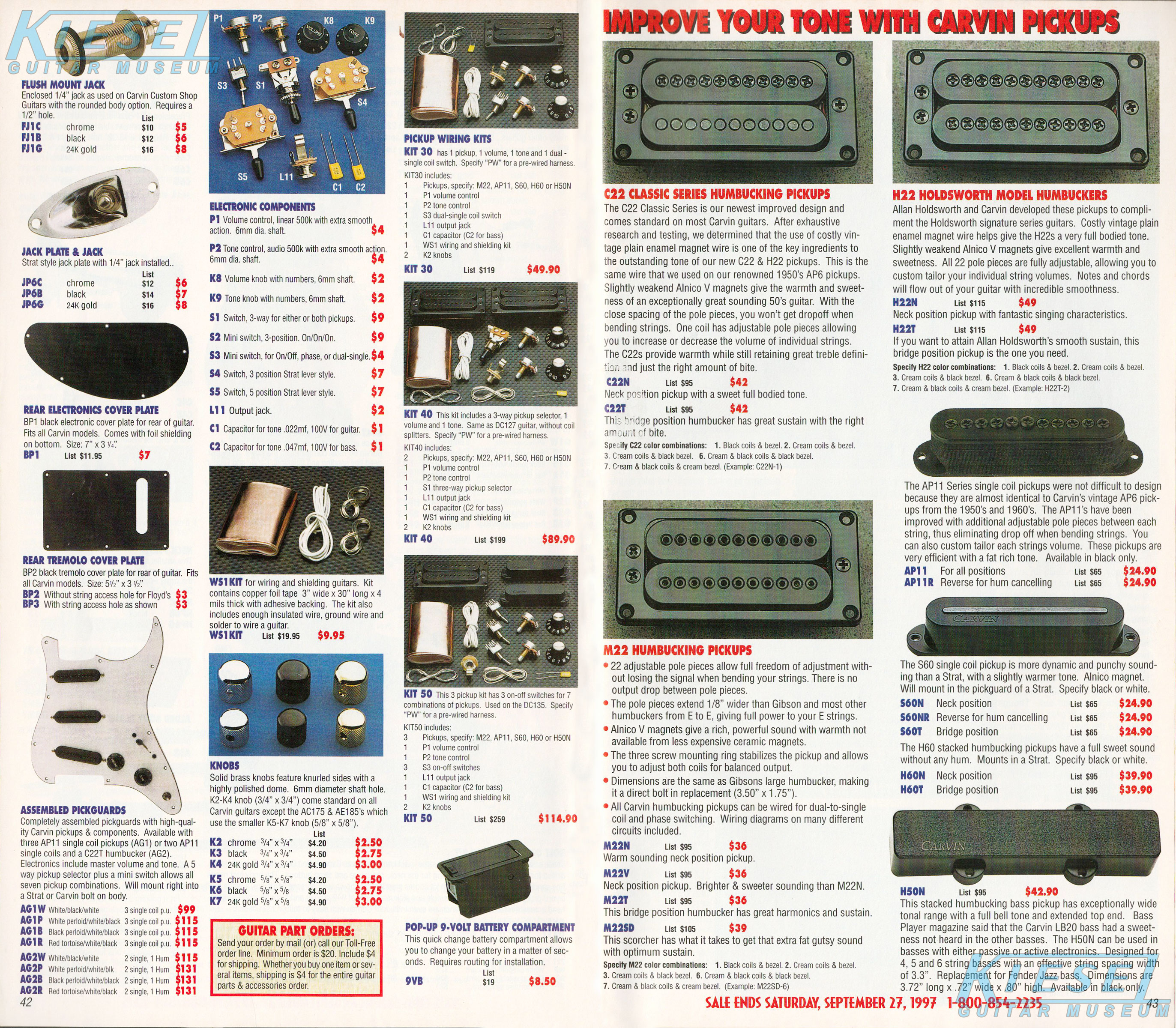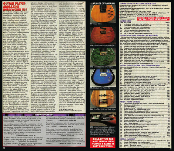 The BB75 was also unchanged for '97, as was the BB70, which was still not pictured in the catalog. The LB75 was unchanged as well. The inset photo in the catalog also shows another new option for Carvin basses, the 5-piece neck, in several combinations of wood, which made for a much stronger, more stable neck. Prices on the BB75 and LB75 were the same as '94 & '95, at $799 and $699. The new BB70 had a base price of $729. The HC17 ABS case for either model was $78, and the HC18 vintage tweed hardshell case for either model was $108.