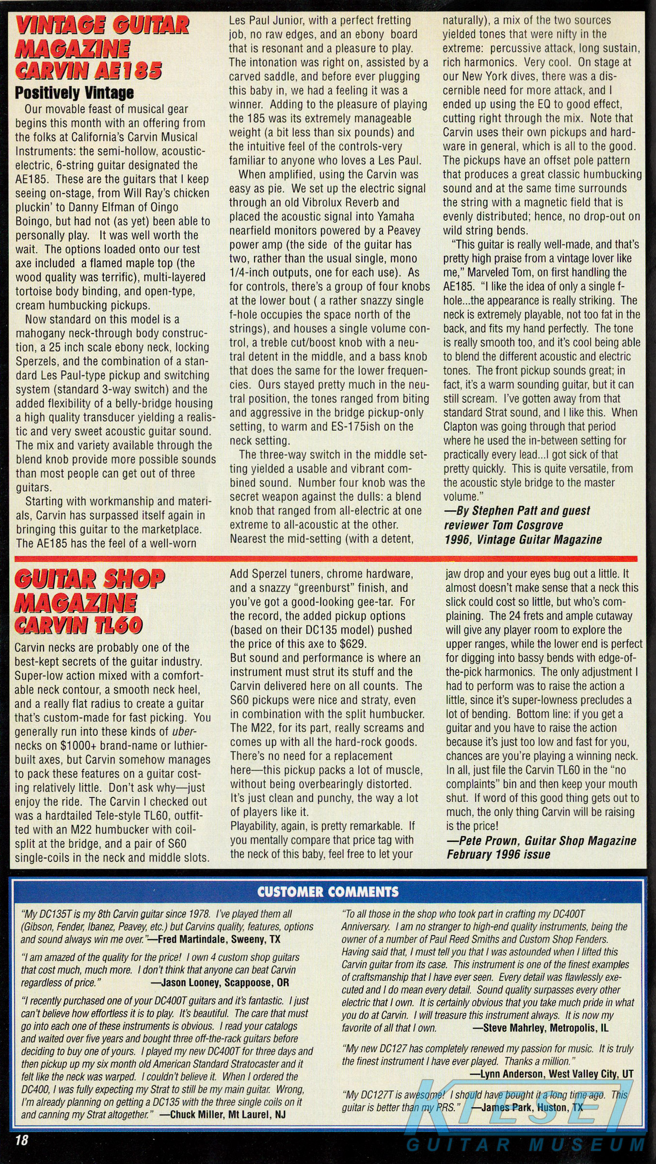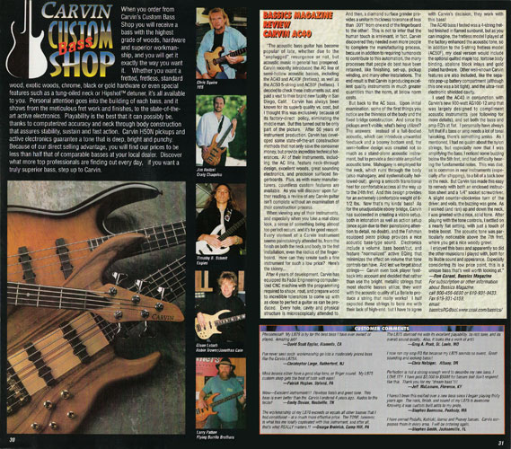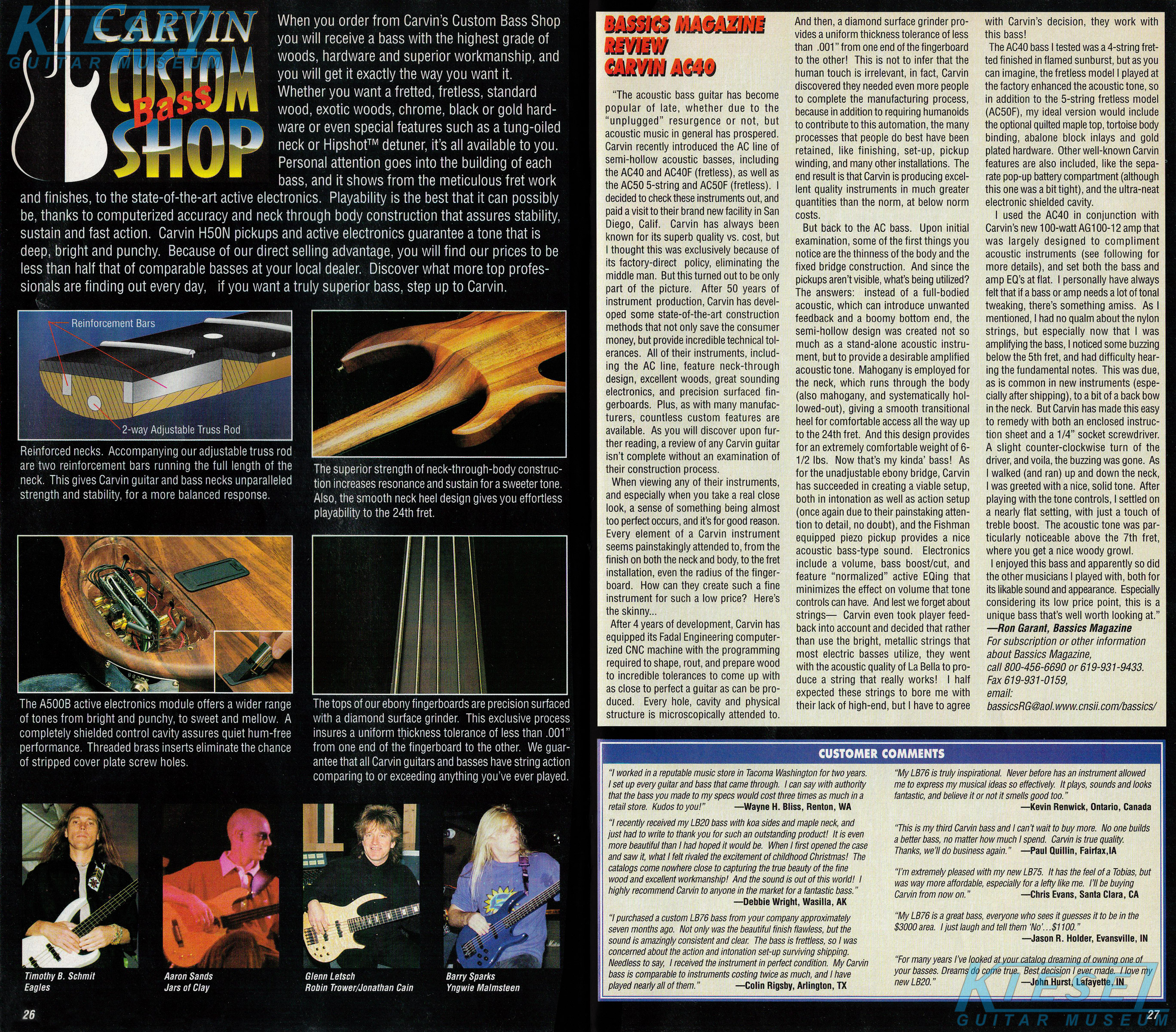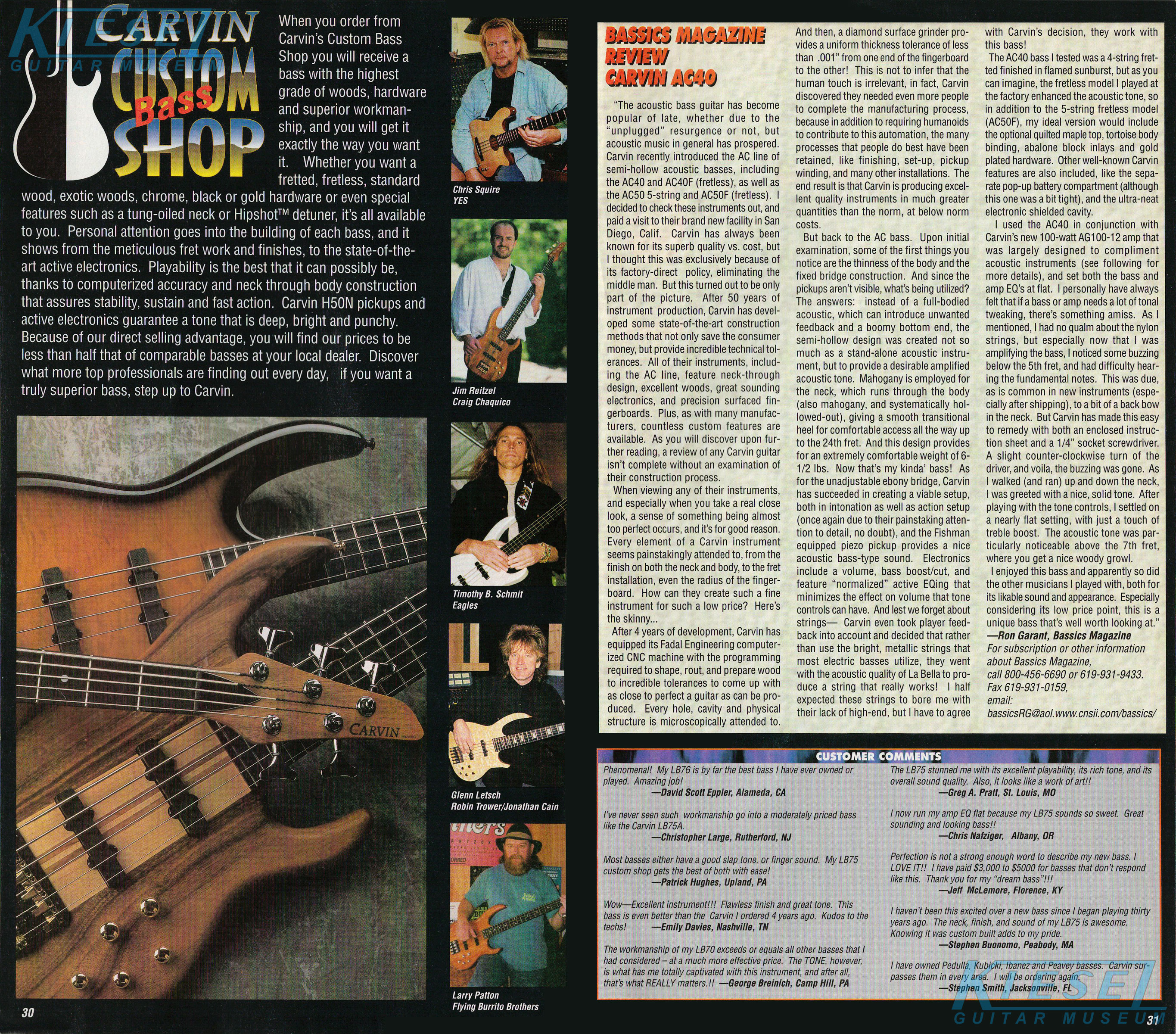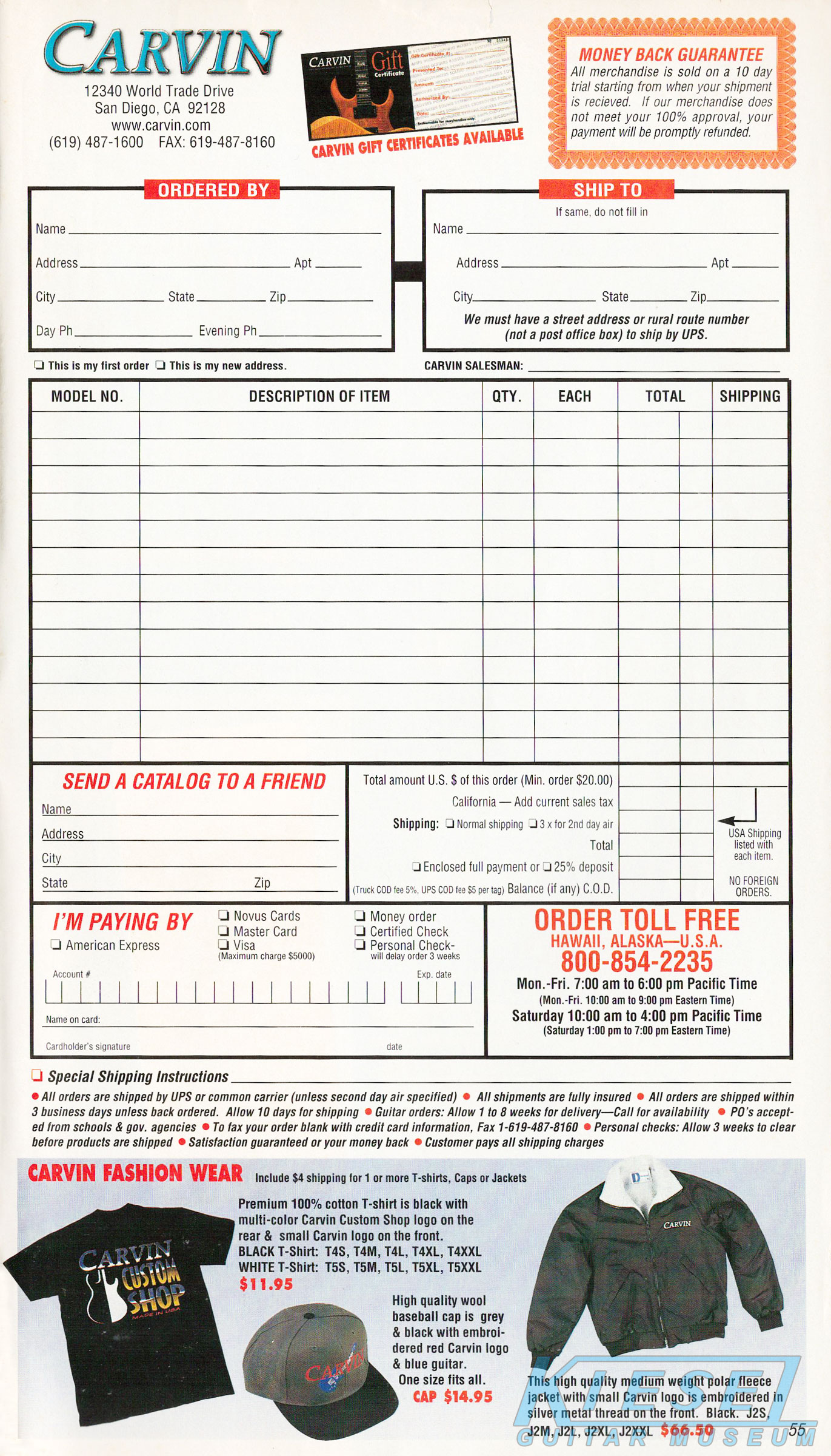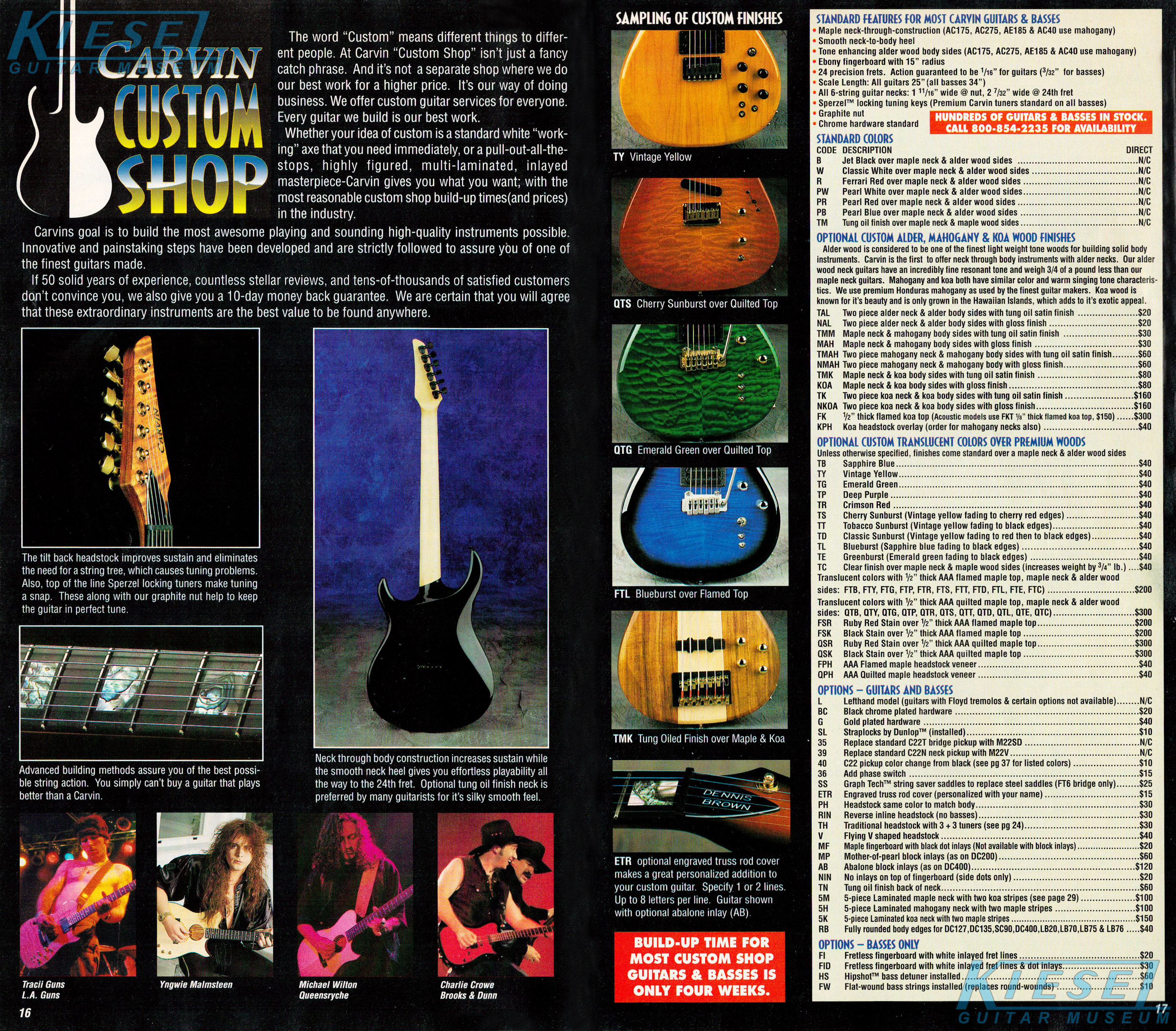 The BB75 was also unchanged for '97, as was the BB70, which was still not pictured in the catalog. The LB75 was unchanged as well. The inset photo in the catalog also shows another new option for Carvin basses, the 5-piece neck, in several combinations of wood, which made for a much stronger, more stable neck. Prices on the BB75 and LB75 were the same as '94 & '95, at $799 and $699. The new BB70 had a base price of $729. The HC17 ABS case for either model was $78, and the HC18 vintage tweed hardshell case for either model was $108.