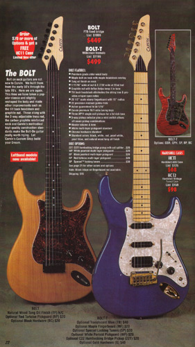 The new Bolt took the best features of many guitars and put them into one. Although there is a physical resemblance to a Fender Stratocaster, it is only a resemblance. The Bolt, called that because it was a bolt-neck guitar, used all the same high-quality materials of Carvin's other guitars and basses, and the same skilled craftsmen made them as made Carvin's top-of-the-line models. Standard features on the Bolt included an alder body, 25 1/2" scale, 22-fret tung-oiled hardrock maple neck with maple headstock overlay, Carvin premium tuners, ebony fingerboard and white multi-layer pickguard. Electronics consisted of 3 rear-mounted AP11 single coil pickups with single volume and tone controls, and a 5-way switch/mini-switch allowing all 7 pickup configurations. The Bolt had a base price of $449, and the Bolt-T, with Wilkinson tremolo, had a base price of $499. The standard array of Carvin options were available, as were Bolt-specific options, such as different colored pickguards. The Fall catalog photo showed a Bolt in with natural tung oiled finish, red tortoise pickguard and black chrome hardware, and a Bolt-T in translucent blue, with maple fingerboard, Sperzel tuners, white pearloid pickguard, C22 bridge pickup and gold hardware. The inset photo showed a Bolt-T in Ruby Red Stain on quilt with matching headstock, black pearloid pickguard and black chrome hardware.