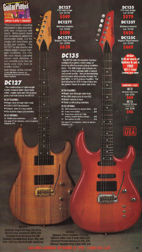 The DC127 and DC135 were unchanged for 1997, and the same photo was used from 1996. The prices increased slightly, starting at $549 for the DC127 and $579 for the DC135. The Fall catalog showed the DC127 in tung-oiled koa with matching headstock and rounded body sides, Wilkinson tremolo and gold hardware. The DC135 was shown in Cherry Sunburst with alder neck, matching headstock and rounded body sides, chrome hardware, and Wilkinson tremolo.