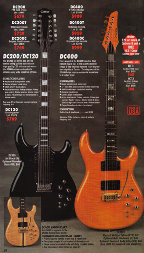 The DC200 and DC400 were unchanged for 1997, and the same catalog photo was used, showing the DC120 and DC400, but not the DC200. The price on the DC200 hardtail rose slightly to $679 ($729 with the Wilkinson, $769 with the Floyd Rose). The DC120 12-string remained as $769. The DC400 hardtail rose slightly to $909 for the base model, or $959 and $999 with the Wilkinson or Floyd Rose tremolo, respectively. The catalog inset photo showed the DC400 Anniversary model, which was a highly upgraded DC400, with 5-piece maple/koa neck, flamed maple top and matching headstock, and 3-piece alder/koa/flamed maple body. It was available as a $200 upgrade to the DC400, DC400T or DC400C. The catalog photo showed the DC120 in Jet Black with rounded body sides, and the DC400 in Vintage Yellow on flamed maple with Wilkinson tremolo and gold hardware.