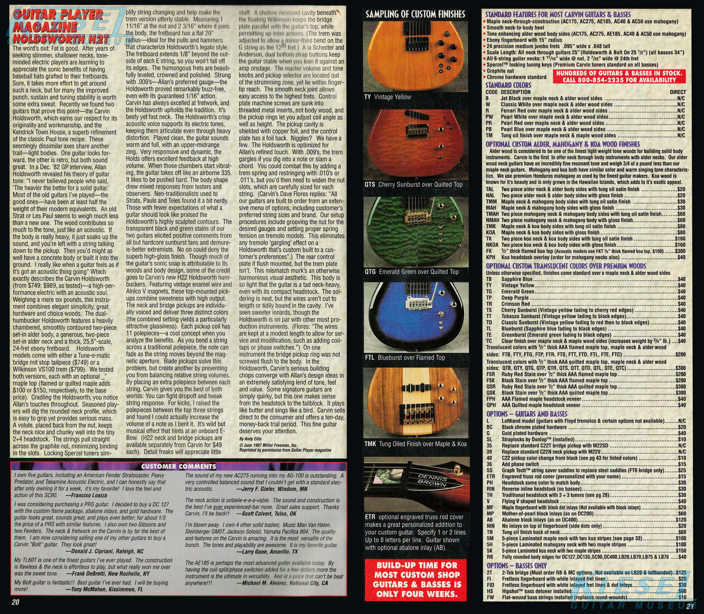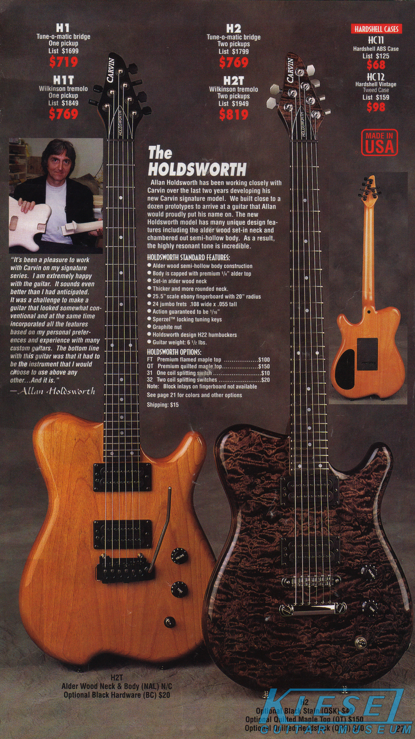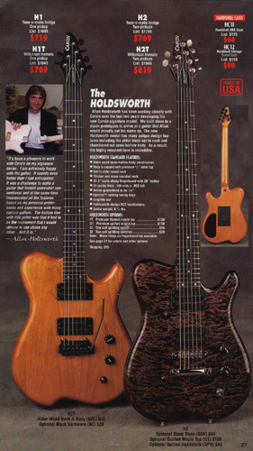 The Holdsworth was unchanged for 1997, but the prices dropped dramatically. Base price on the H1 was $719 (down from $809), or $769 with Wilkinson tremolo, and the H2 was $769 (down from $859), or $819 with Wilkinson tremolo. The Fall catalog showed the H2T in clear gloss on alder with black headstock, black hardware and Wilkinson tremolo, and the H2 in Black Stain on quilted maple with matching headstock and chrome hardware.