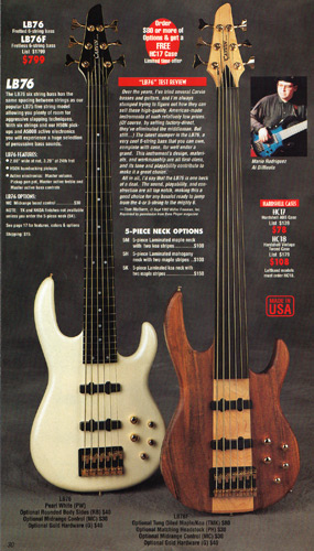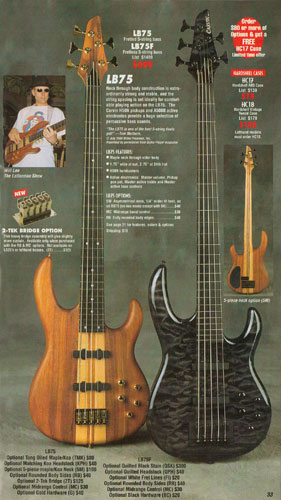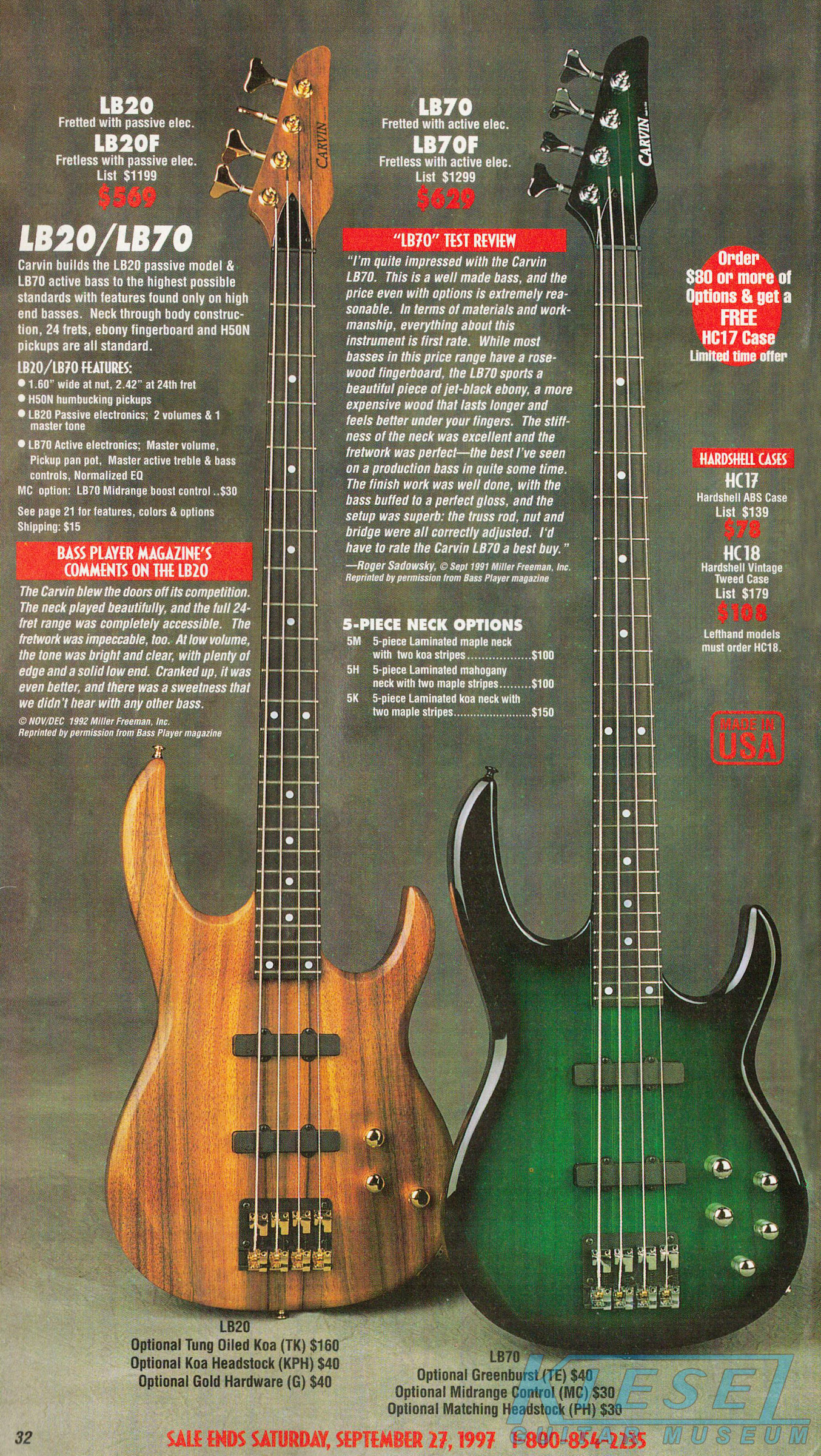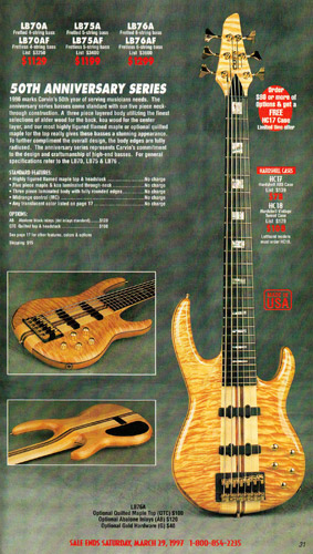 The LB20 and LB70 remained the same as the past four years, and the catalog used the same photos as in the '96 catalog. The base prices of both these models remained the same, at $569 and $629. The HC17 ABS case for either model was $78, and the HC18 vintage tweed hardshell case for either model was $108, although the HC17 was offered for free with $80 in options on any bass.