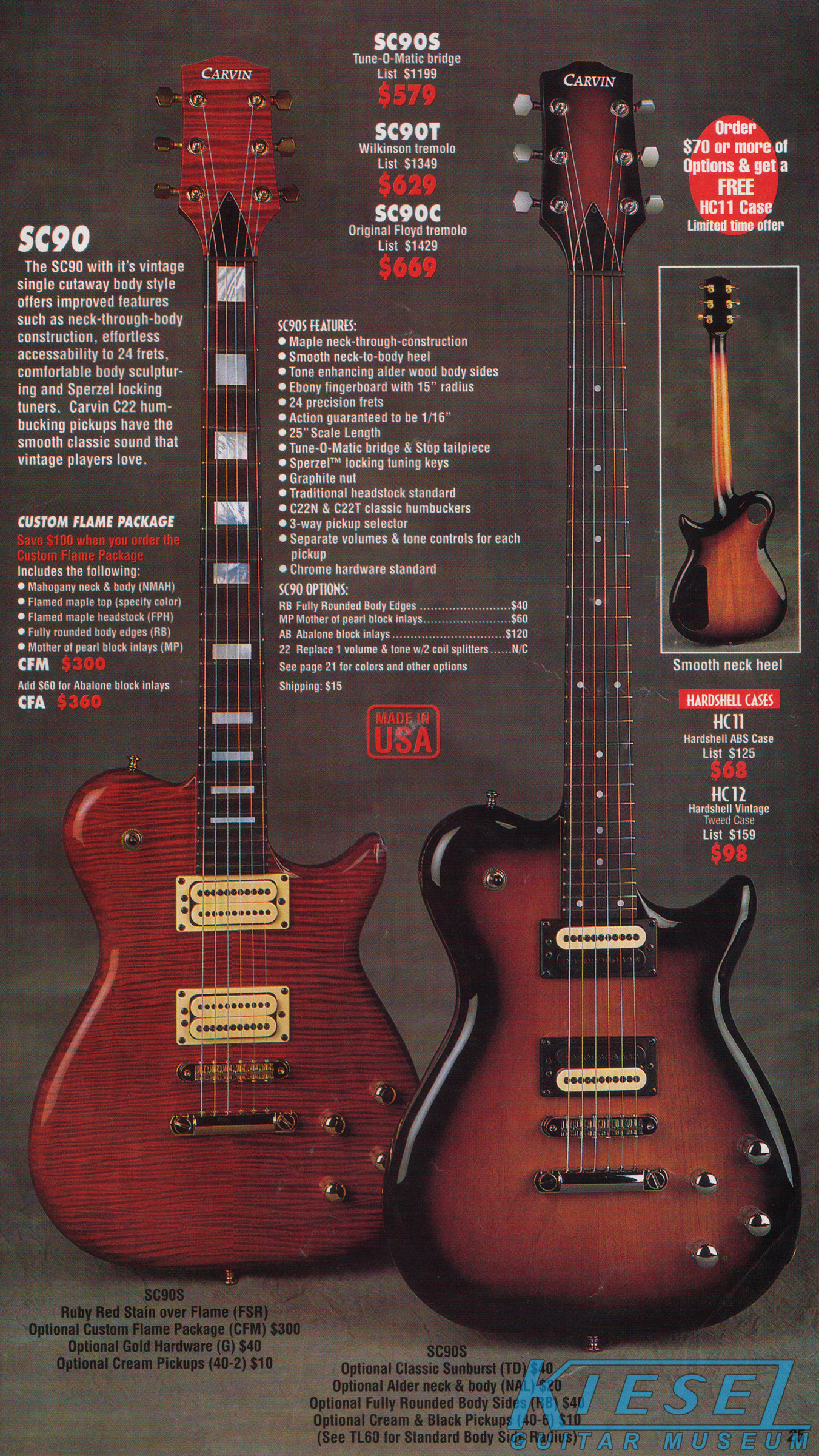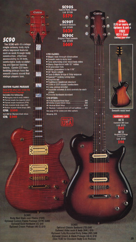 The SC90 got a new tailpiece/bridge assembly in 1997, but was otherwise unchanged. Prices rose slightly on the hardtail model, to $579, while the SC90T with Wilkinson tremolo remained $629, and the SC90C, with Floyd Rose tremolo, remained $669. The new HC11 ABS case was $68, but under the current sale, could be had for free if $70 worth of options were ordered. The HC12 vintage tweed case was $98. A new option package was added in 1997, the Custom Flame Package. This included mahogany neck and body, flamed maple top and matching headstock, rounded body sides and MOP block inlays. This package added $300 to the base price, and could be ordered with abalone block inlays for an additional $60. The catalog showed an SC90 with the Custom Flame Package (Ruby Red Stain), with gold hardware and cream pickups, and an SC90 in classic sunburst with alder neck and body, rounded body sides, cream/black pickups and chrome hardware.