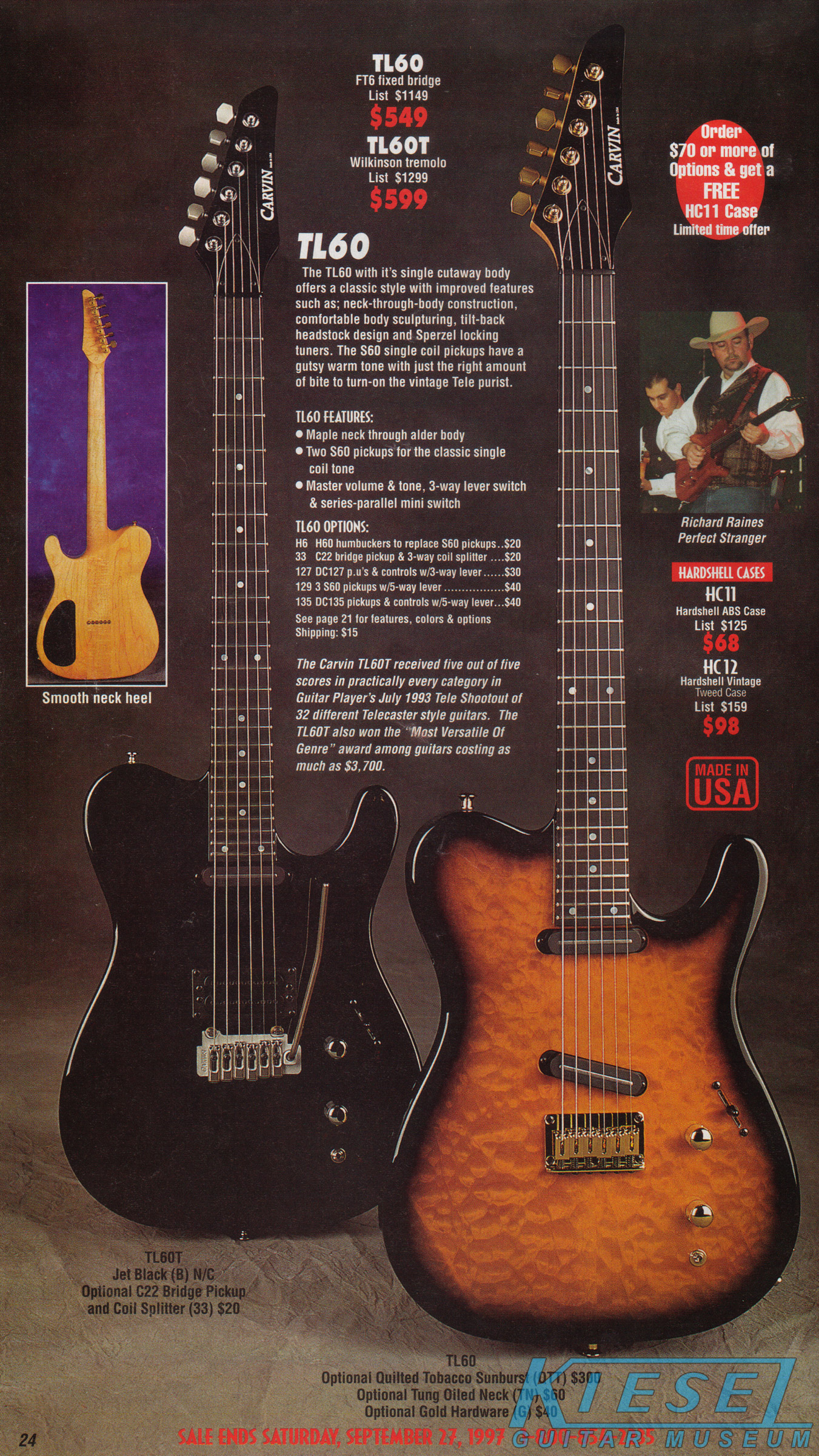 The TL60 was also unchanged for 1997, and the same catalog photo that had been used for several years was used again. Base price increased slightly on the hardtail model to $549, or $599 with Wilkinson tremolo. New optional pickup configurations were added, including DC127-style, DC135-style, and three H60 humbuckers. The Fall catalog photo showed a TL60 in Jet Black with chrome hardware, M22 bridge pickup and Wilkinson tremolo, and in Tobacco Sunburst on quilted maple with gold hardware.