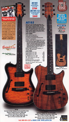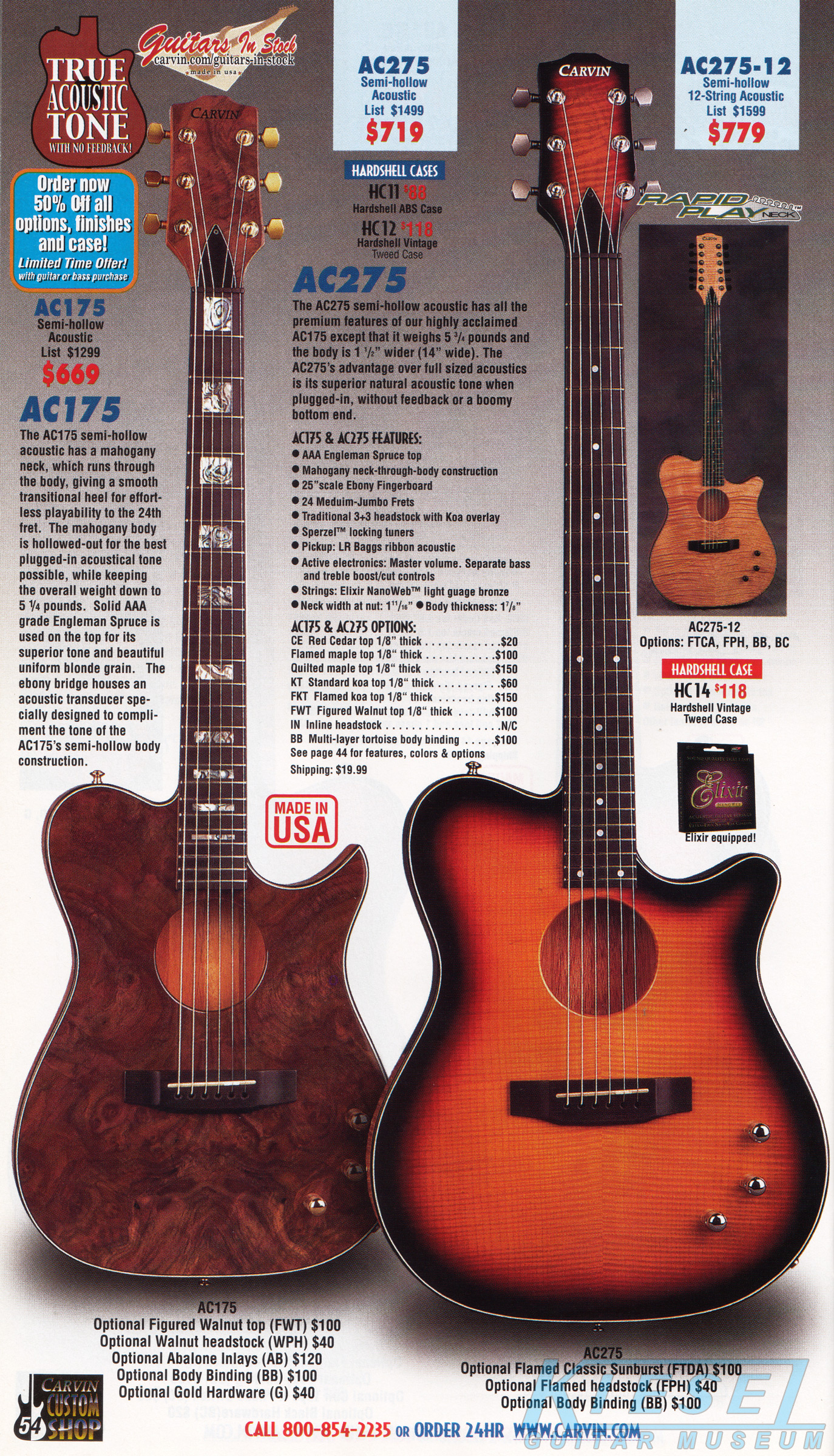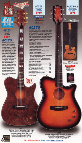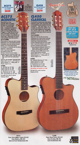 In the semi-hollow/acoustic arena, the AC175 and AC275 remained unchanged, although the prices increased to $669 for the AC175, $719 for the AC275, and $779 for the AC275-12. The same catalog photo was used as in 2000. The AC375 was also unchanged, but it's base price rose to $839, plus $118 for the HC16 hardshell case. The CL450 classical was unchanged from it's introduction in 2000. Base price on the CL450 increased to $879.