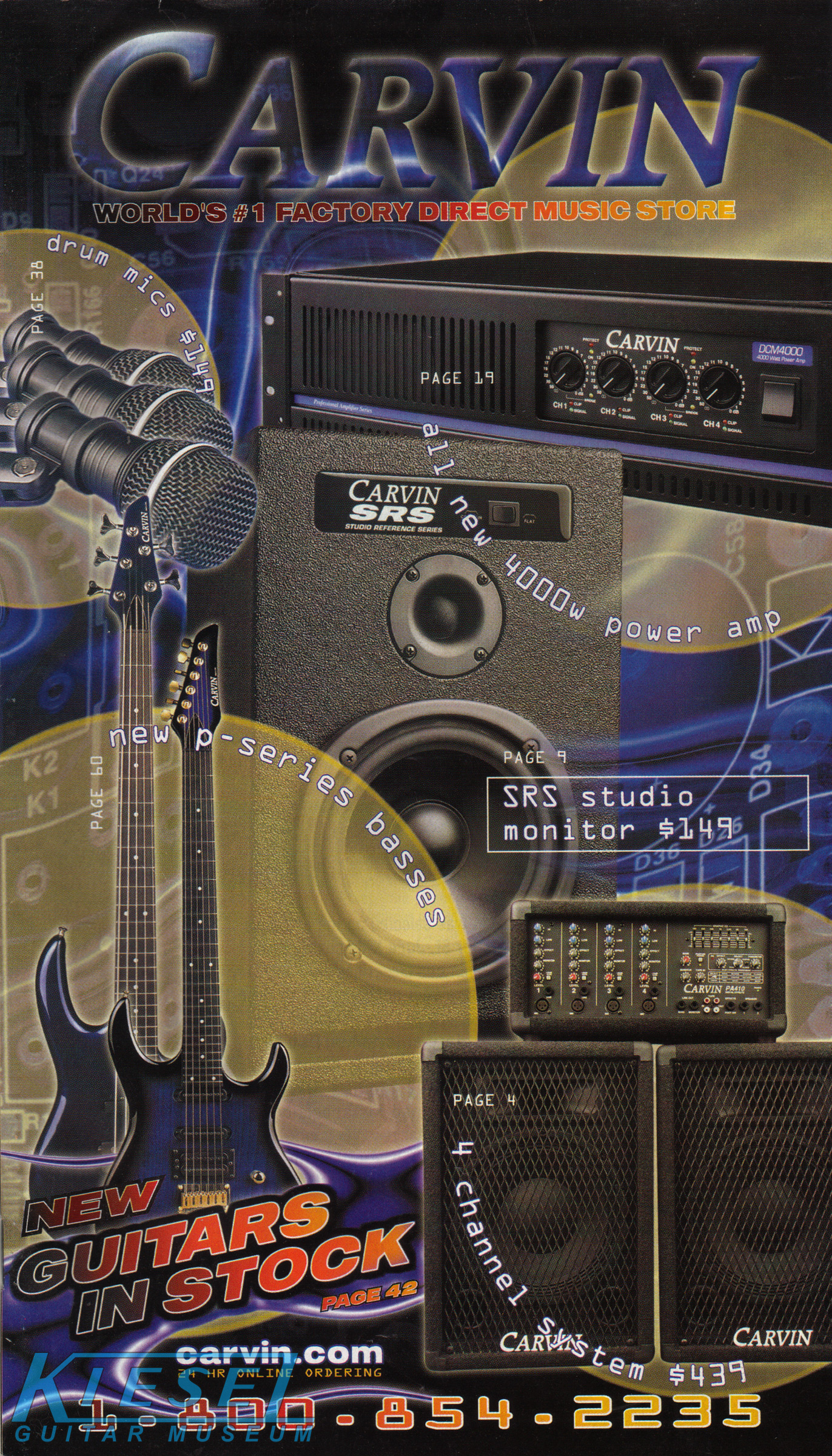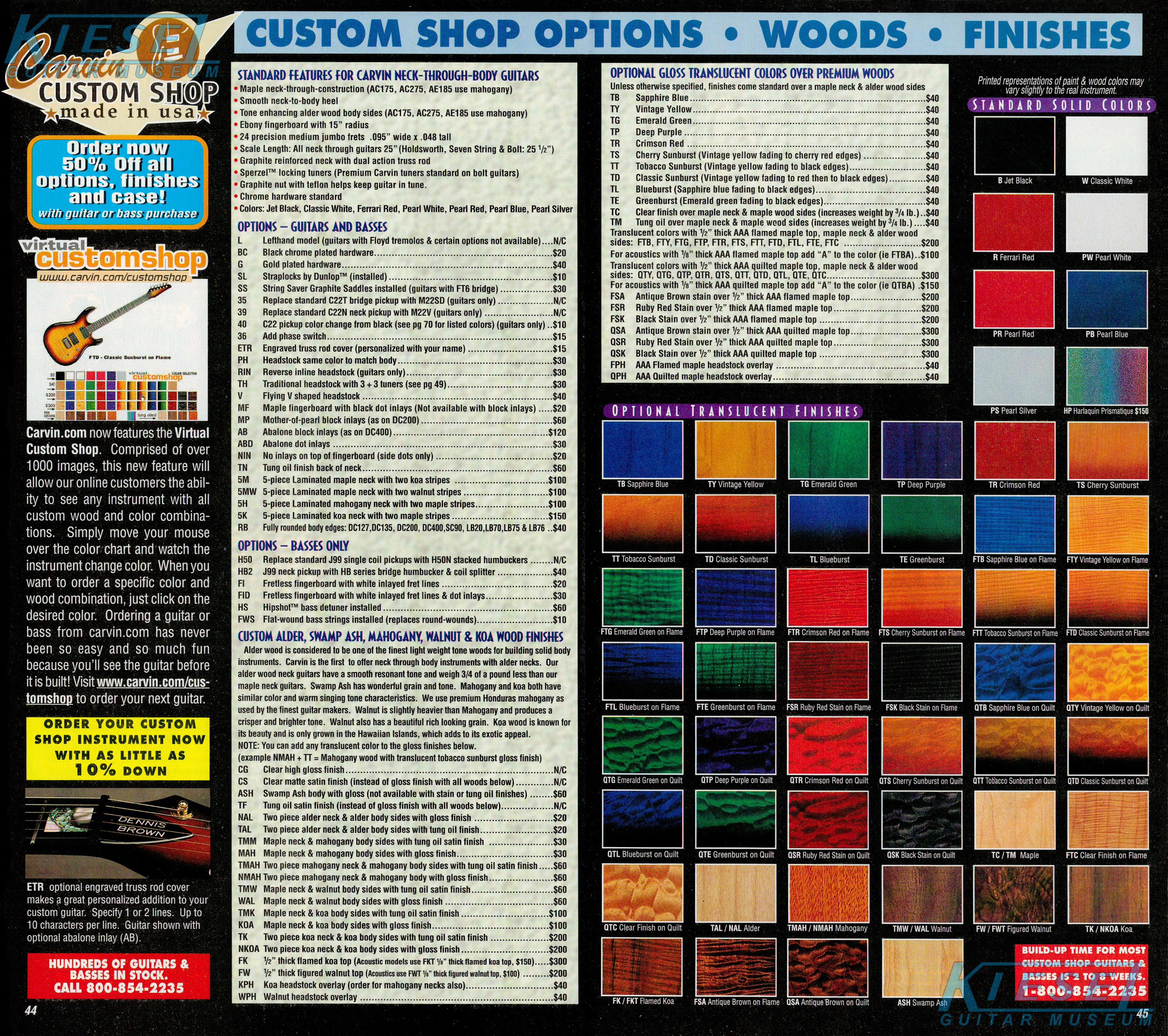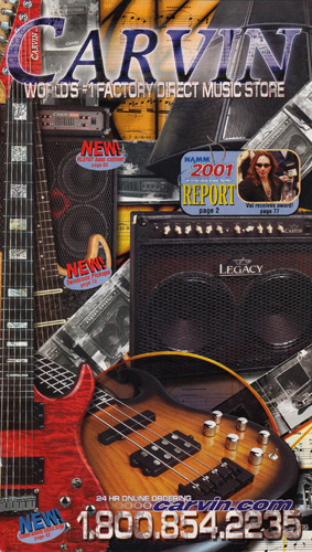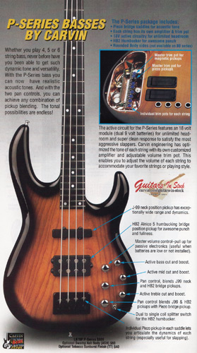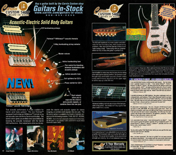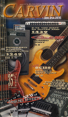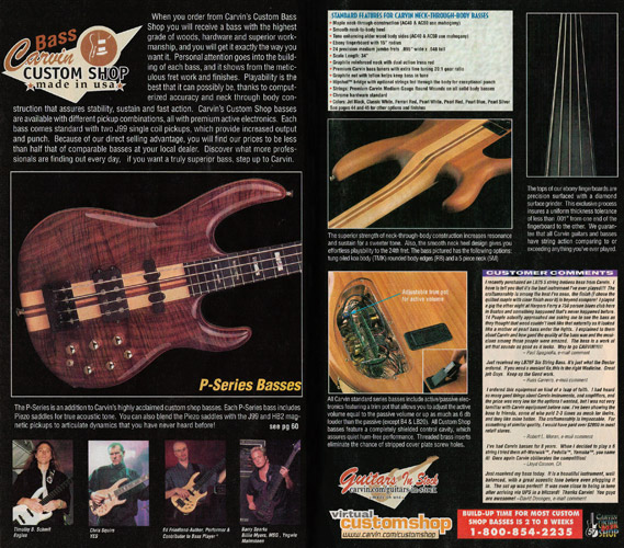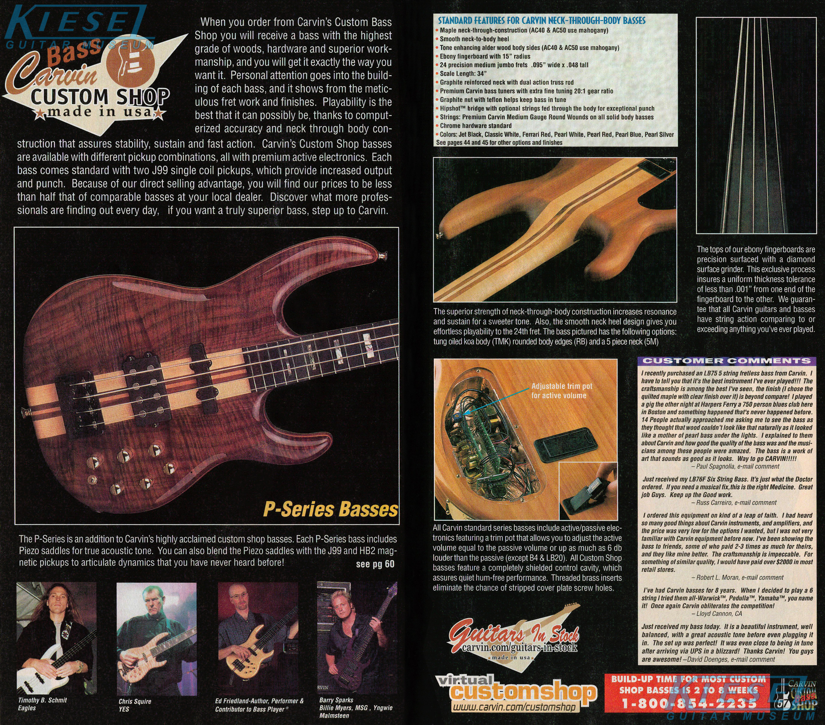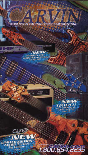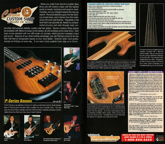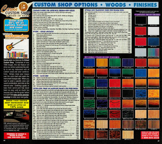 The new P-Series bass upgrade added 18V electronics with a piezo bridge saddles and additional controls, allowing standard electric basses to somewhat emulate the tone of an acoustic bass. The P-Series package included the 18V electronics, piezo bridge, HB2 bridge pickup and rounded body sides. The upgrade was available on all models except for the LB20 and B4/B5 bolt-neck basses. In keeping with the tradition of offering freebies and specials, Carvin offered 50% off all options and cases with any Custom Shop order. Because of this, you could actually get a mid-level LB70 for less in 2002 than you could in 1990 (see the 1990 page), as well as similar deals on other models of guitars and basses.