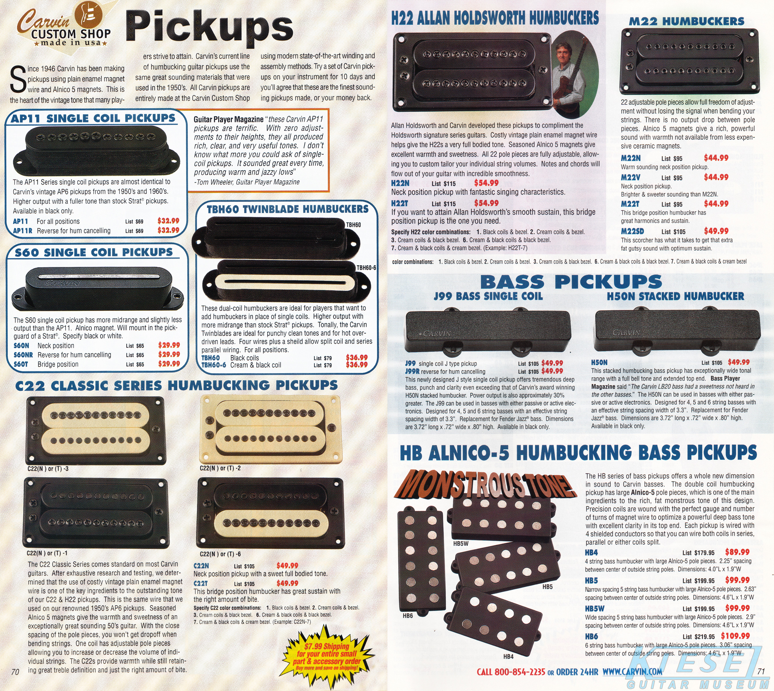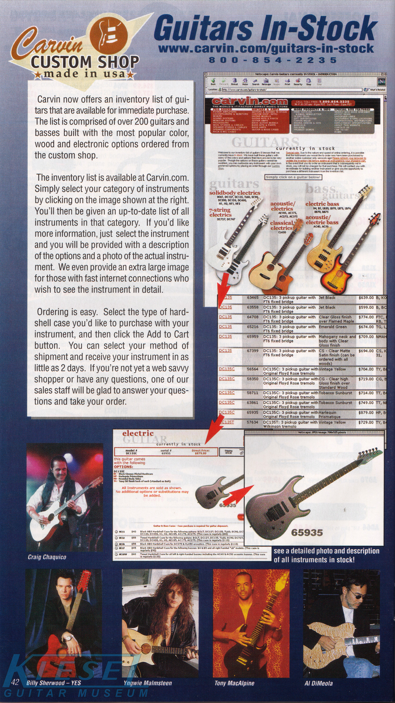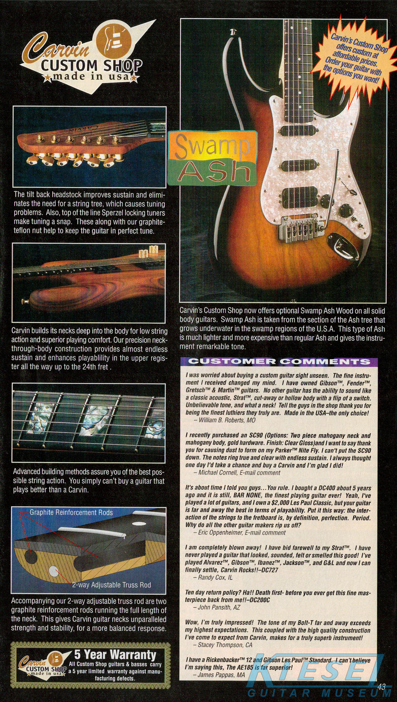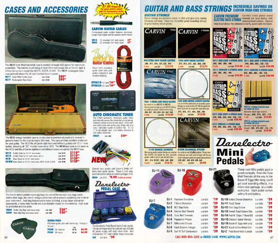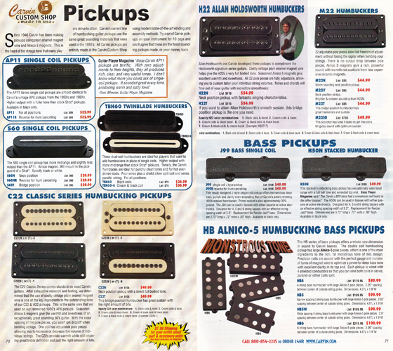 The new P-Series bass upgrade added 18V electronics with a piezo bridge saddles and additional controls, allowing standard electric basses to somewhat emulate the tone of an acoustic bass. The P-Series package included the 18V electronics, piezo bridge, HB2 bridge pickup and rounded body sides. The upgrade was available on all models except for the LB20 and B4/B5 bolt-neck basses. In keeping with the tradition of offering freebies and specials, Carvin offered 50% off all options and cases with any Custom Shop order. Because of this, you could actually get a mid-level LB70 for less in 2002 than you could in 1990 (see the 1990 page), as well as similar deals on other models of guitars and basses.