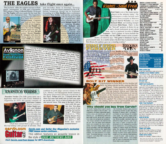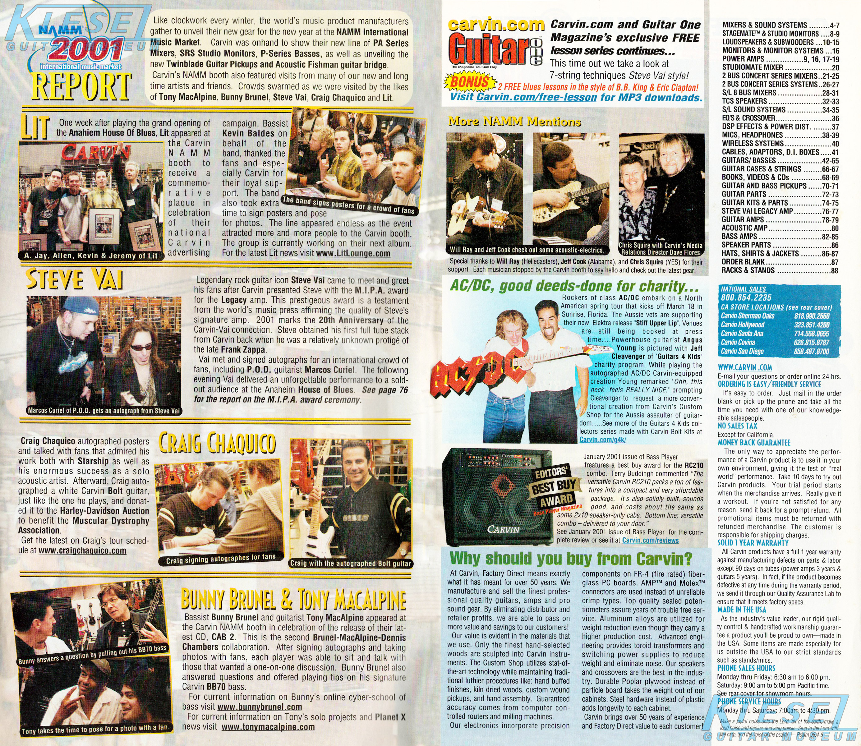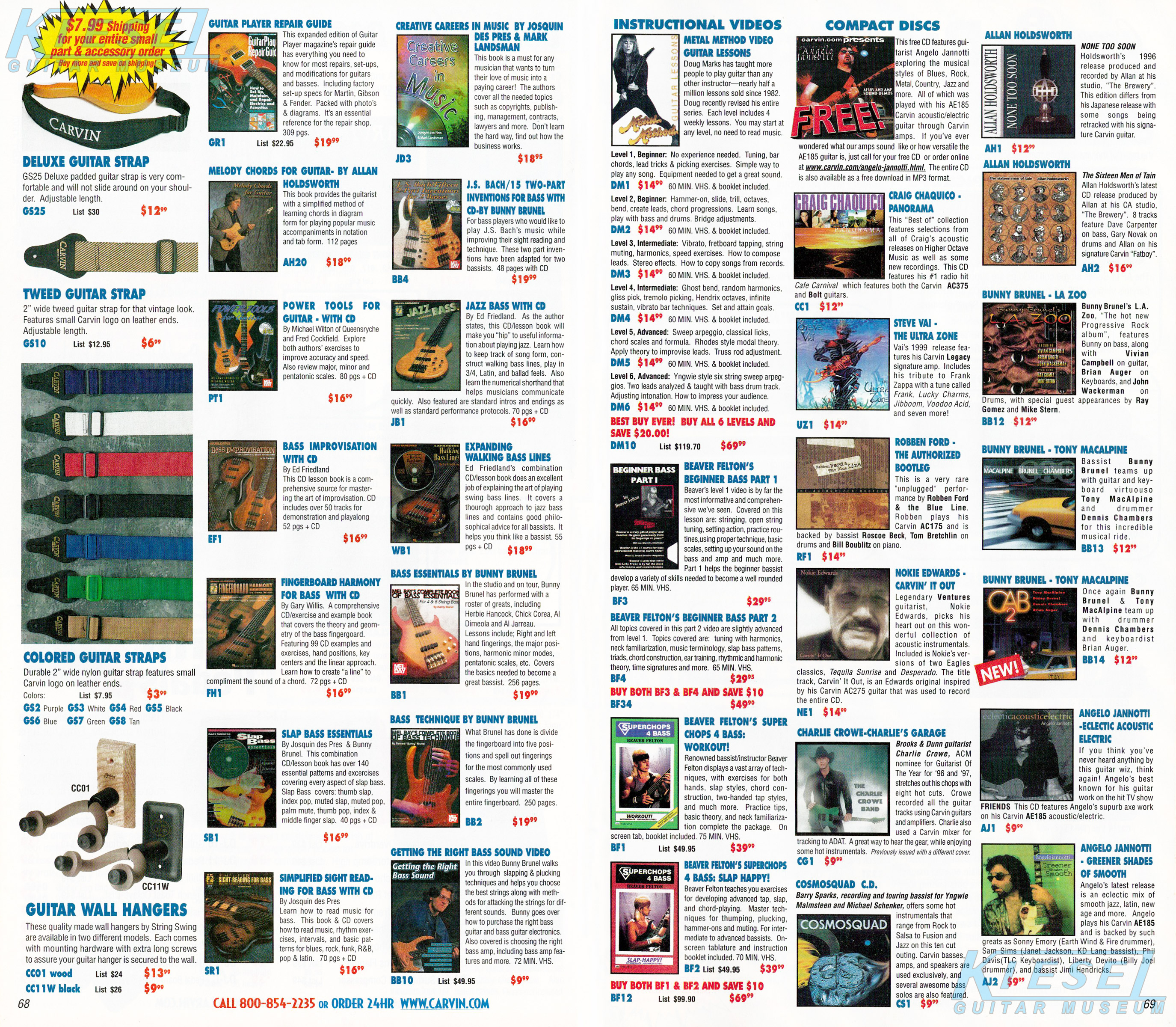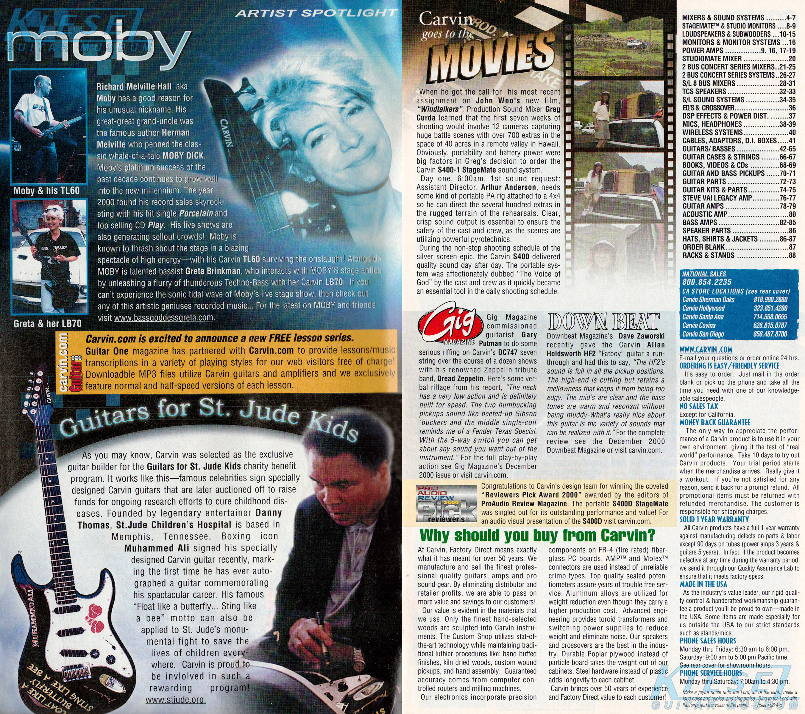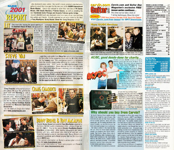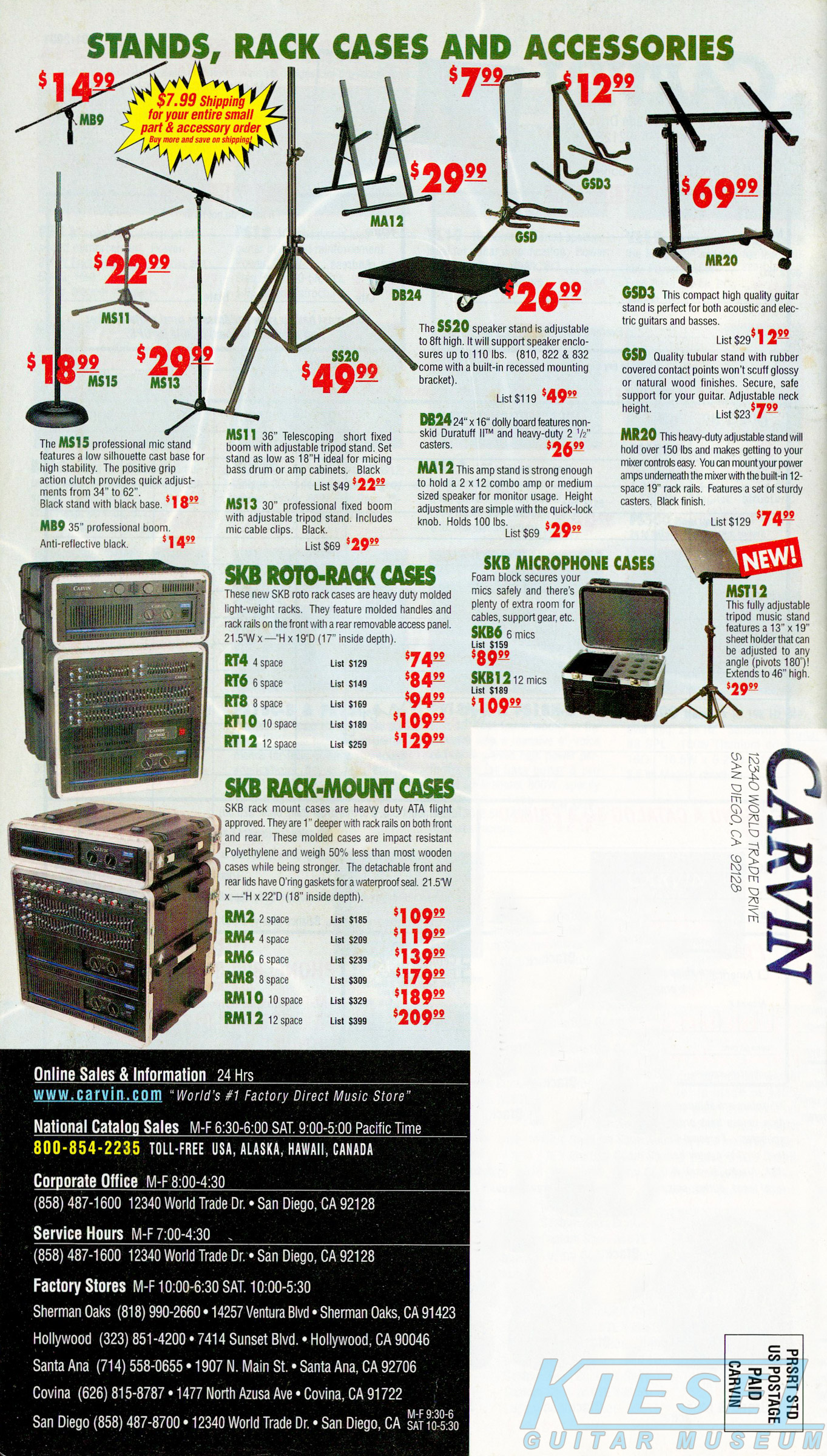 The new P-Series bass upgrade added 18V electronics with a piezo bridge saddles and additional controls, allowing standard electric basses to somewhat emulate the tone of an acoustic bass. The P-Series package included the 18V electronics, piezo bridge, HB2 bridge pickup and rounded body sides. The upgrade was available on all models except for the LB20 and B4/B5 bolt-neck basses. In keeping with the tradition of offering freebies and specials, Carvin offered 50% off all options and cases with any Custom Shop order. Because of this, you could actually get a mid-level LB70 for less in 2002 than you could in 1990 (see the 1990 page), as well as similar deals on other models of guitars and basses.
