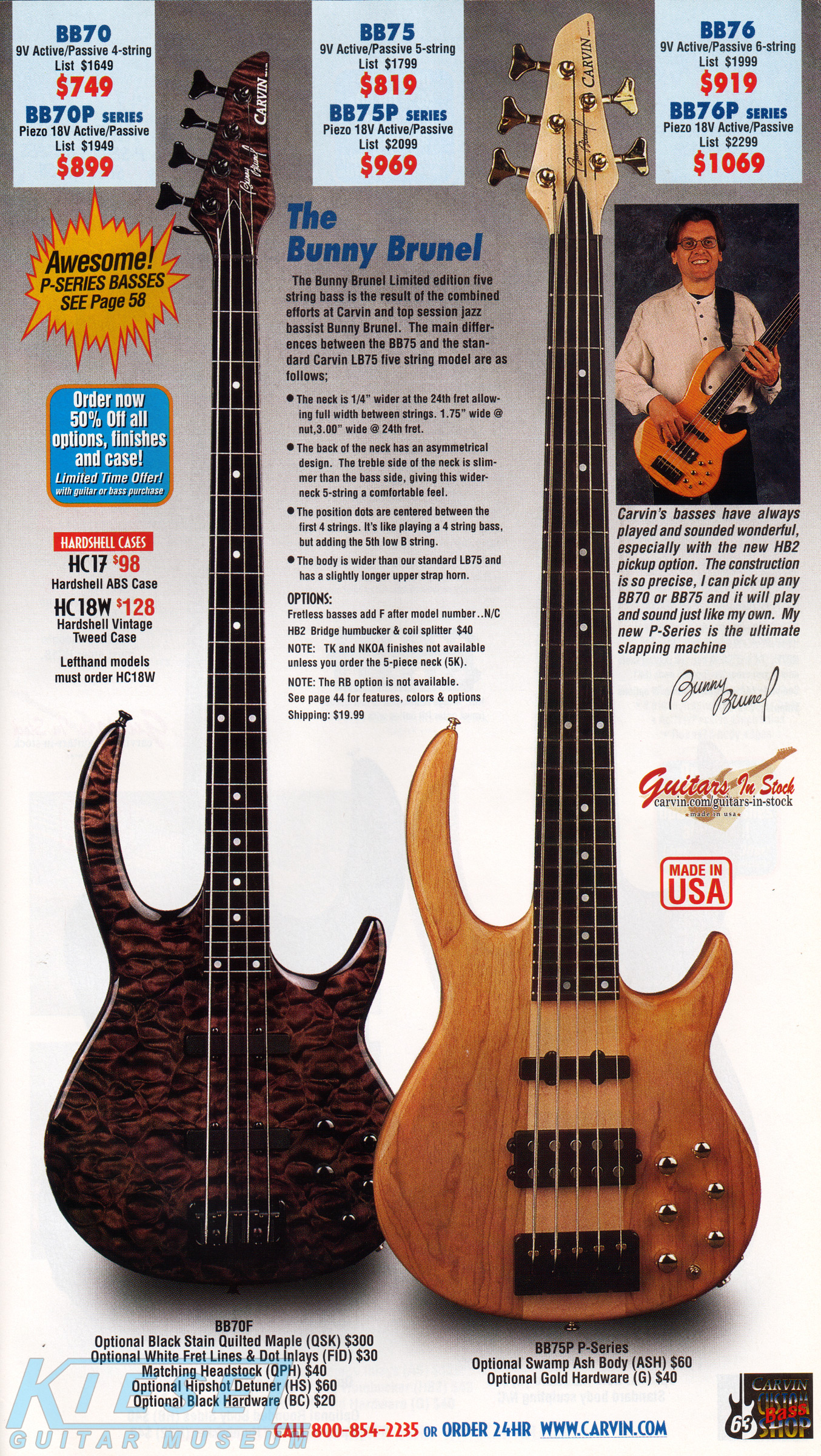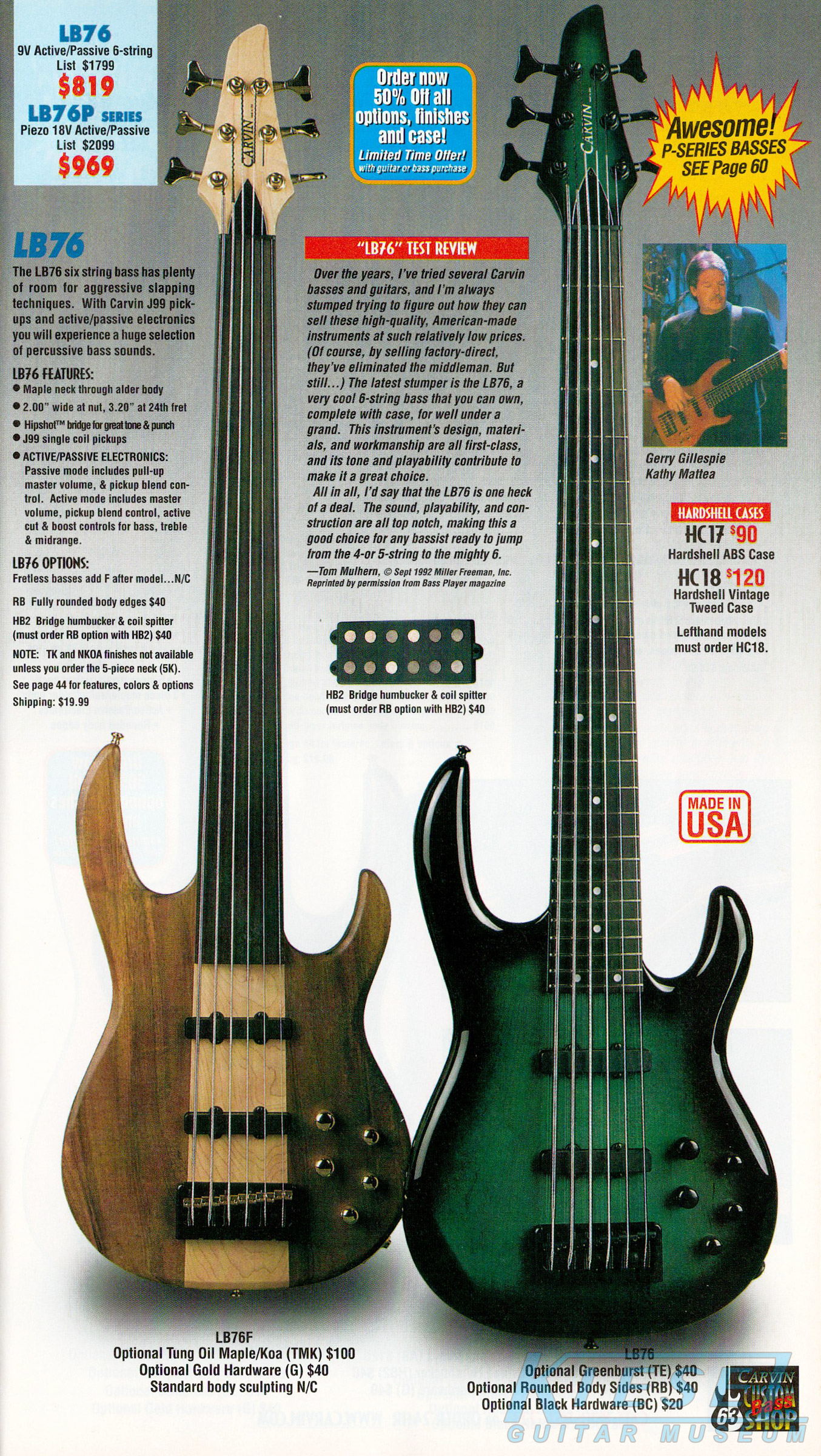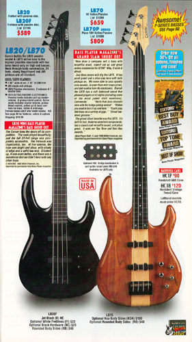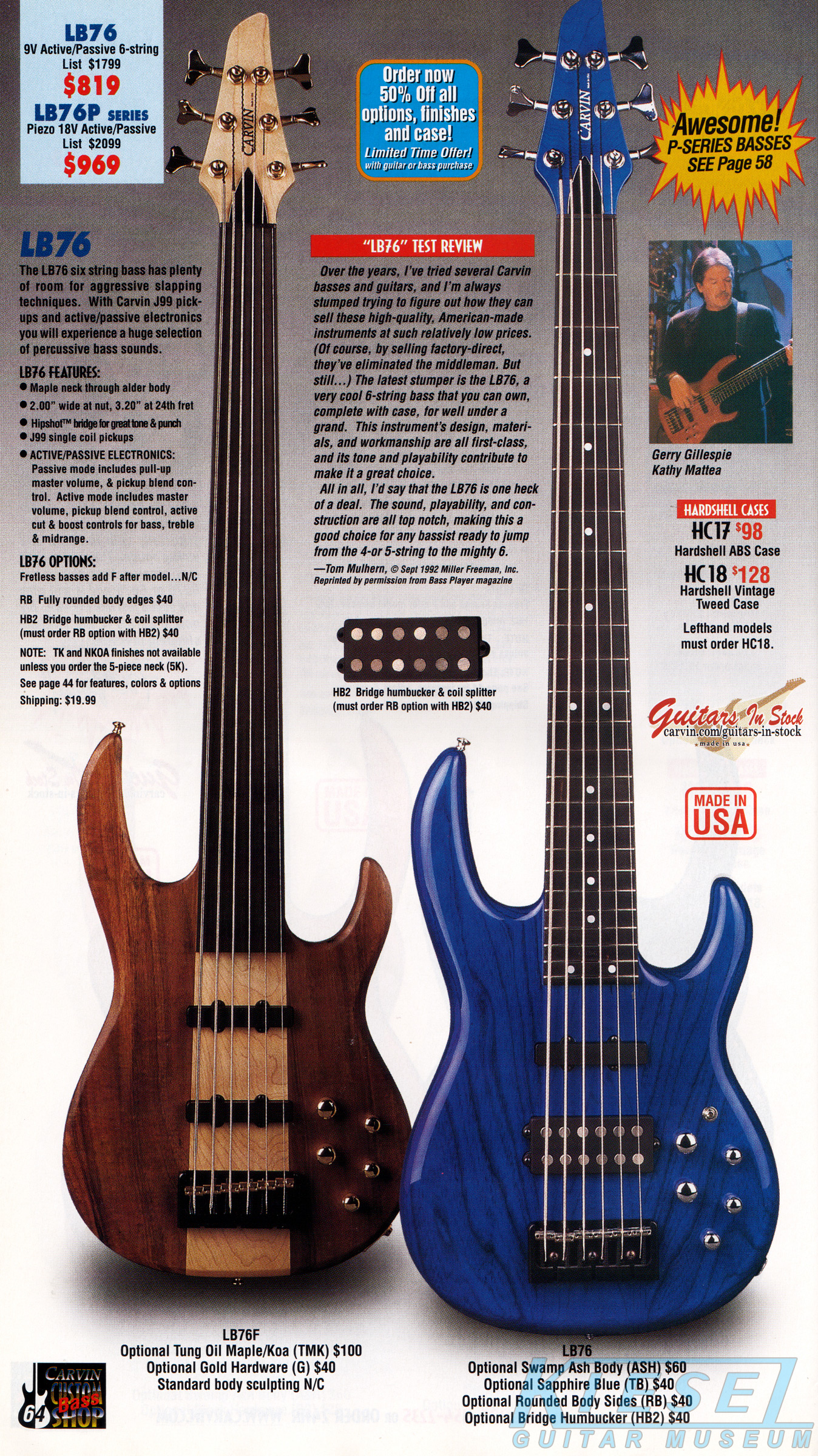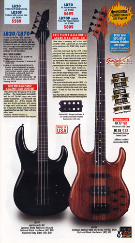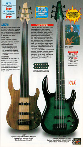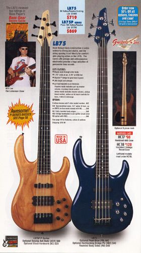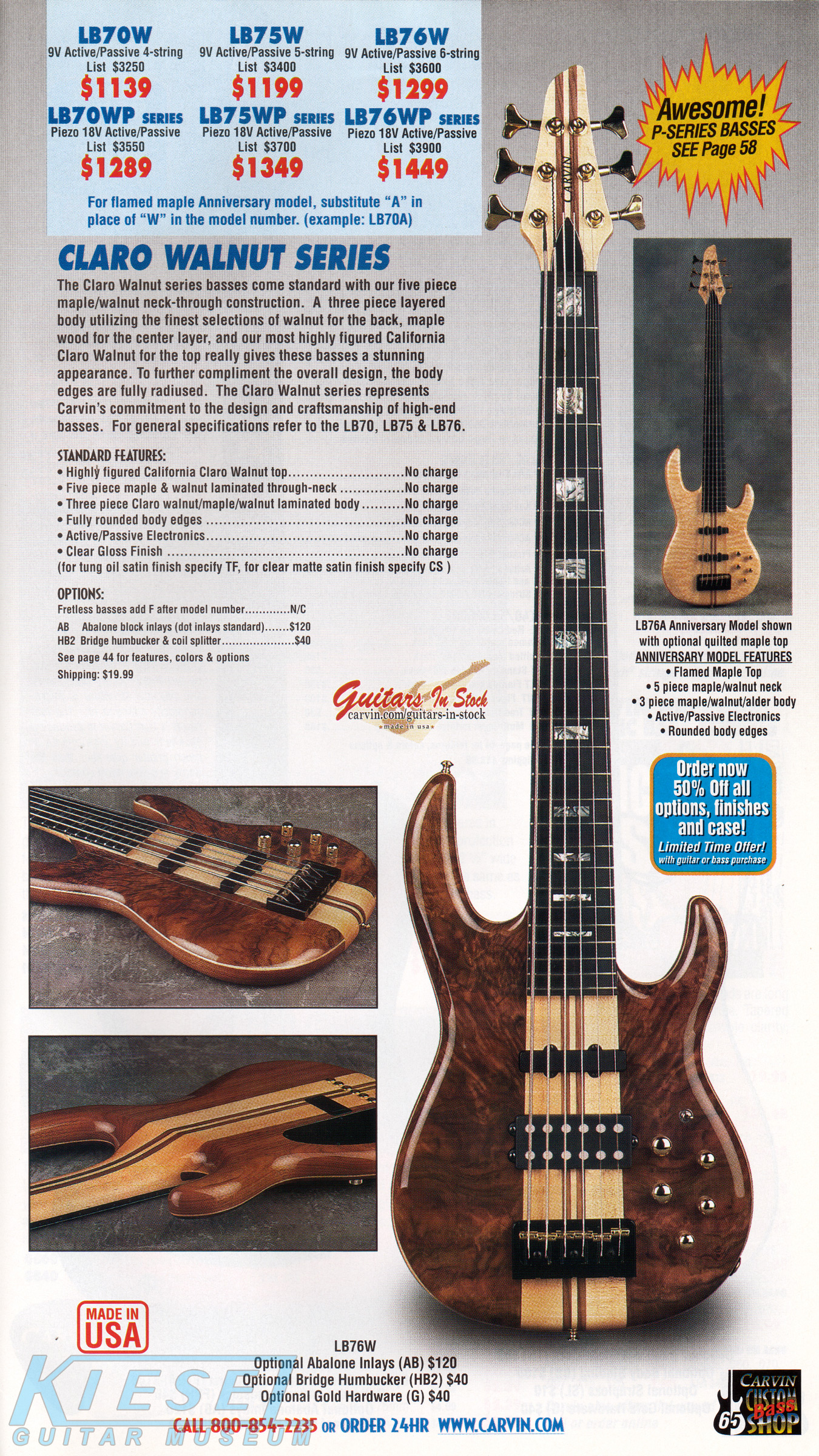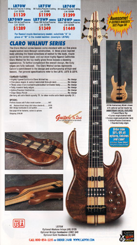 Carvin's LB70, LB75 and LB76 continued to be available in the Claro Walnut Series. The body is constructed from a walnut back, with a thin maple center, and California Claro walnut top, making for a "wood binding" type of effect. Round body edges are standard, as is a 5-piece neck. The new "P" option was available on all of them. The Anniversary Series was similar to the Claro Walnut Series, but with an alder back, walnut center, and highly figured flamed maple top. This model was available in all LB Series basses, and has the same features and functionality as the Claro Walnut Series. The base price on the LB70W/A was $1139, and $1289 for the "P" option. The LB75W/A was $1199, and $1359 for the "P" option, and the LB76W/A was $1299, or $1449 for the "P" option.