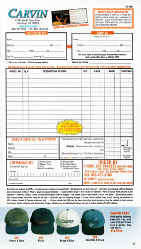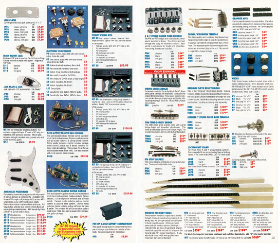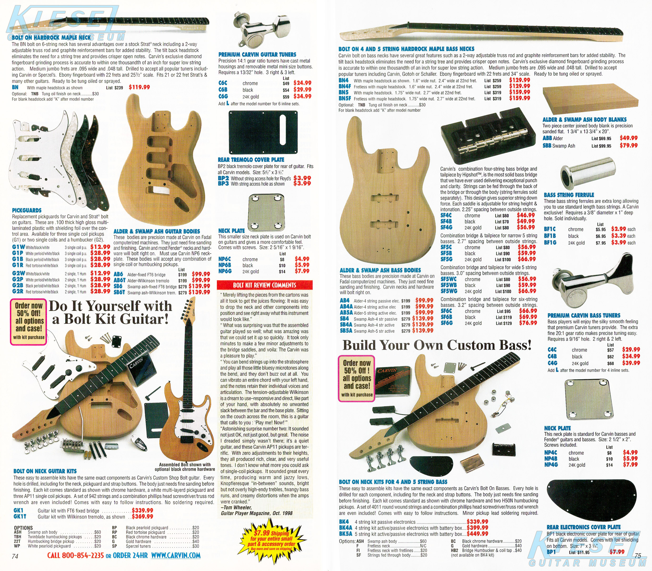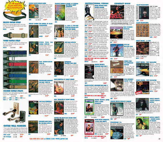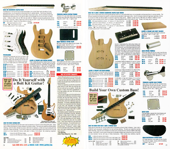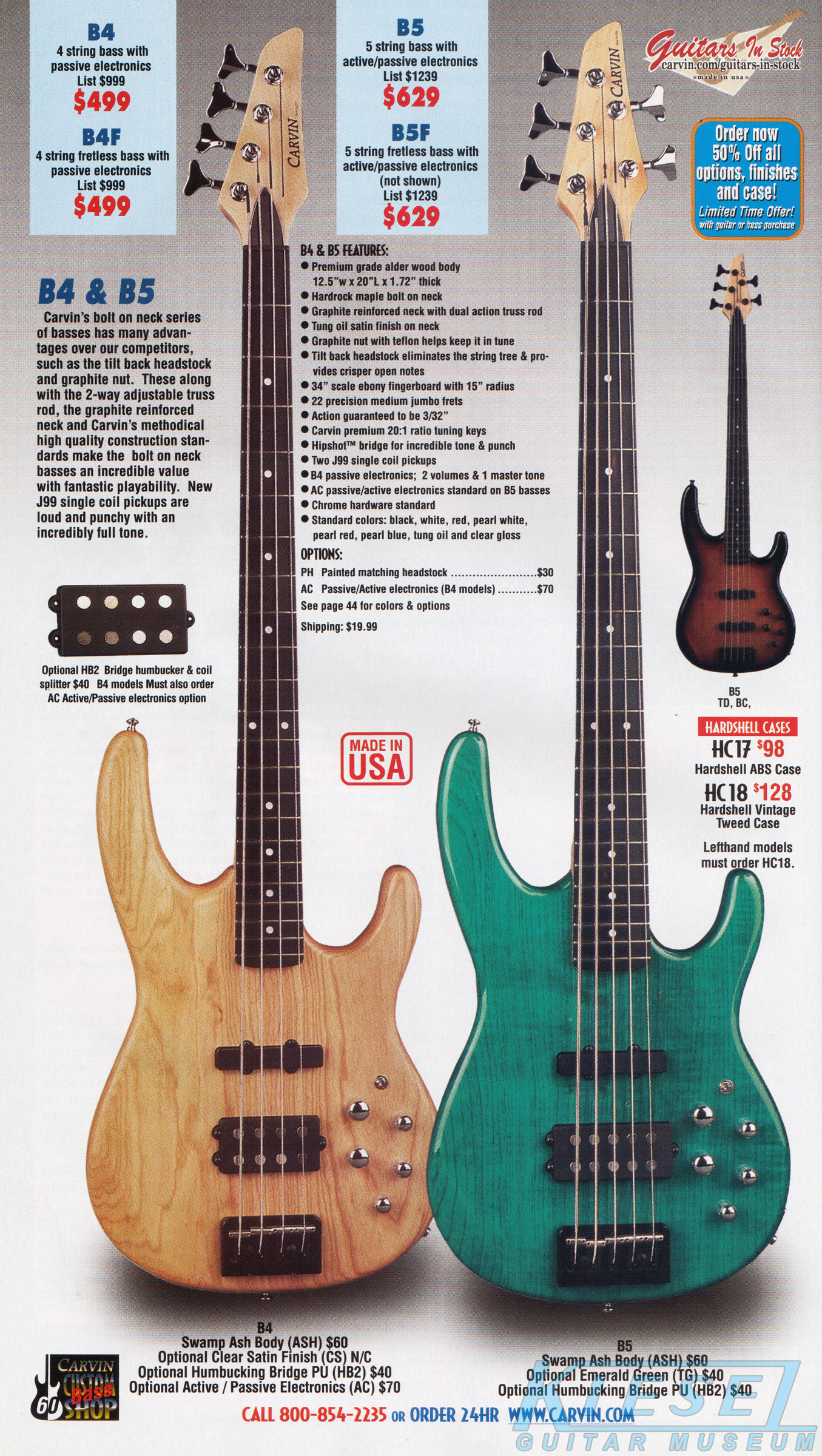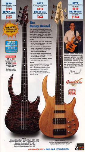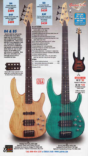 Carvin's Bolt B4 and B5 basses continued to go strong, and provided a high quality, USA-made, entry-level bass at a great price. And like Carvin's top of the line basses, these were available in over 50 different combinations of colors and woods, unlike pretty much any other bass on the market, where 4 or 5 color/wood choices are the norm. Combined with the various electronic, hardware, fretless, headstock and other options, there were hundreds of different combinations possible. The B4 was priced at $499, and the B5 was priced at $629.
