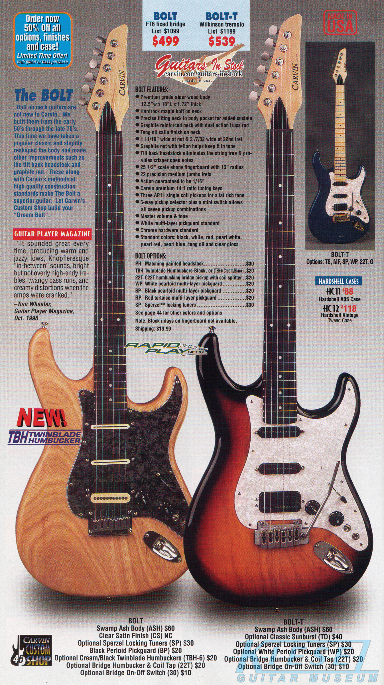 The popular Bolt was unchanged, and used the same photos from 1999, laid onto the new background. The price increased slightly, to $499 for the hardtail model, but dropped slightly to $539 for the Bolt-T, with Wilkinson tremolo.
