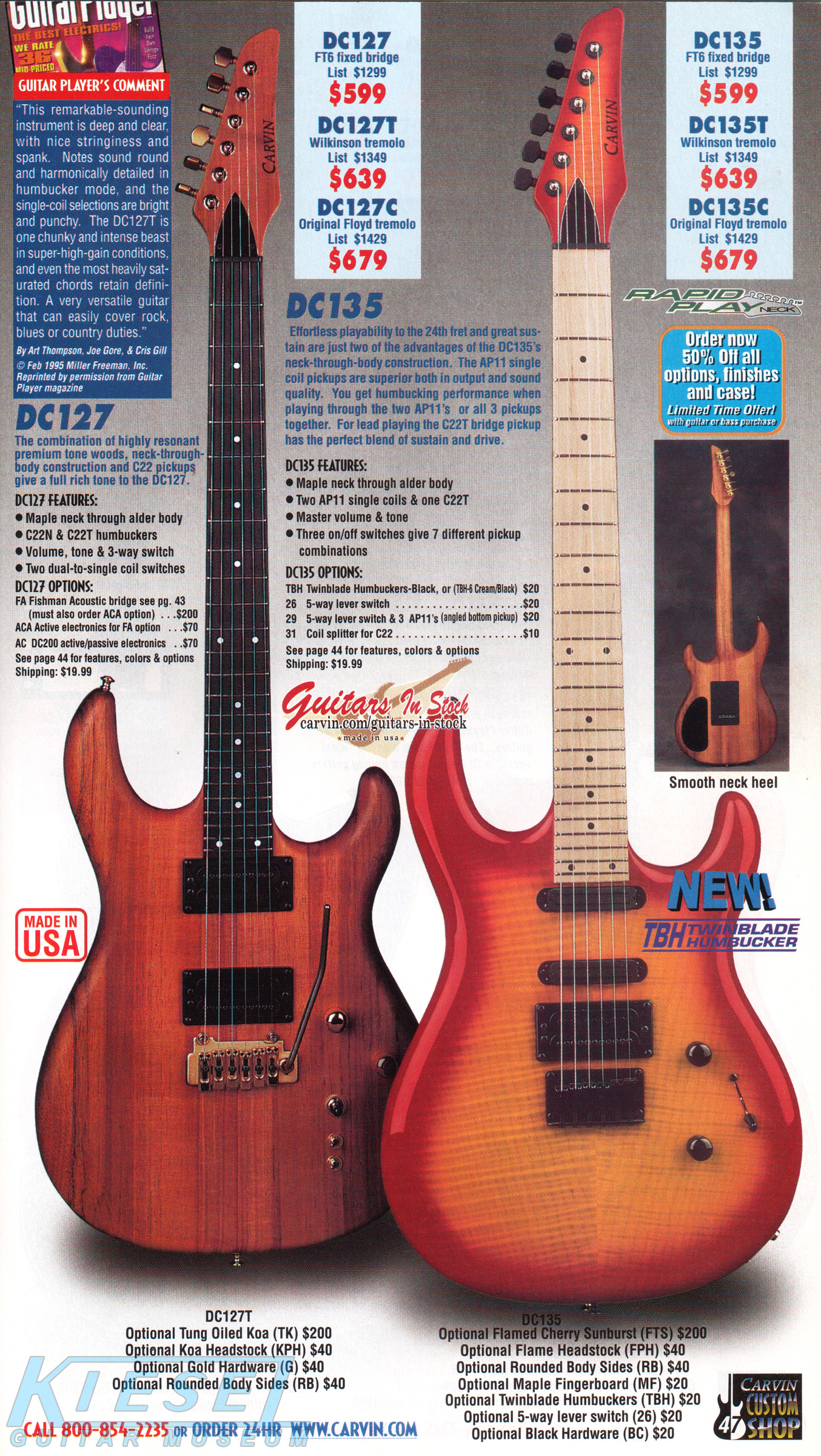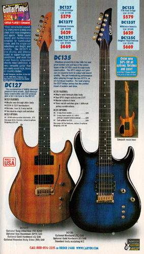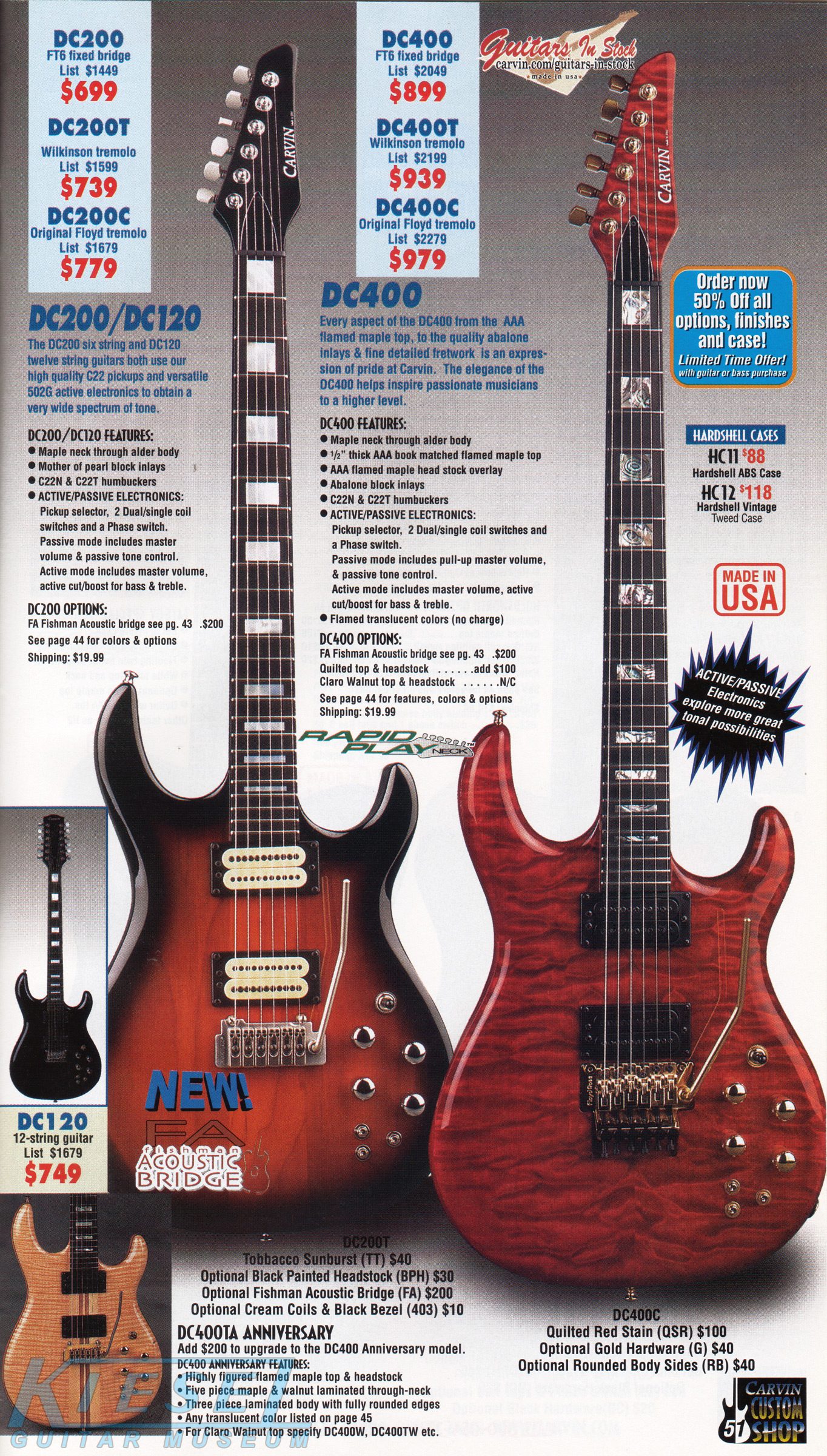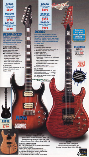 The DC200 and DC400 were unchanged, but got new catalog photos, once again showing the DC200, and relegating the DC120 12-string to an inset photo. The DC200 rose slightly, to a base price of $699, and the DC400 dropped, to a base price of $899. The Wilkinson and Floyd Rose equipped models dropped slightly on both models. The DC120 remained $749. The DC400 Anniversary model, which was a highly upgraded DC400, with 5-piece maple/koa neck, flamed maple top and matching headstock, and 3 piece alder/koa/flamed maple (or Claro Walnut) body was still available as a $200 upgrade to the DC400, DC400T or DC400C.