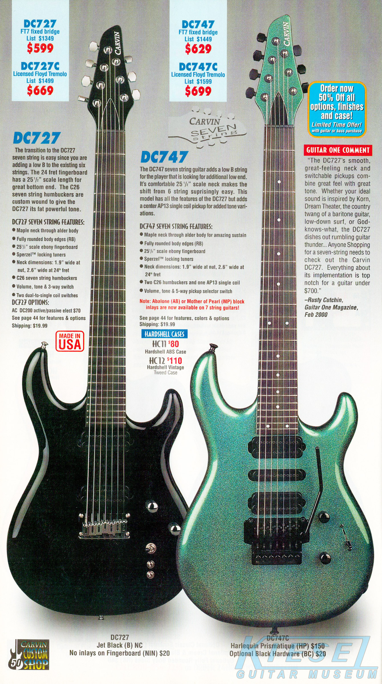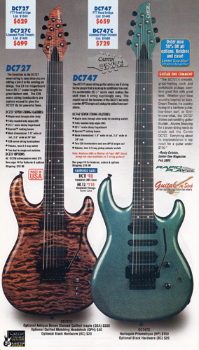The 7-string DC727 and DC747 guitars were unchanged for 2001. The prices remained the same at $629 for the DC727, and dropped to $659 for the DC747.