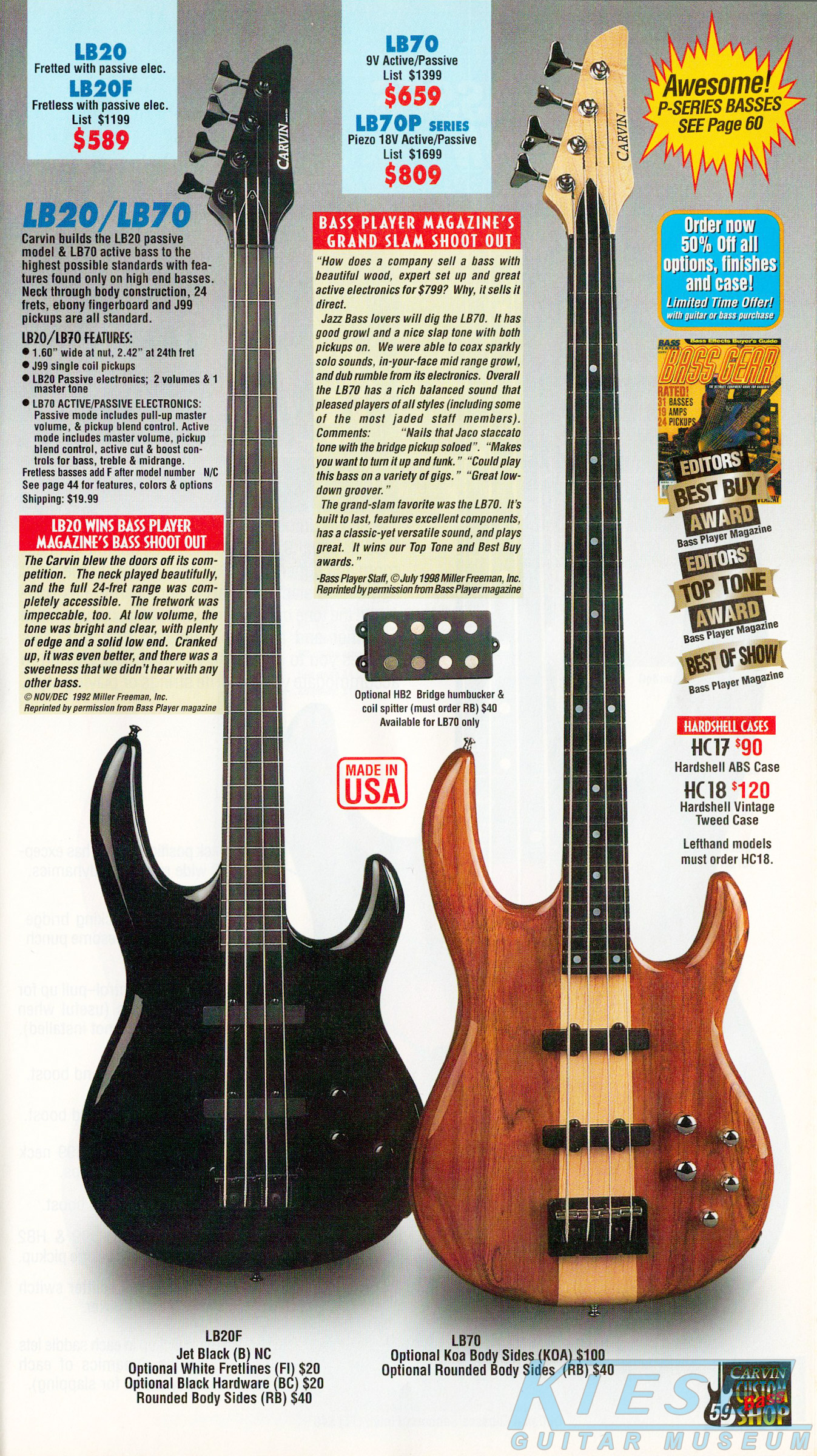 The passive LB20 and active LB70, Carvin's mainstay four-stringers, remained the same in 2001. These also featured the many finish, wood, electronic and other options as the rest of the line, and the LB70 was also available with the "P" option, that included piezo pickups on the bridge saddles, rounded body sides, and 18V active electronics with an HB2 Alnico and J99 pickups. The LB20 was priced at $589, and the LB70 was priced at $659. The LB70P was priced at $809. Like the other models from 2001, the LB75 and LB76 remained unchanged, and were available with the "P" option, as well as all the combinations of colors, woods, etc.