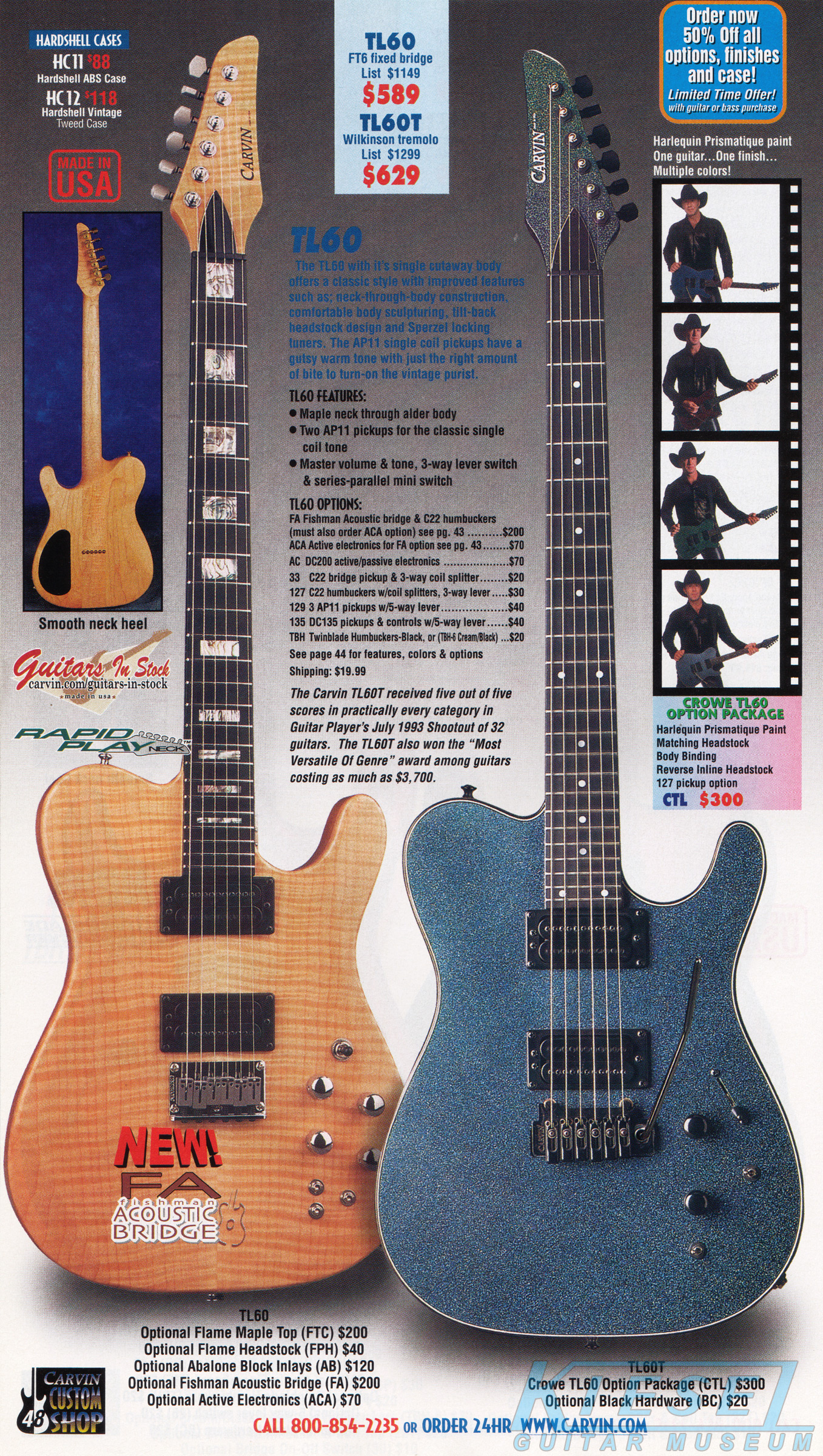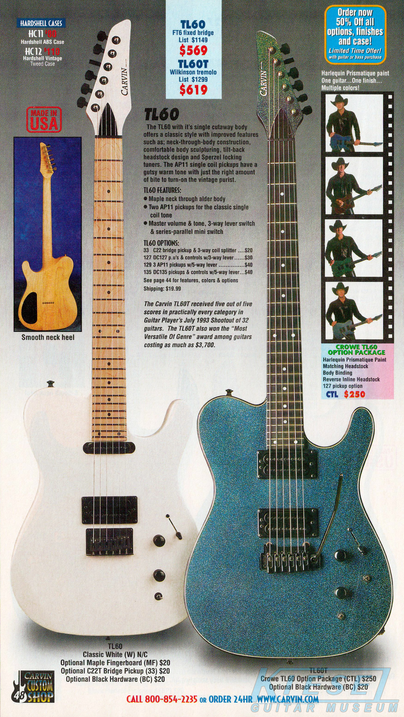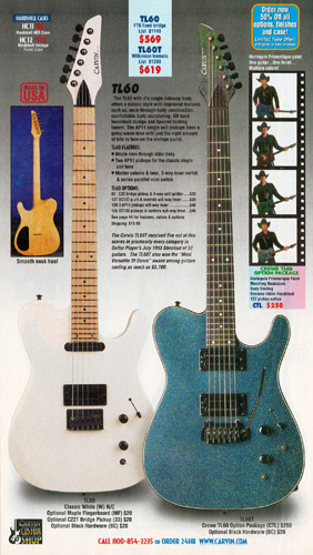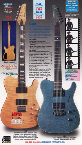 The TL60 rose slightly in price, to $589 for the hardtail model, and $629 for the TL60T with Wilkinson tremolo. The Charlie Crowe Option Package, which included Harlequin Prismatique finish, body binding, reverse matching headstock and dual humbuckers rose to an additional $300 over the base TL60 price.