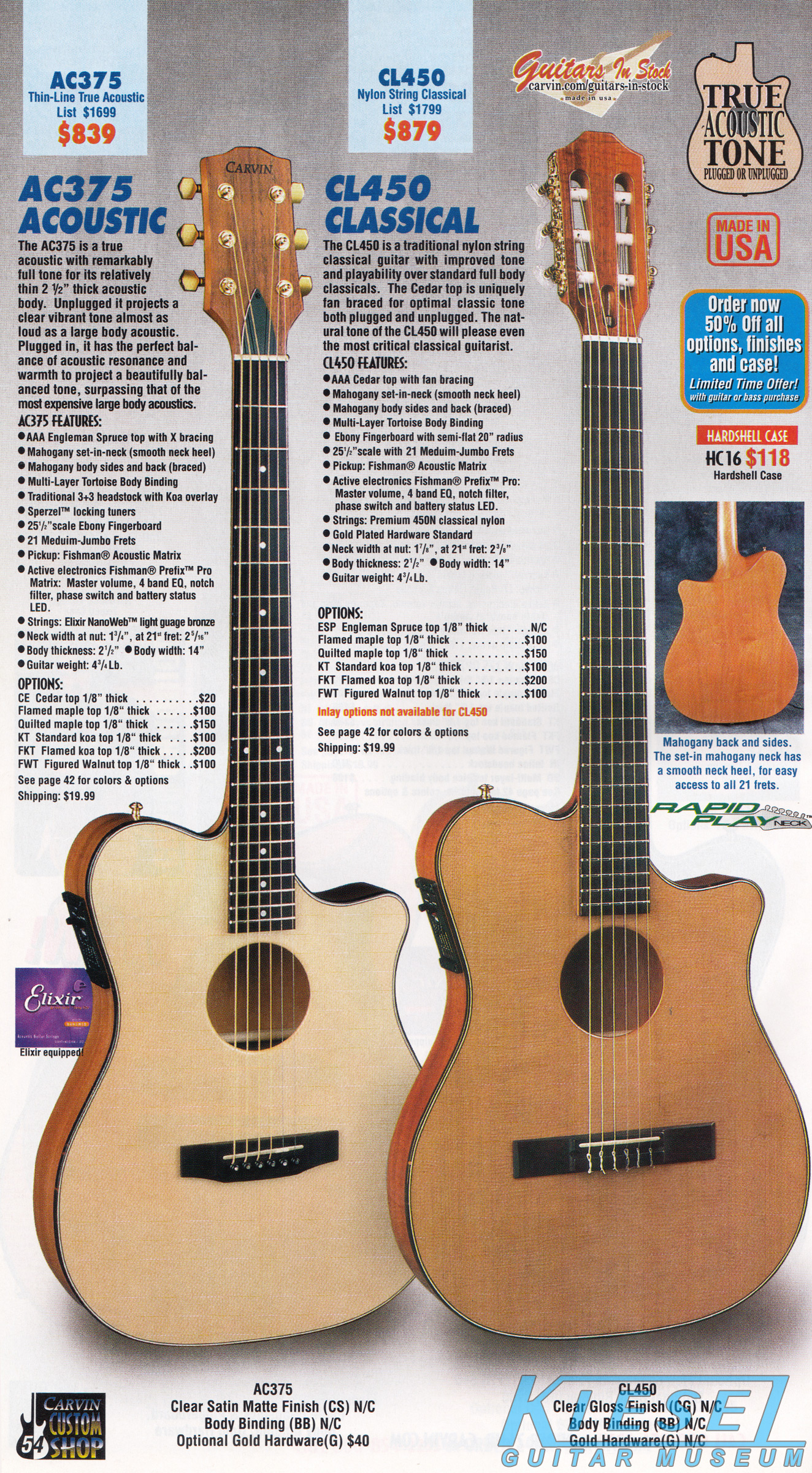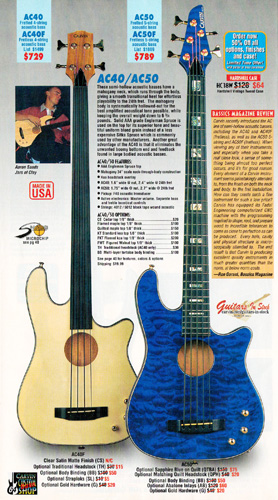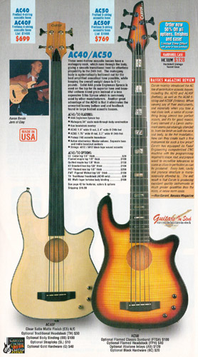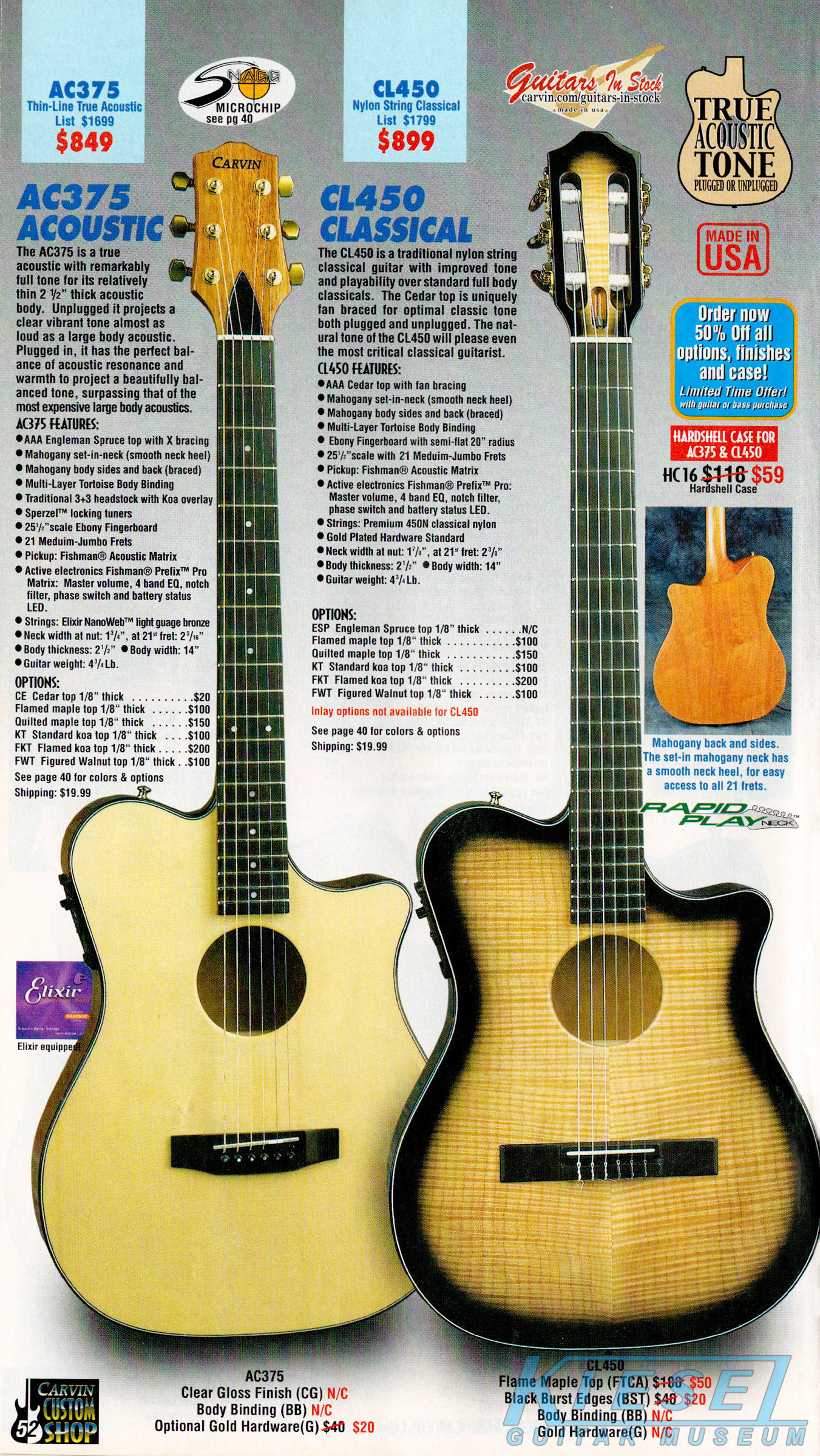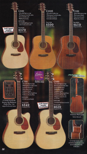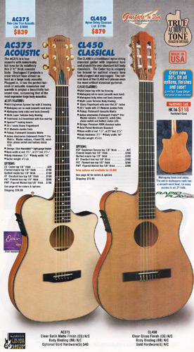 The AC375 true acoustic and the CL450 nylon string classical were unchanged, and the base prices remained the same as 2001. The catalog showed the AC375 in clear matte sating finish with koa headstock overlay and gold hardware, and the CL450 in clear gloss on red cedar.