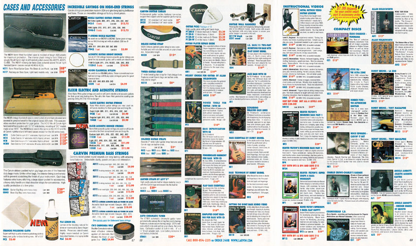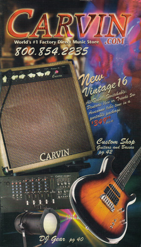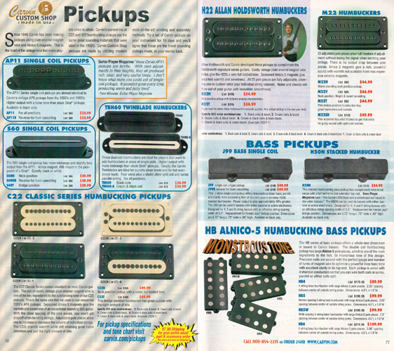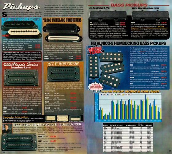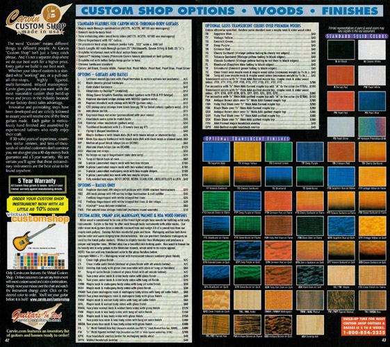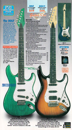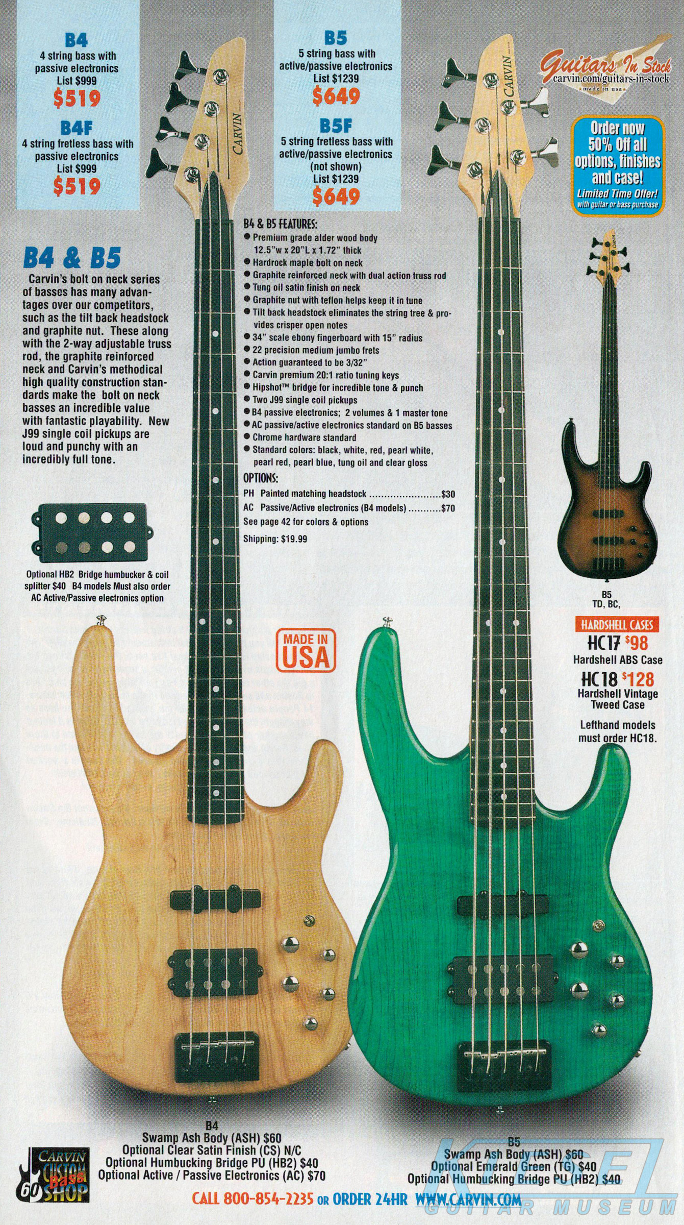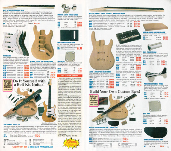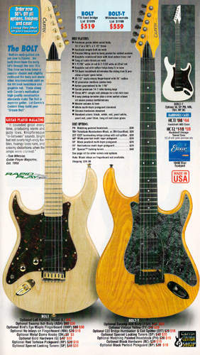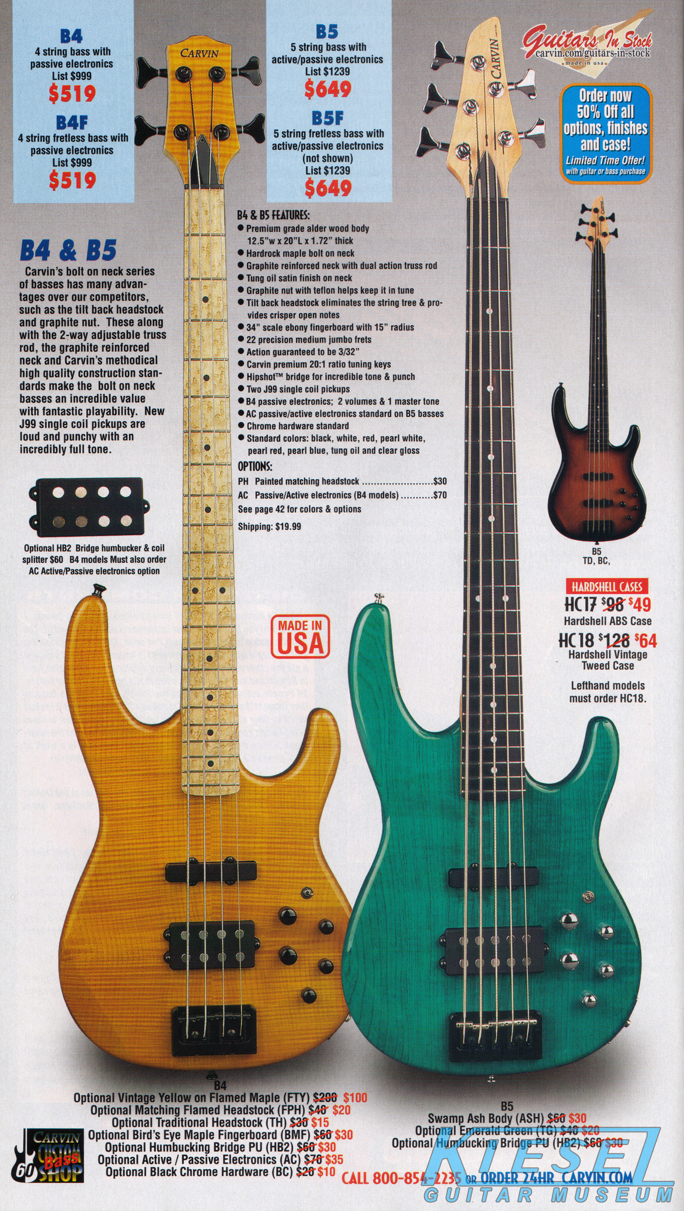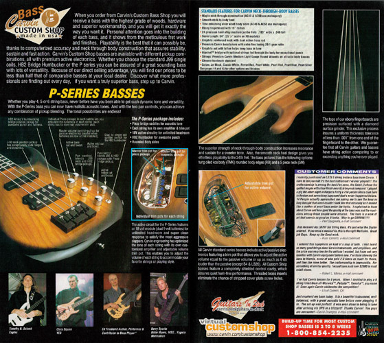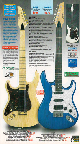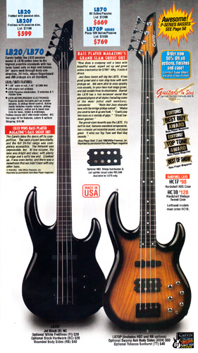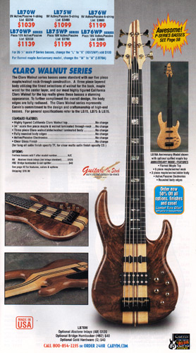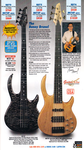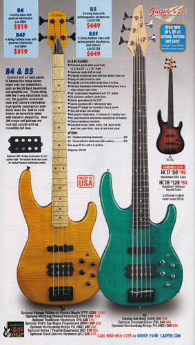 Carvin's bolt-neck B4 and B5 continued to go strong, and provided a high quality, USA-made, entry-level bass at a great price. Like Carvin's top of the line basses, these were available in over 50 different combinations of colors and woods. The B4 was priced at $519, and the B5 was priced at $649. The catalog showed the B4 in Vintage Yellow on flamed maple with matching traditional headstock, Birdseye maple fingerboard, HB pickup with active electronics and black hardware. The B5 was shown in Emerald Green on swamp ash with HB bridge pickup.
