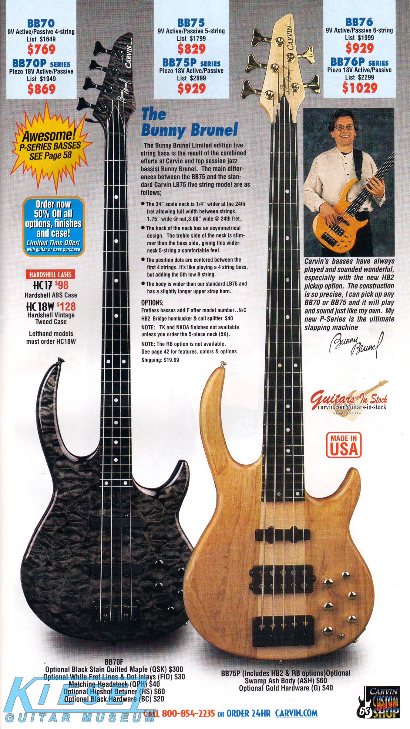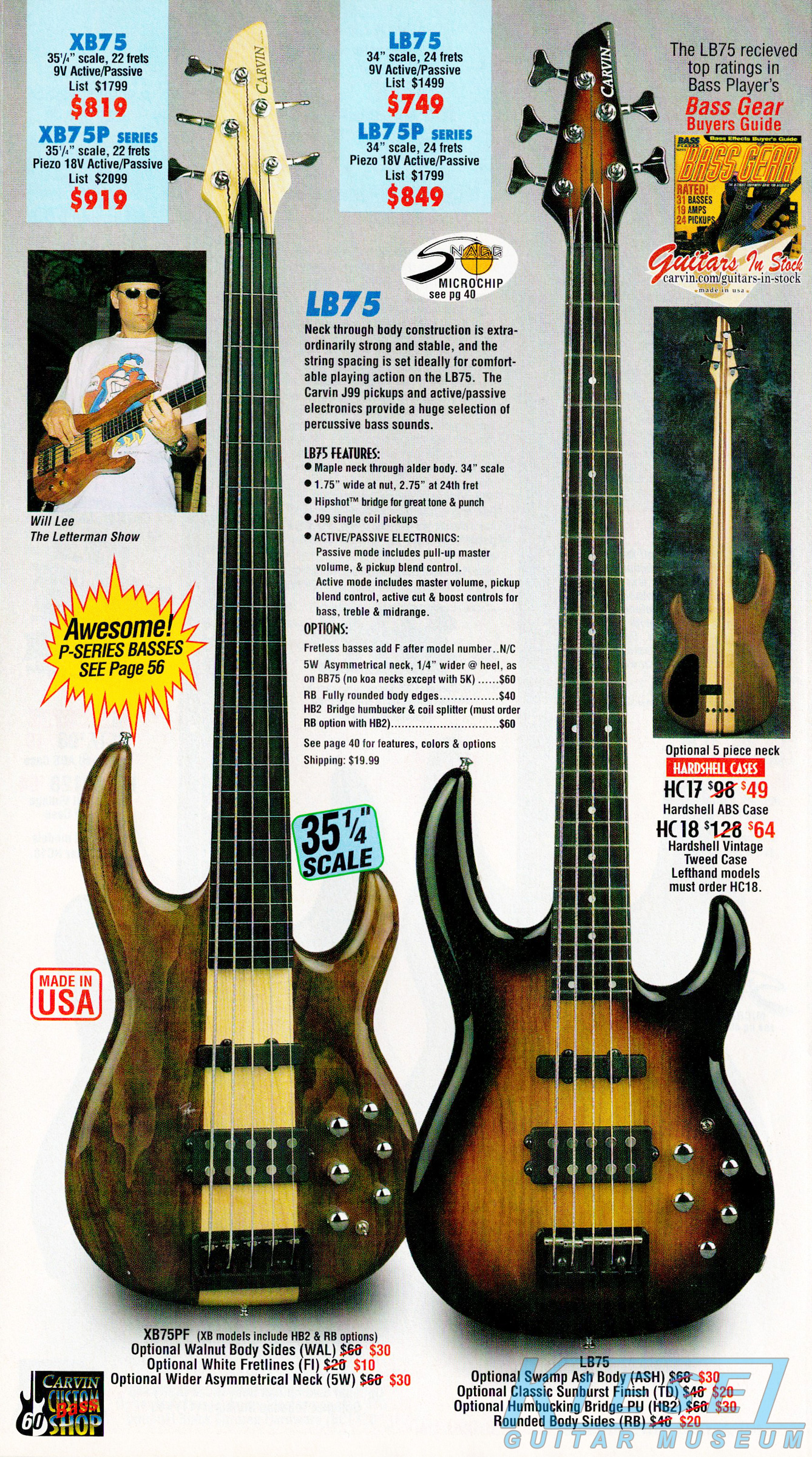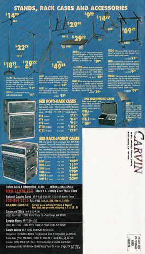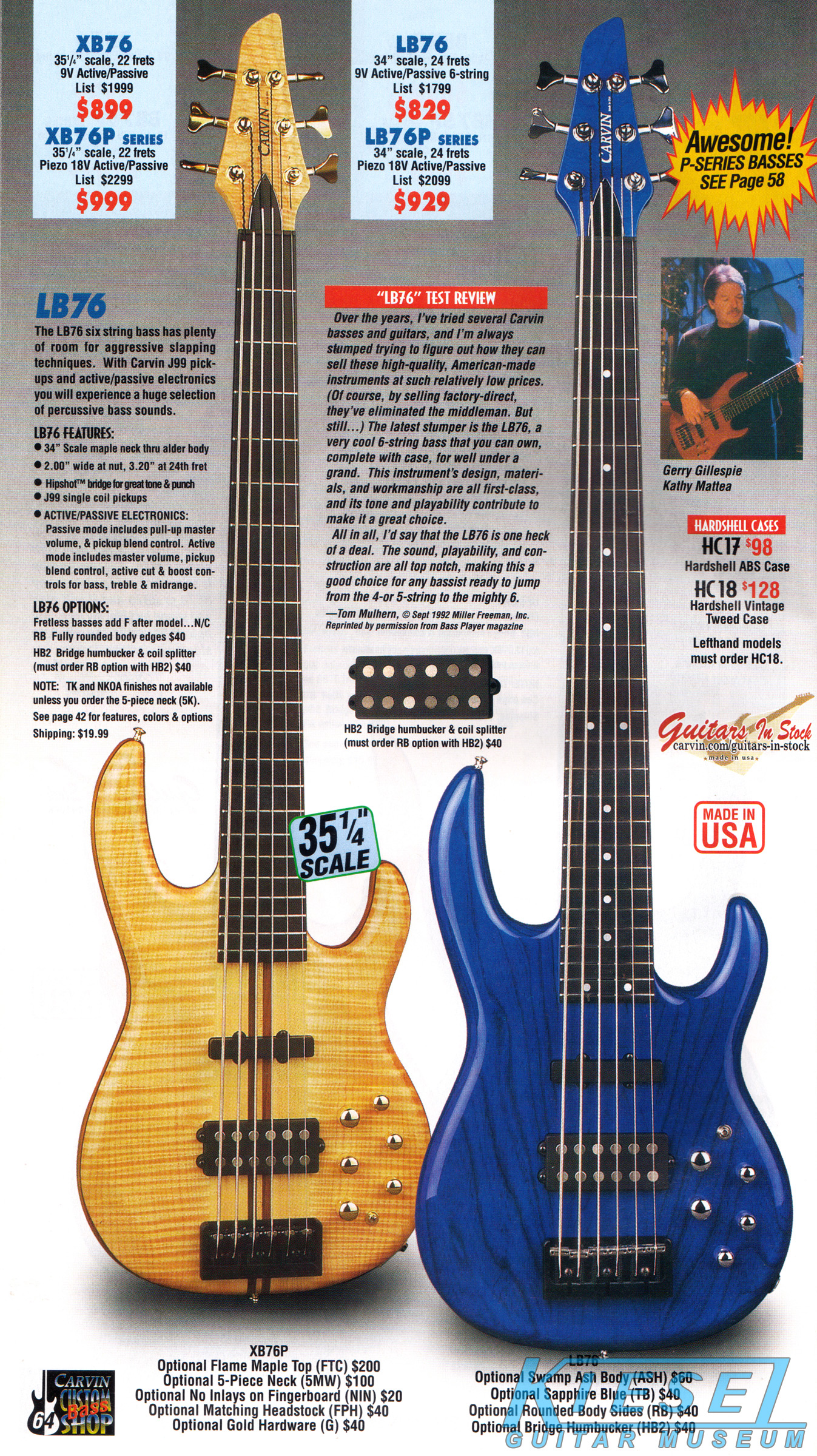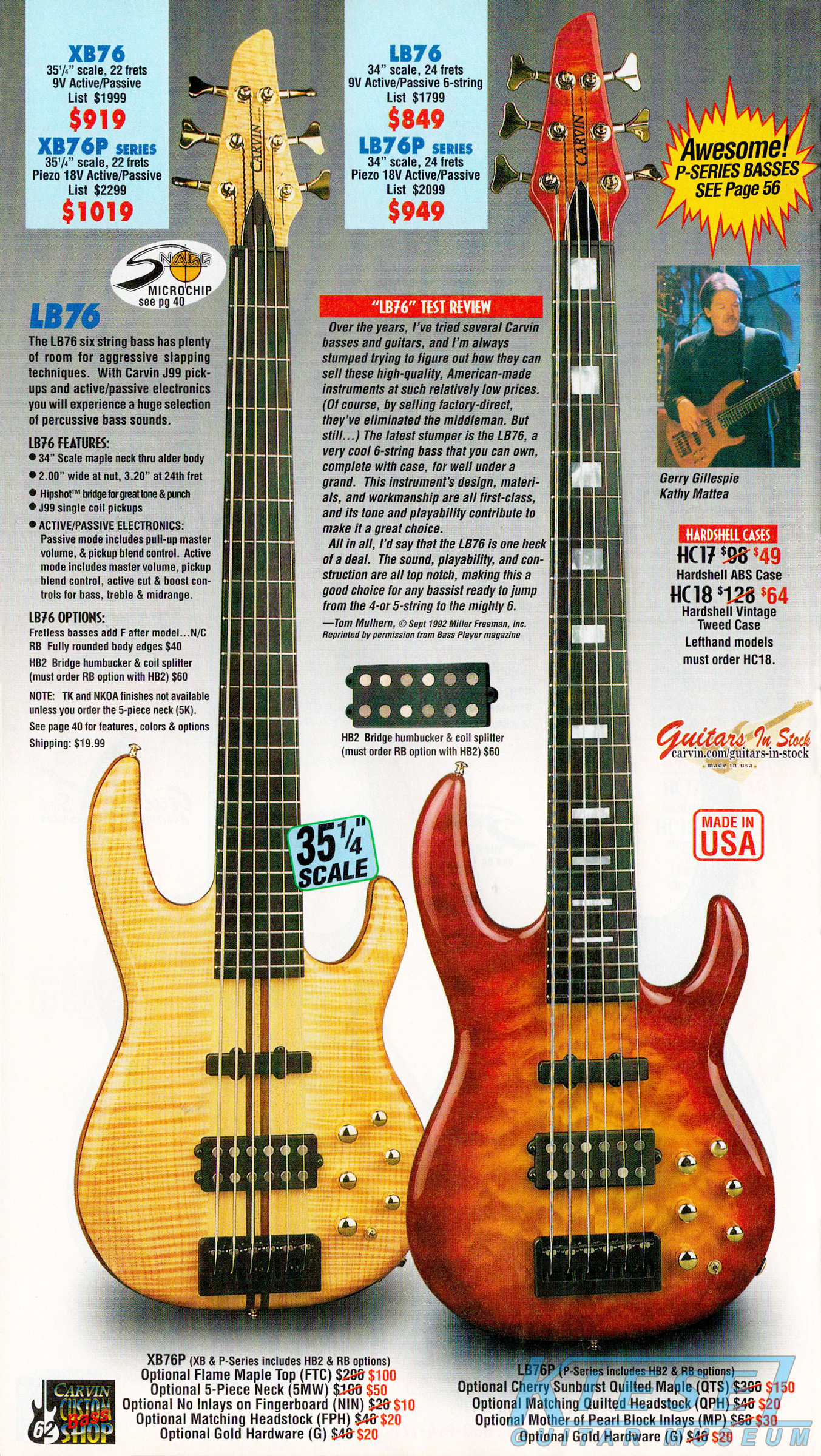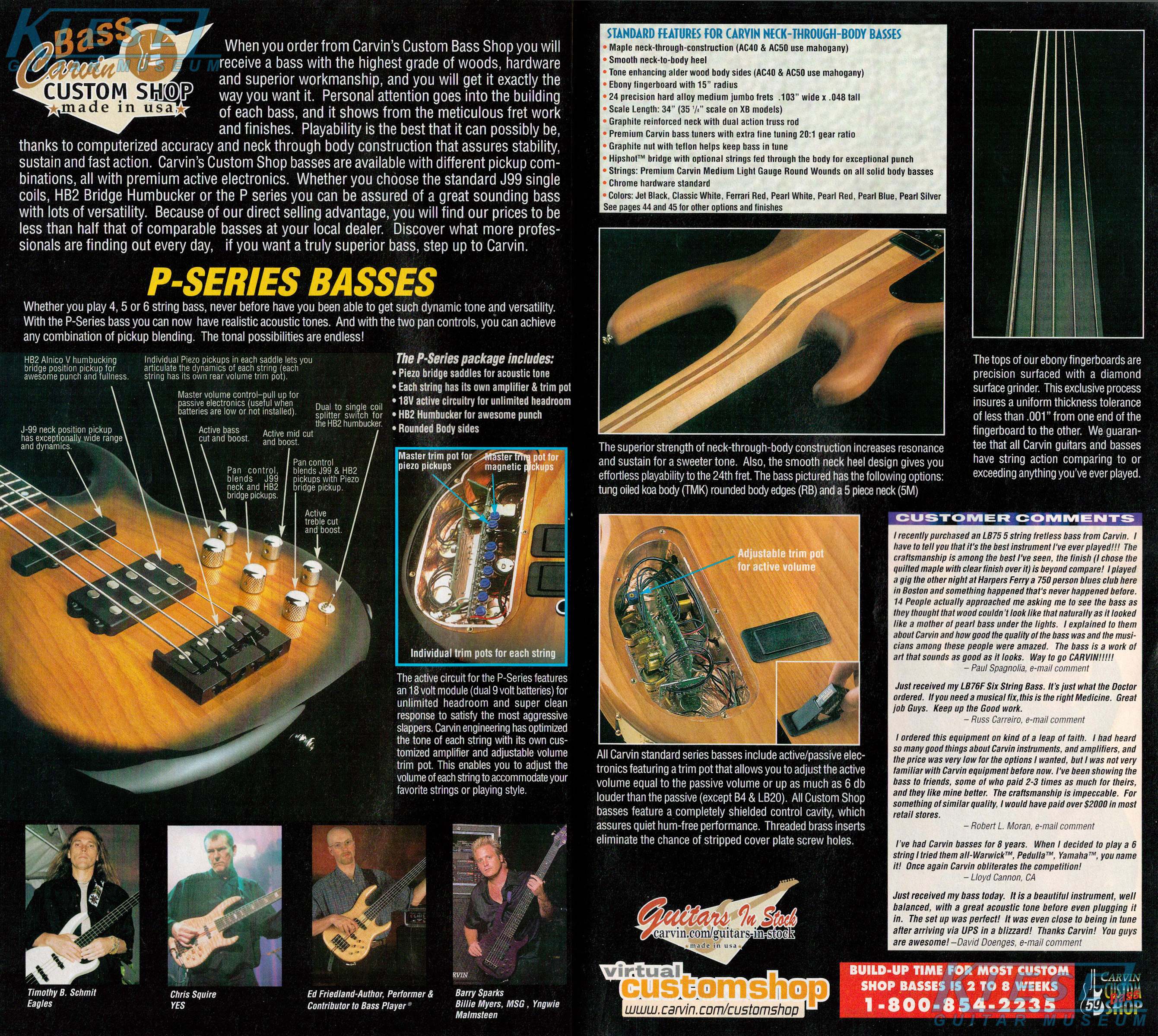 Carvin's bolt-neck B4 and B5 continued to go strong, and provided a high quality, USA-made, entry-level bass at a great price. Like Carvin's top of the line basses, these were available in over 50 different combinations of colors and woods. The B4 was priced at $519, and the B5 was priced at $649. The catalog showed the B4 in Vintage Yellow on flamed maple with matching traditional headstock, Birdseye maple fingerboard, HB pickup with active electronics and black hardware. The B5 was shown in Emerald Green on swamp ash with HB bridge pickup.