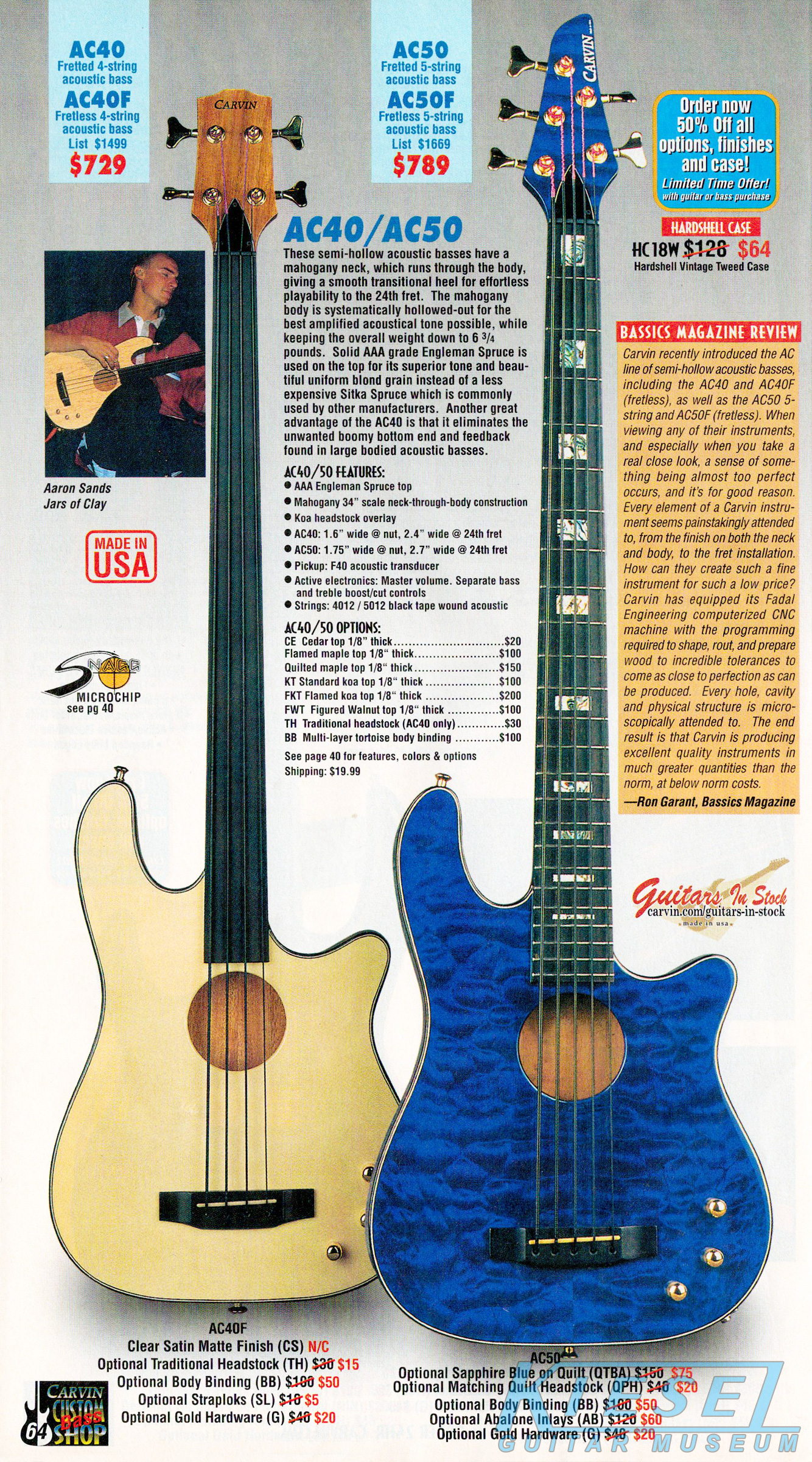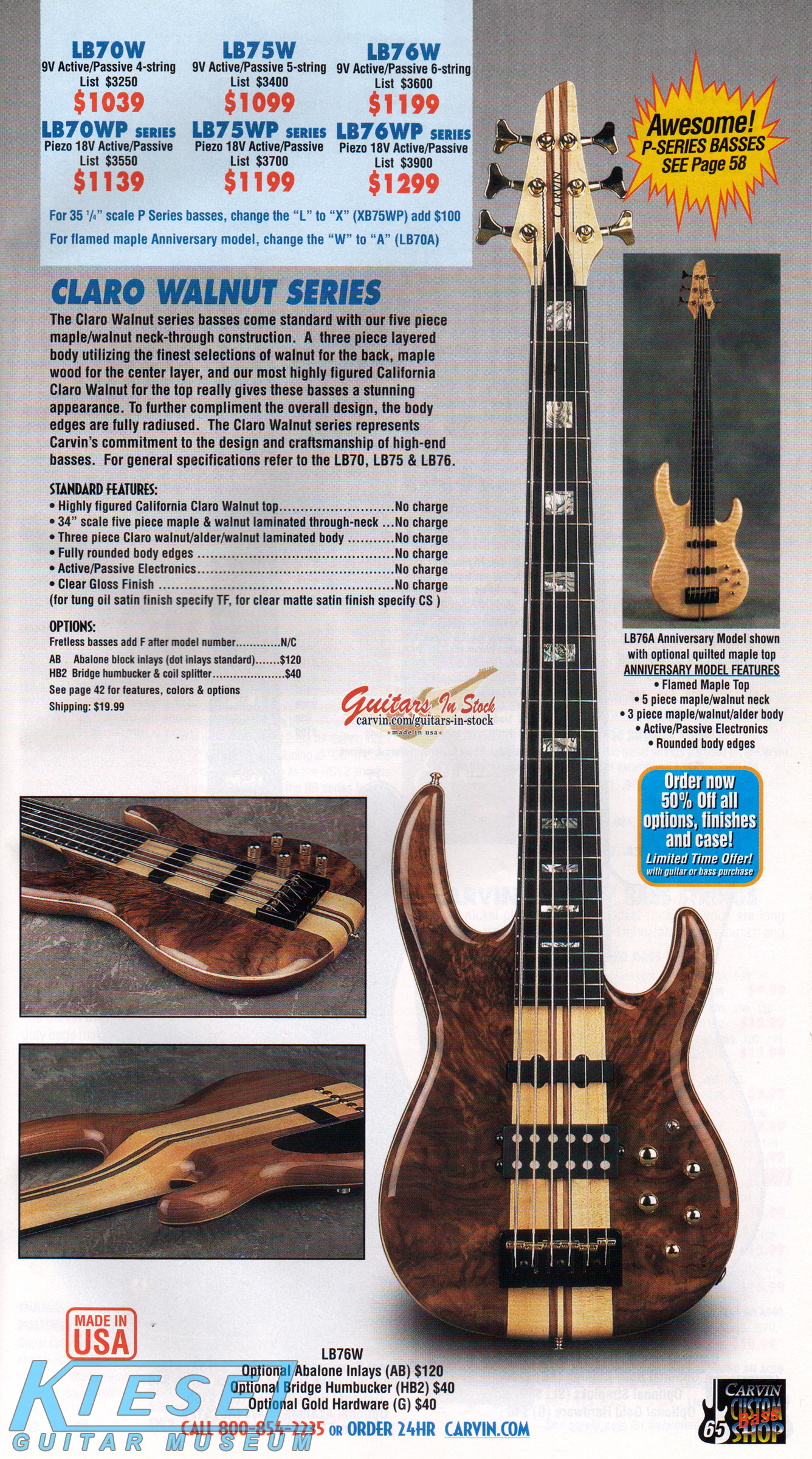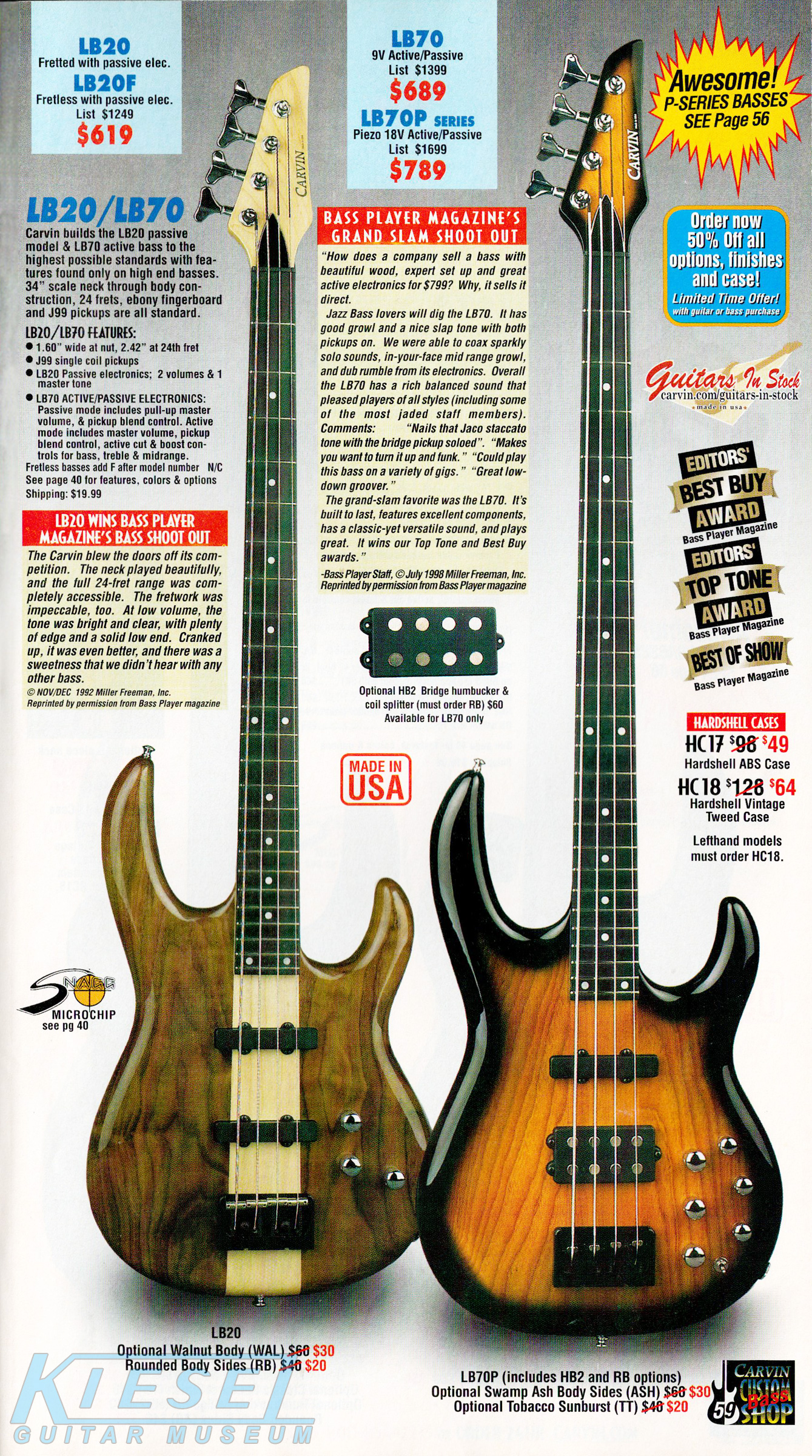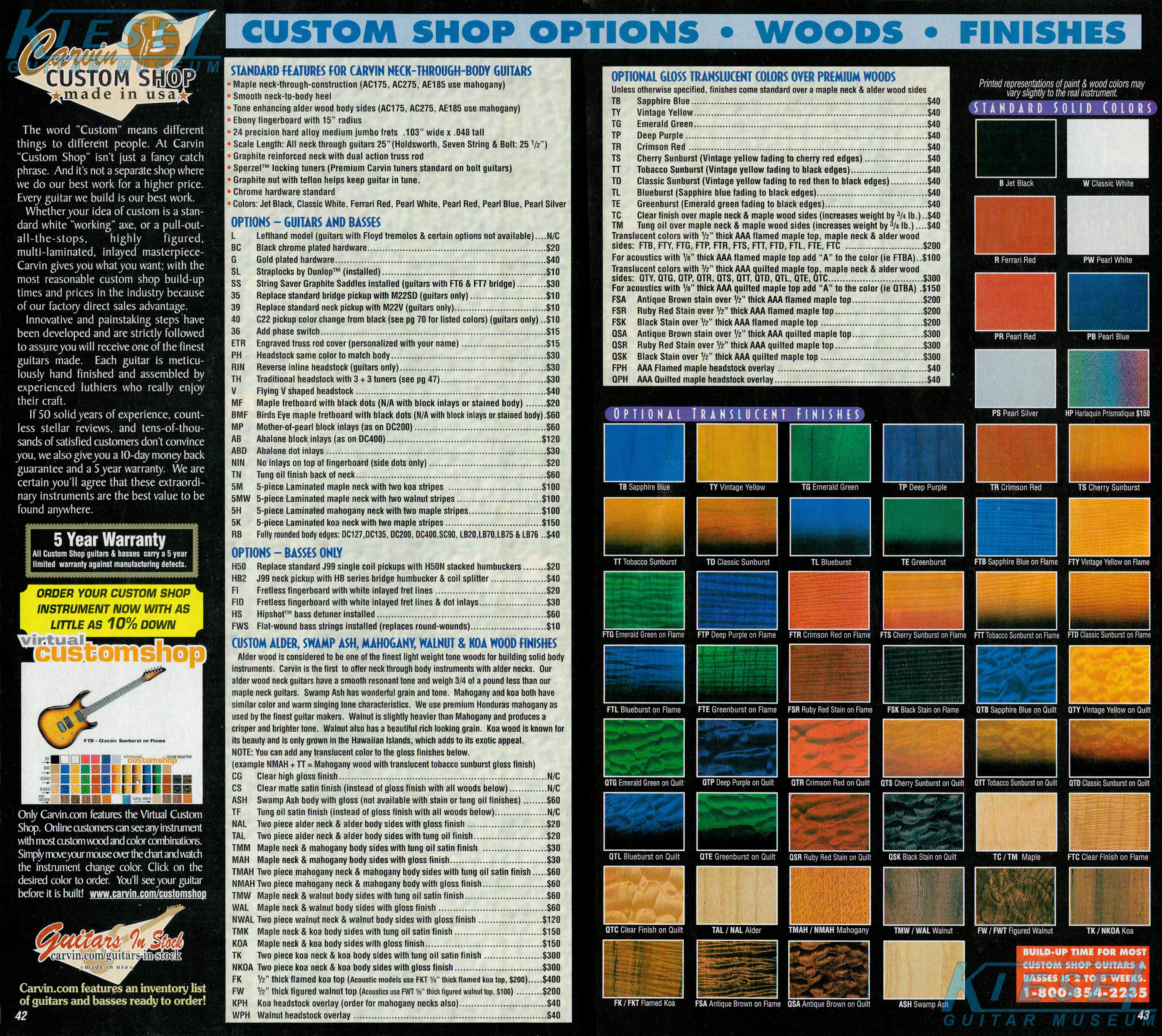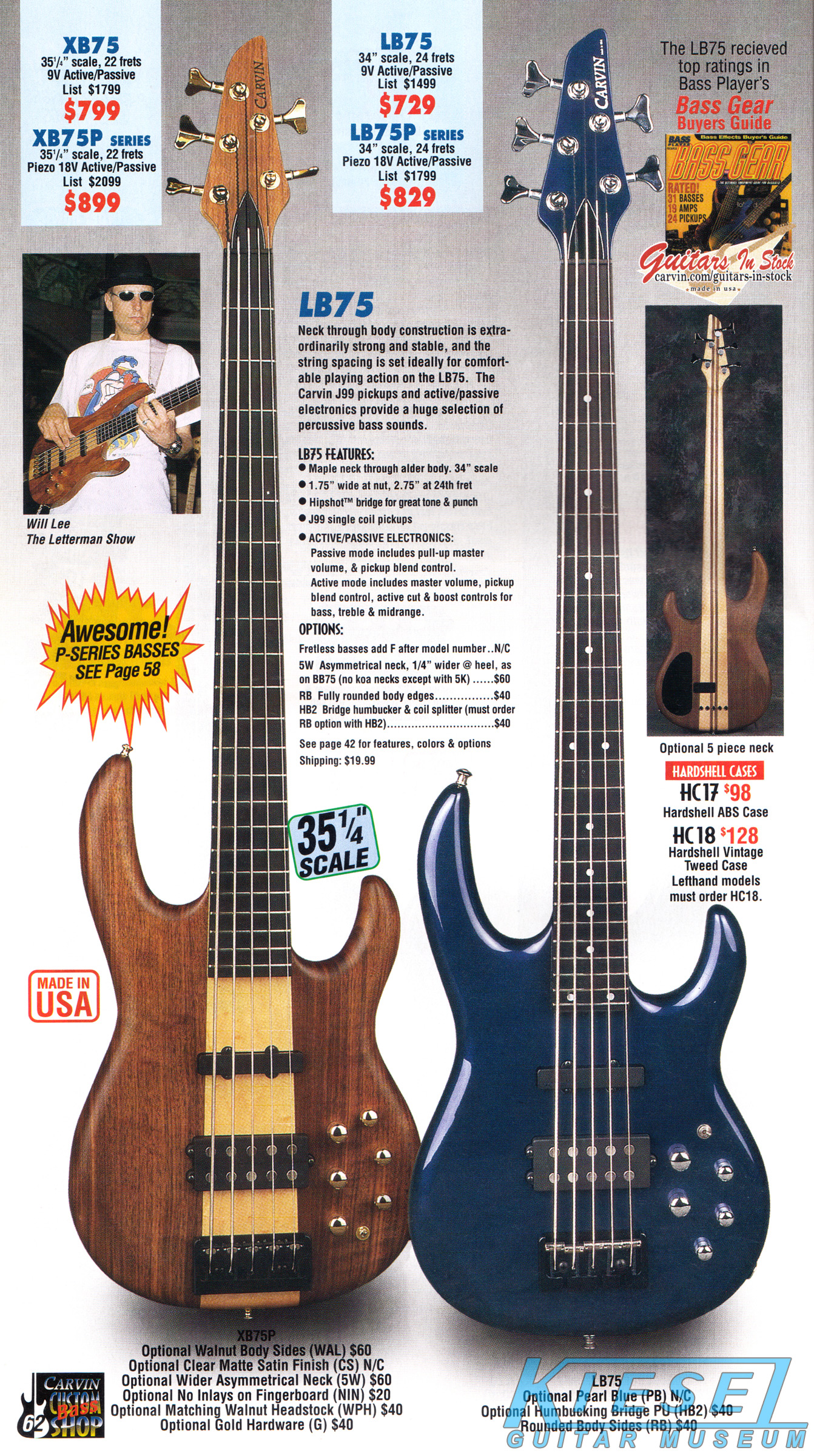 Carvin's bolt-neck B4 and B5 continued to go strong, and provided a high quality, USA-made, entry-level bass at a great price. Like Carvin's top of the line basses, these were available in over 50 different combinations of colors and woods. The B4 was priced at $519, and the B5 was priced at $649. The catalog showed the B4 in Vintage Yellow on flamed maple with matching traditional headstock, Birdseye maple fingerboard, HB pickup with active electronics and black hardware. The B5 was shown in Emerald Green on swamp ash with HB bridge pickup.