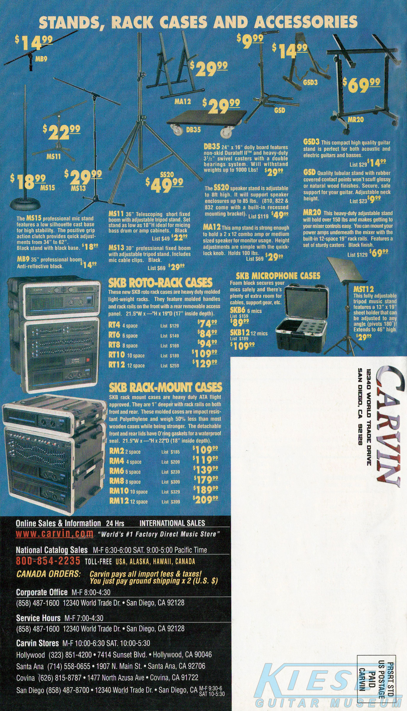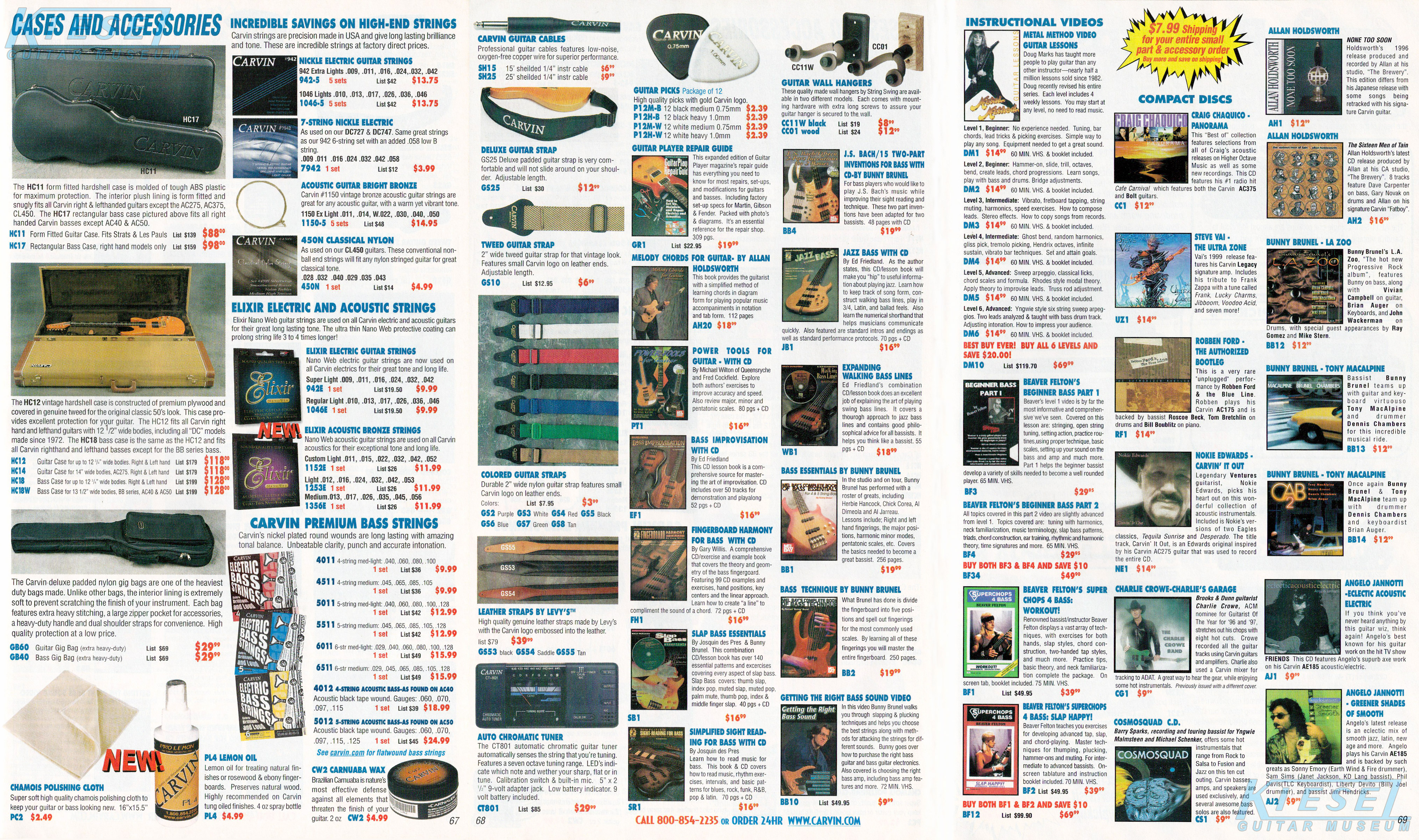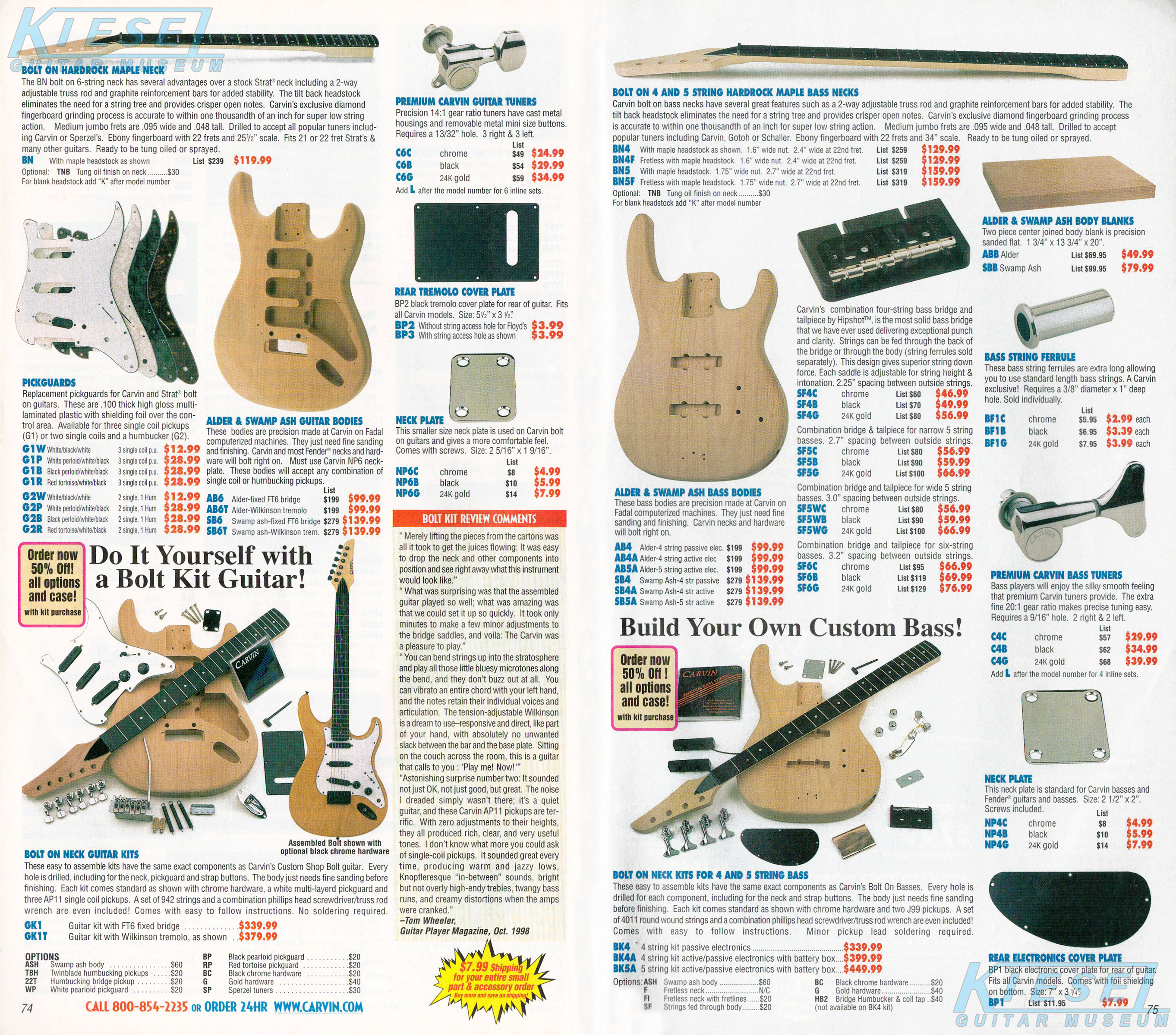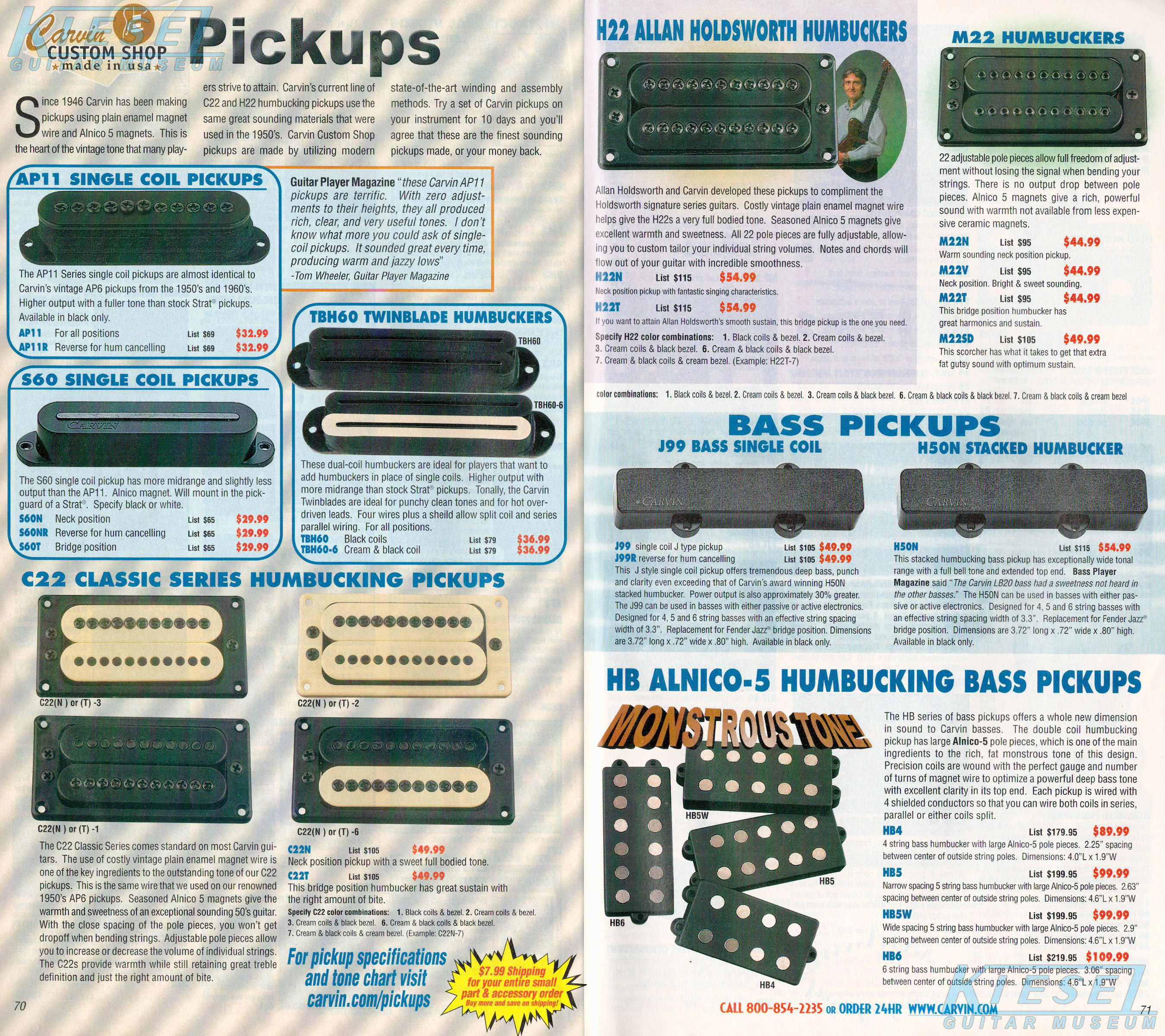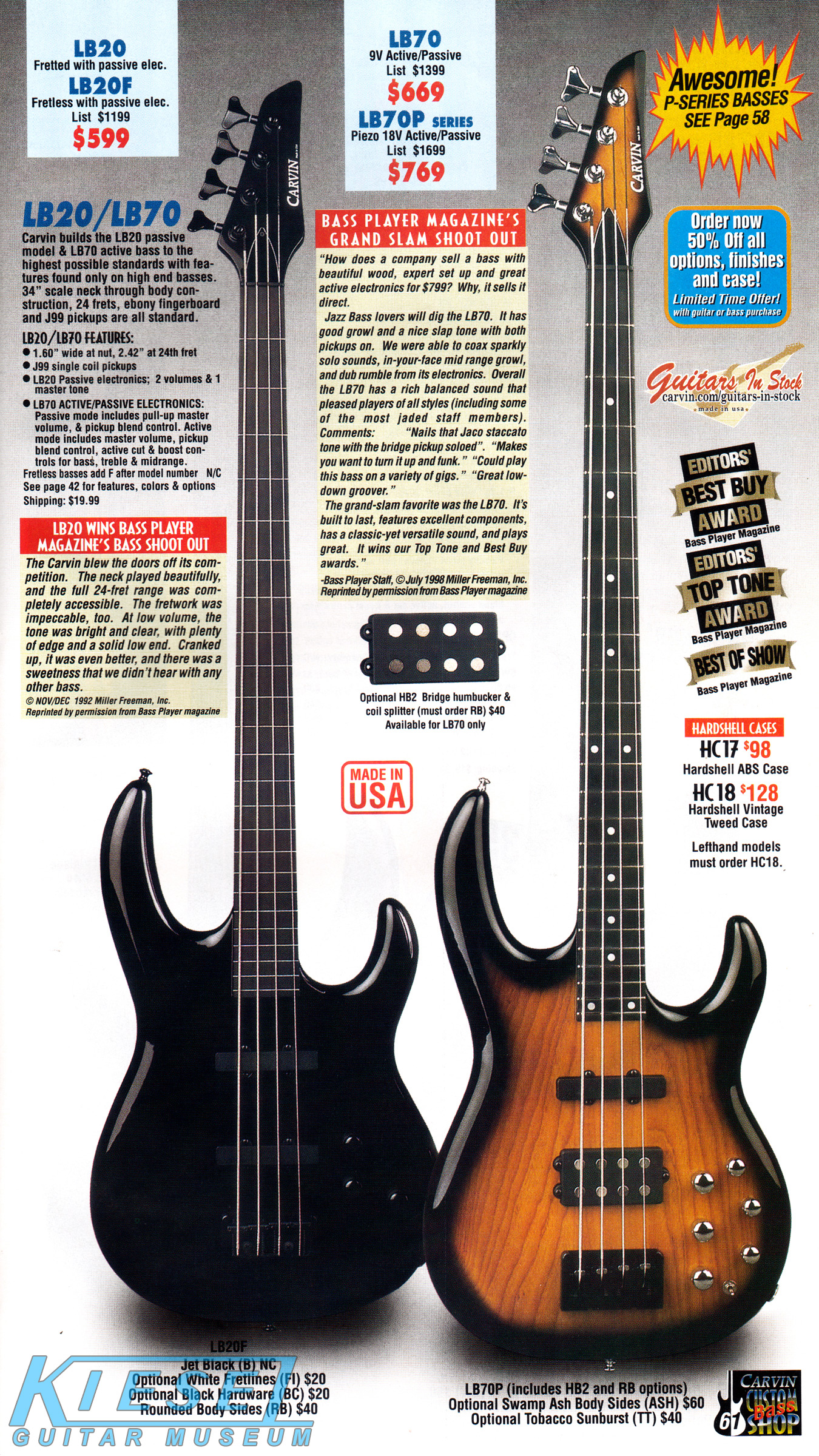 Carvin's bolt-neck B4 and B5 continued to go strong, and provided a high quality, USA-made, entry-level bass at a great price. Like Carvin's top of the line basses, these were available in over 50 different combinations of colors and woods. The B4 was priced at $519, and the B5 was priced at $649. The catalog showed the B4 in Vintage Yellow on flamed maple with matching traditional headstock, Birdseye maple fingerboard, HB pickup with active electronics and black hardware. The B5 was shown in Emerald Green on swamp ash with HB bridge pickup.
