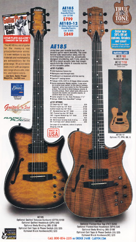 The AE185 and AE185-12 were unchanged for 2002, and used the same catalog photo. The base price of the AE185 remained $799, and the base price of the AE185-12 was $849. The same catalog photo was used as in 2000. The catalog showed a AE185 in flamed koa with matching headstock, body binding, coil splitters and phase switches and black hardware, and an AE185 in Tobacco Sunburst on quilted maple with matching headstock and coil splitters and phase switches and black hardware.