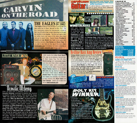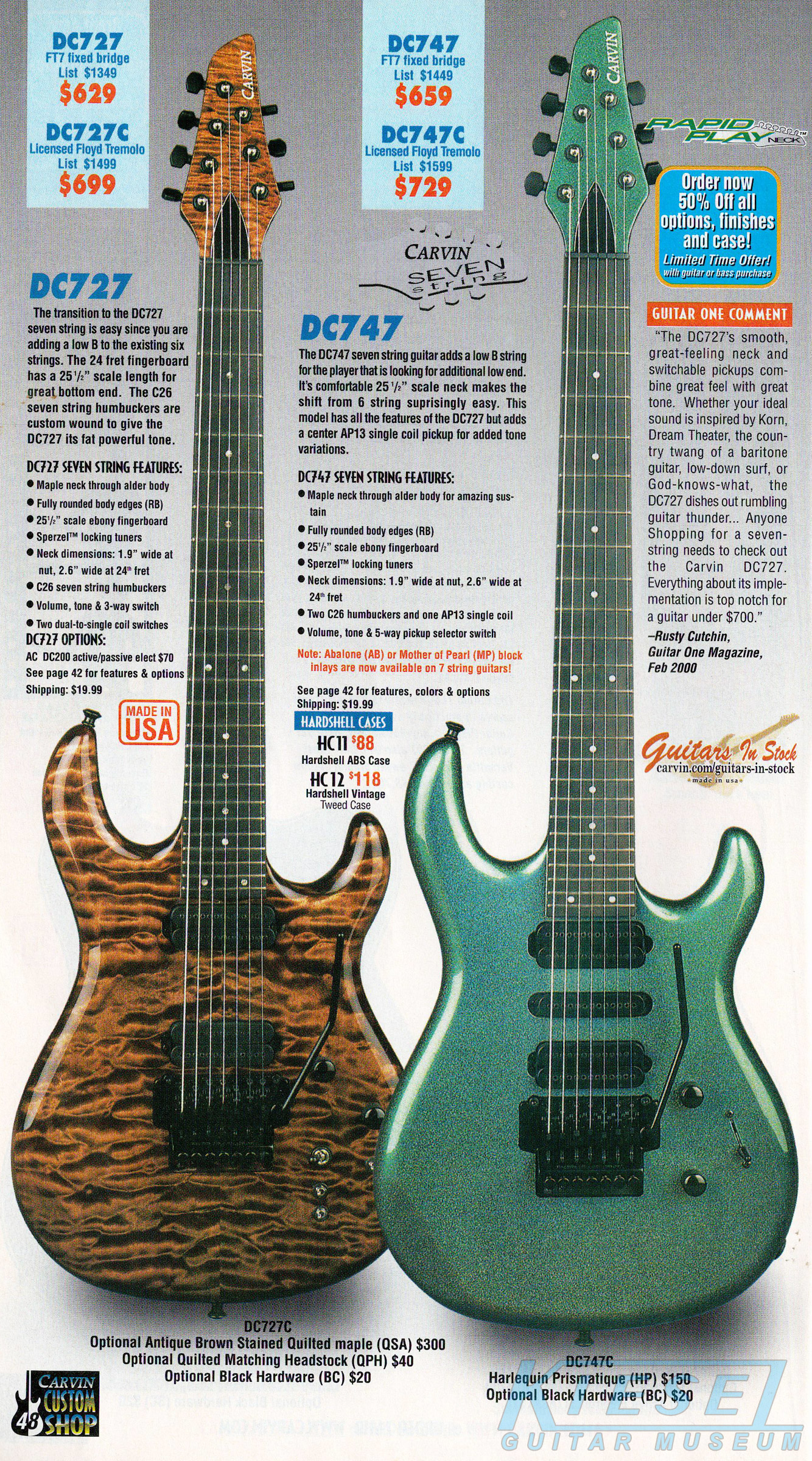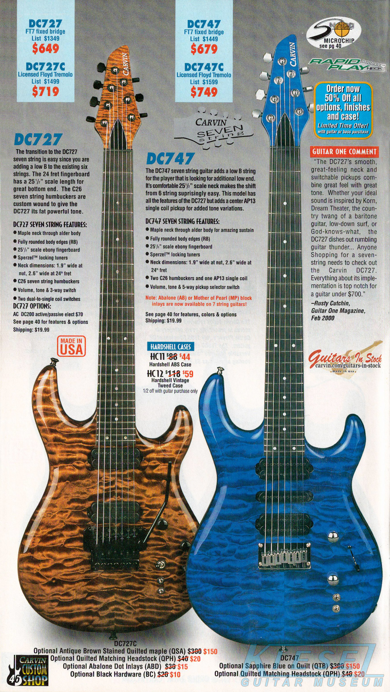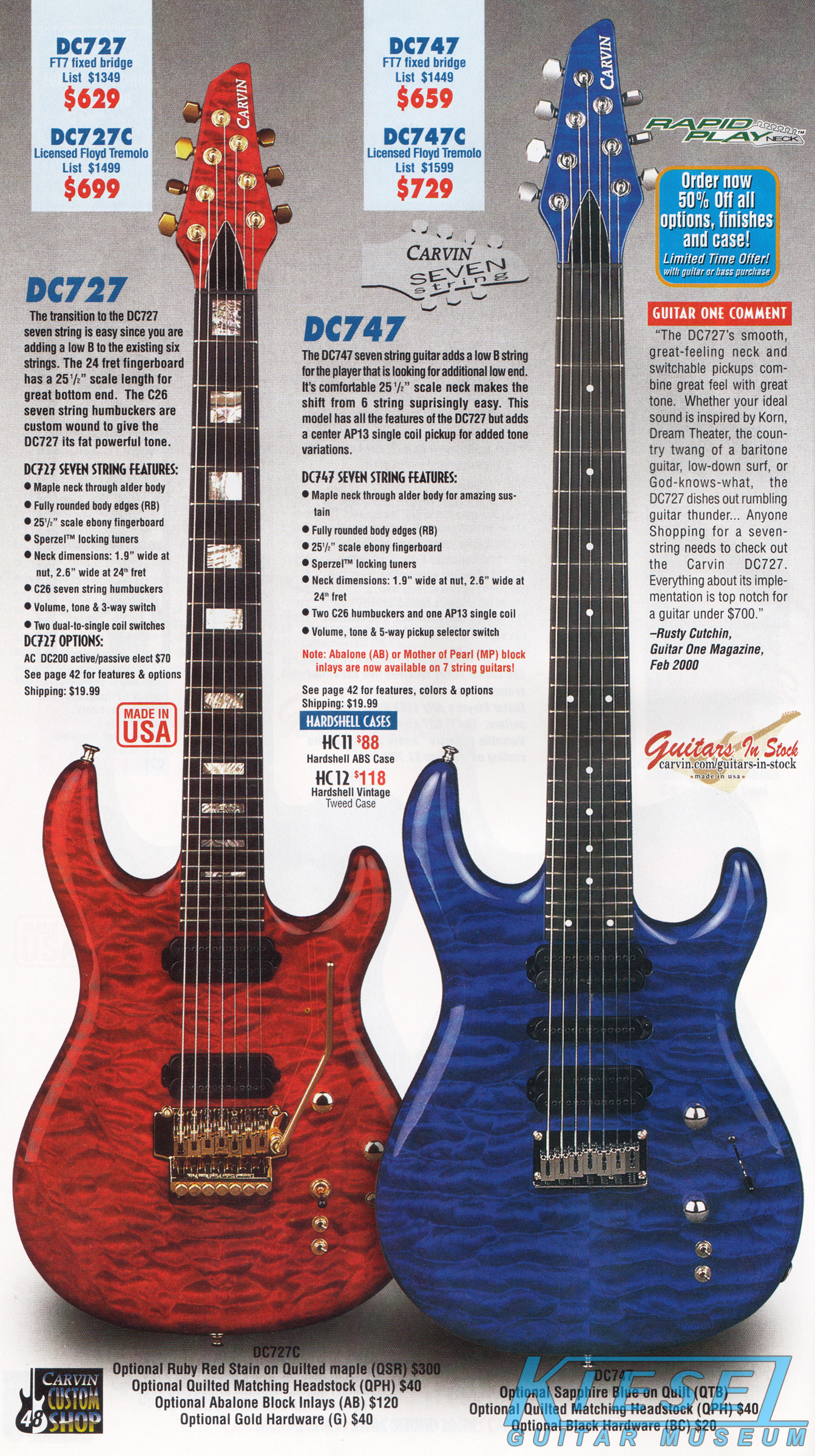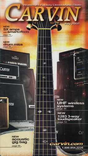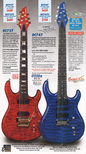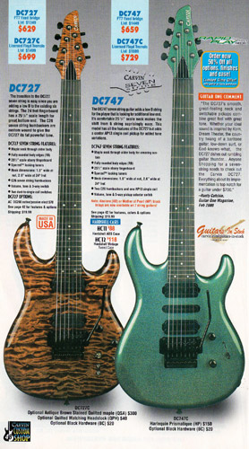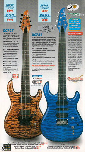 Carvin's 7-string guitars, the DC727 and DC747 were unchanged for 2002. Prices remained the same, starting at $629 for the DC727 and $659 for the DC747, which had the additional middle position AP13 single-coil pickup. The catalog photo showed the DC727 in Ruby Red Stain on quilted maple with matching headstock, abalone block inlays, gold hardware, and Carvin-licensed Floyd Rose 7-string tremolo. The DC747 was shown in Sapphire Blue on quilted maple with matching headstock and chrome hardware.