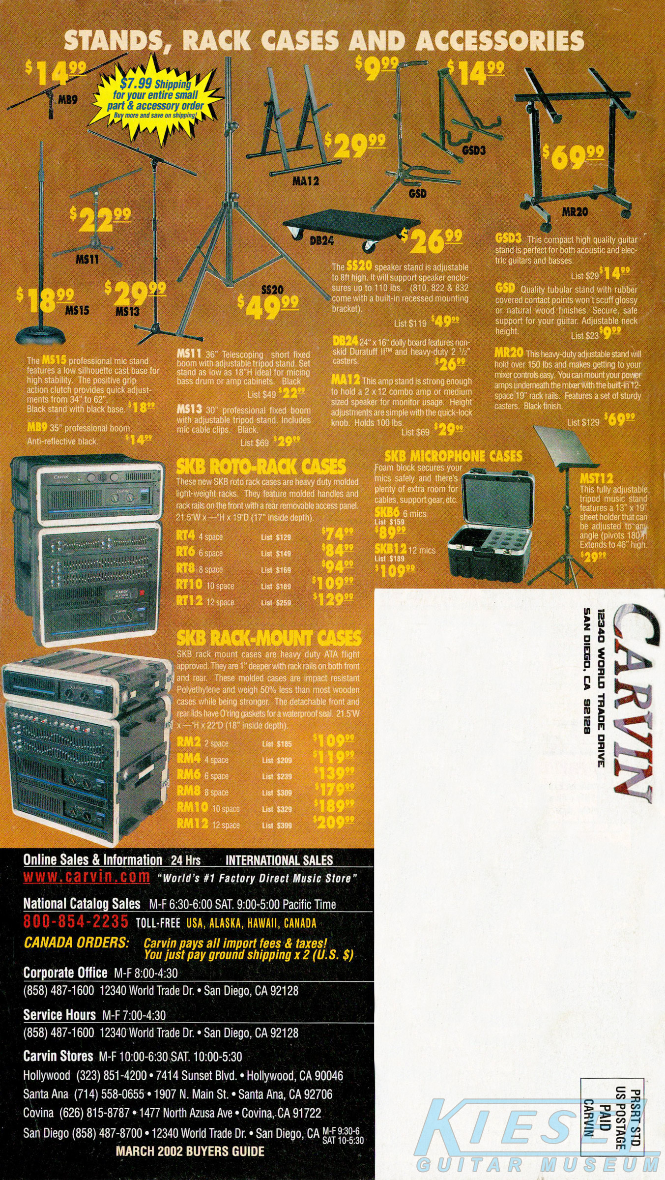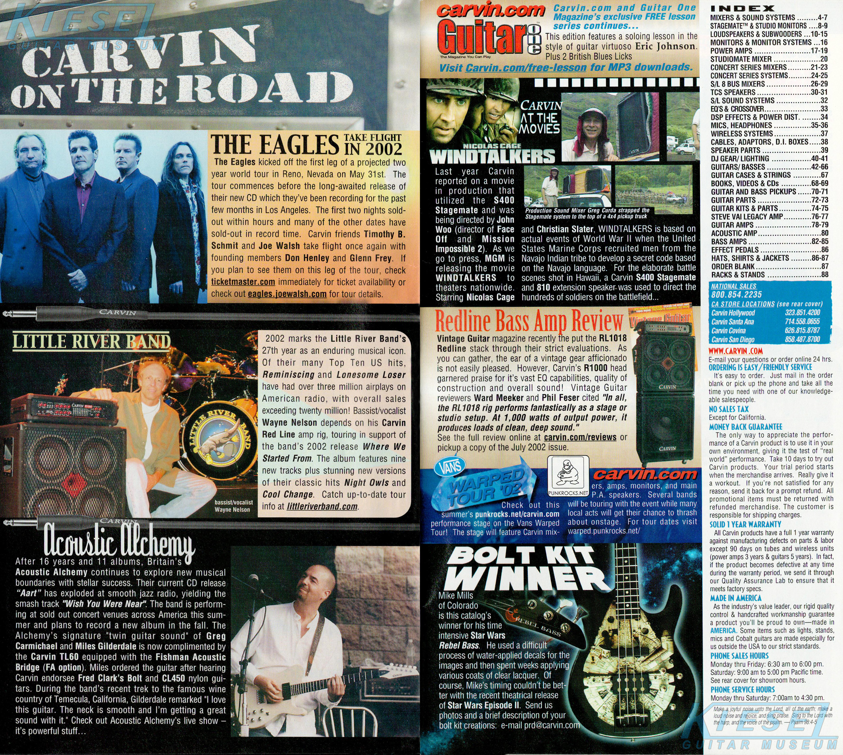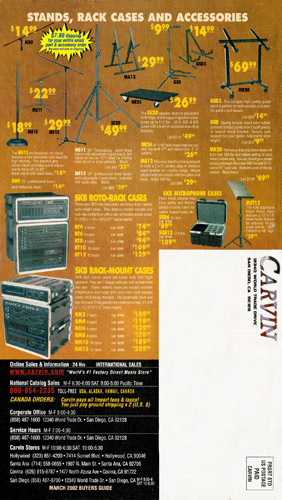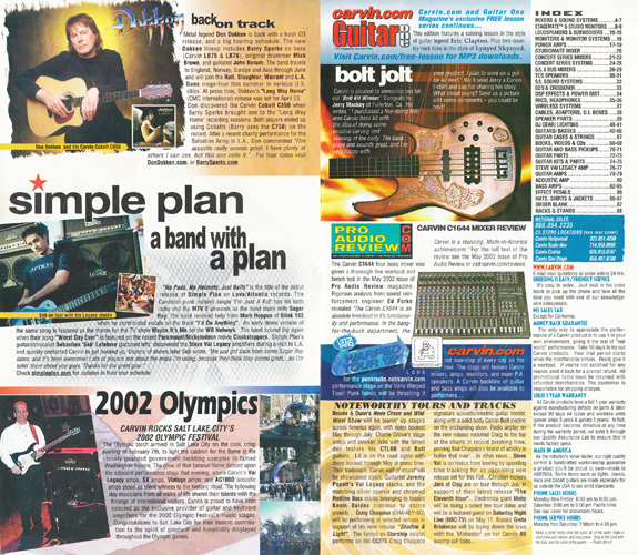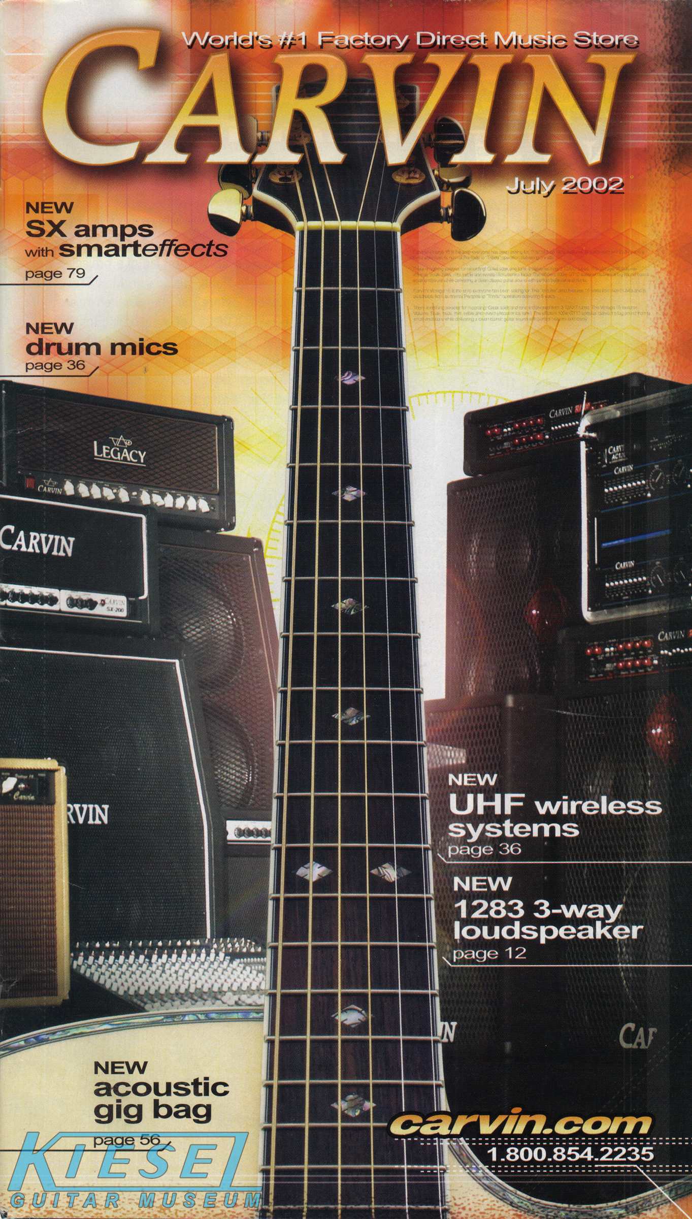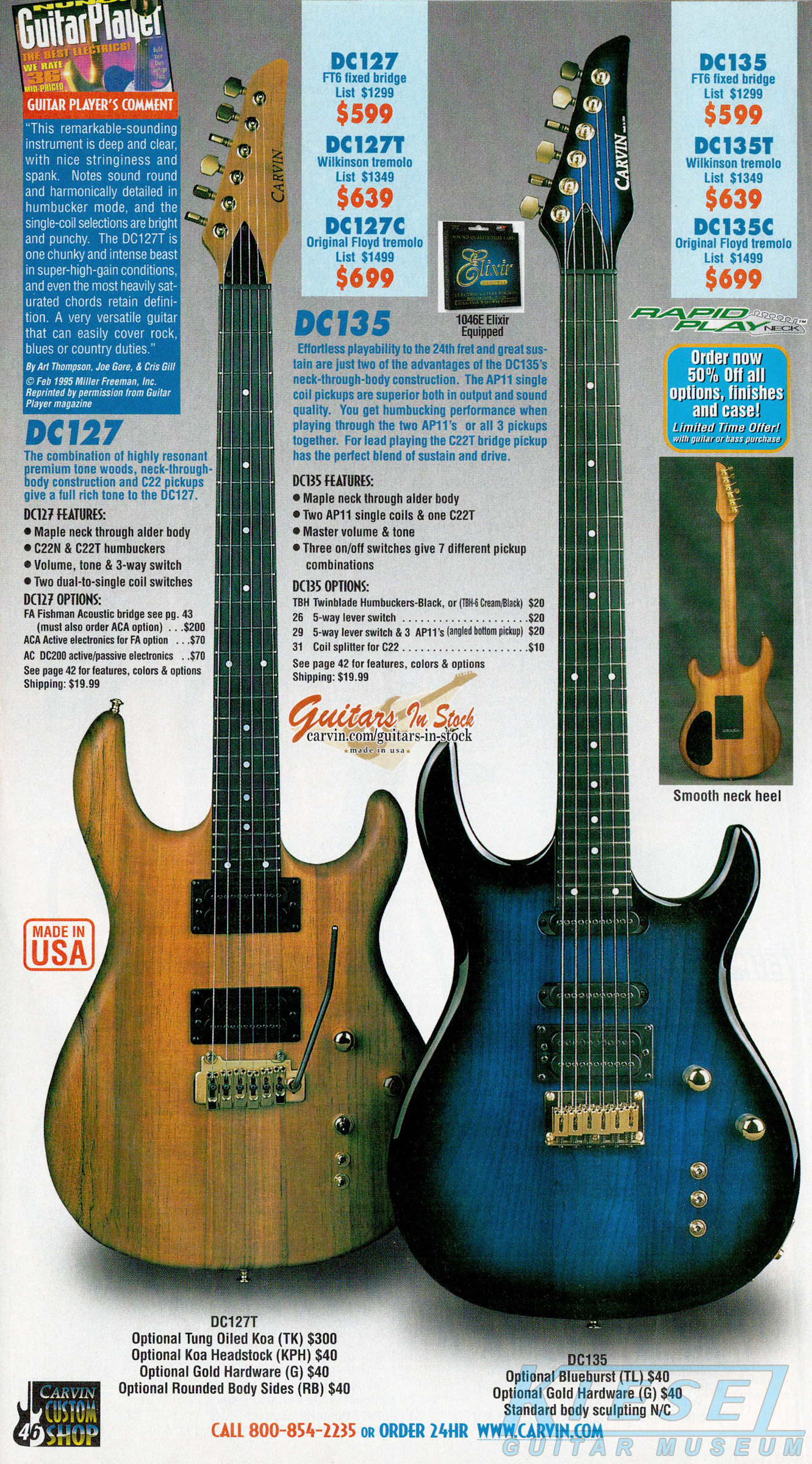 Carvin's 7-string guitars, the DC727 and DC747 were unchanged for 2002. Prices remained the same, starting at $629 for the DC727 and $659 for the DC747, which had the additional middle position AP13 single-coil pickup. The catalog photo showed the DC727 in Ruby Red Stain on quilted maple with matching headstock, abalone block inlays, gold hardware, and Carvin-licensed Floyd Rose 7-string tremolo. The DC747 was shown in Sapphire Blue on quilted maple with matching headstock and chrome hardware.