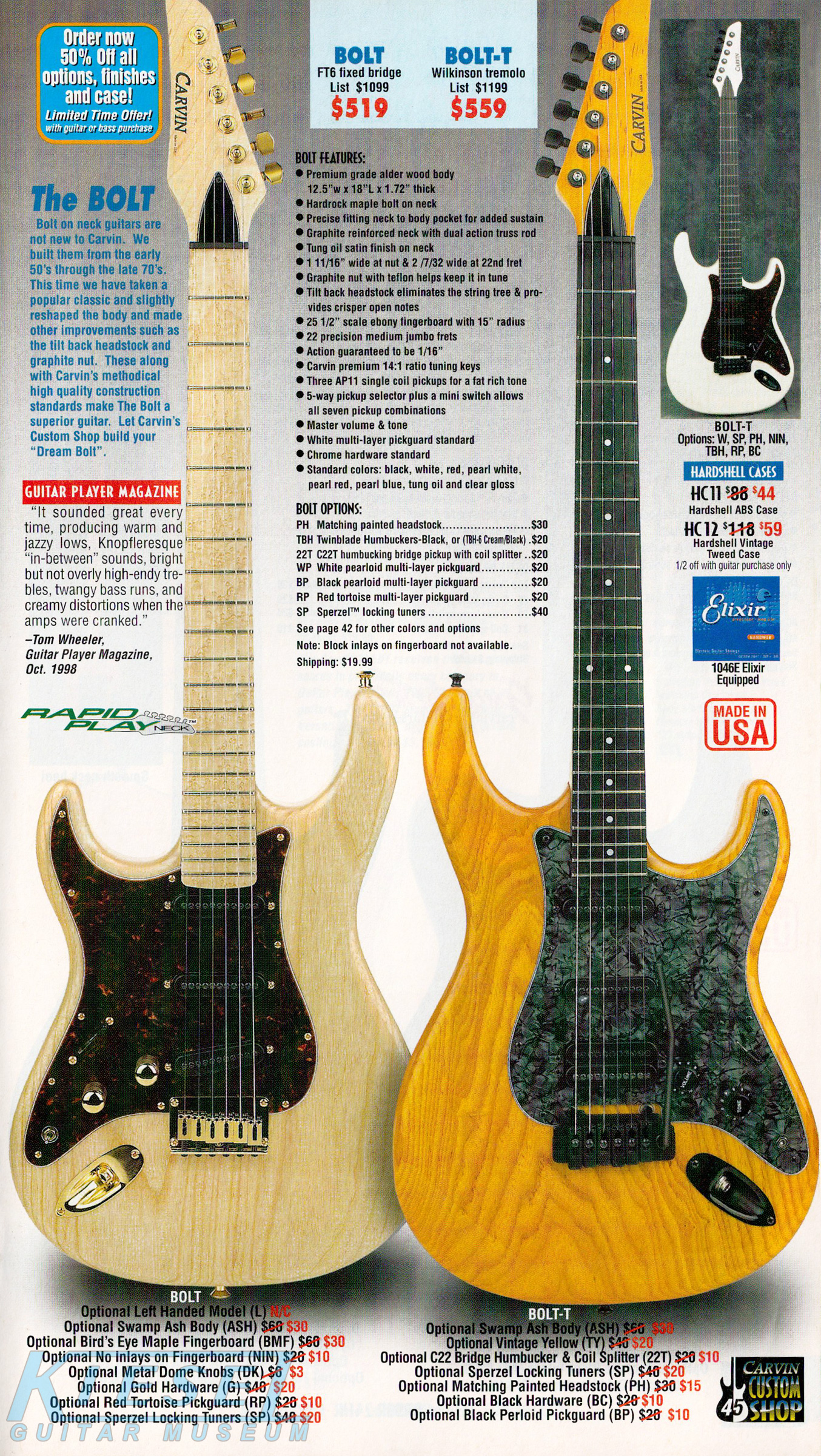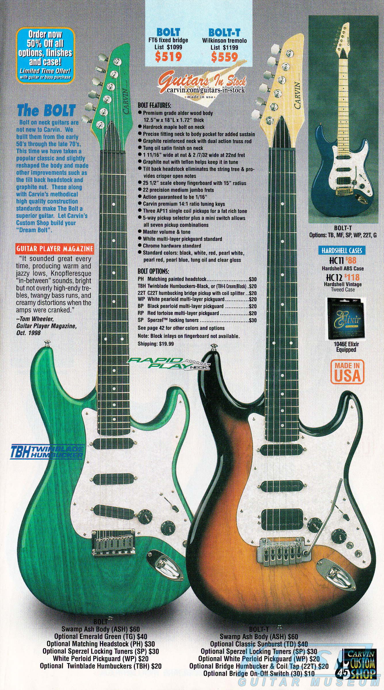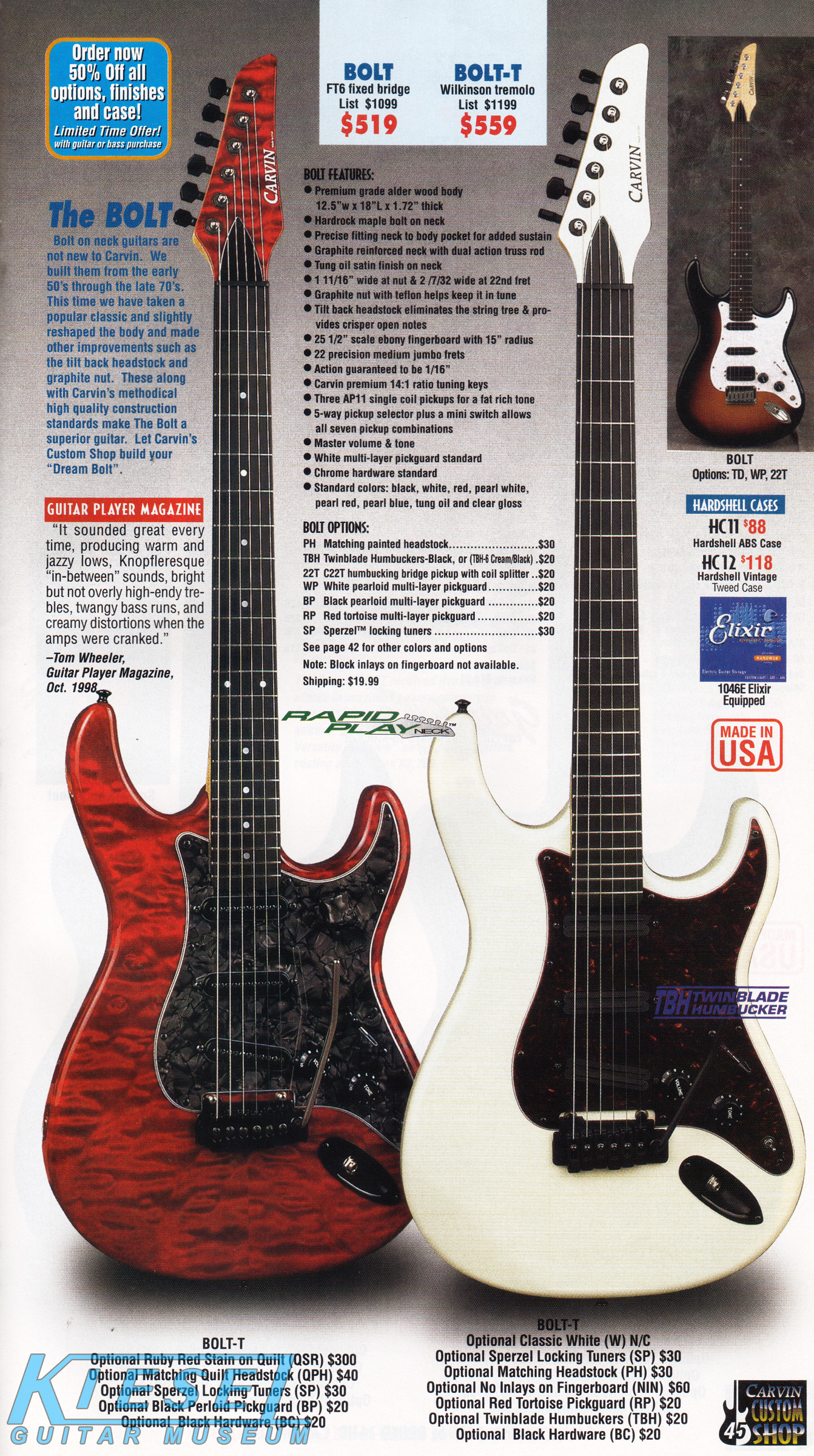 The Bolt and Bolt-T were unchanged for 2002. The base price of the Bolt was $519 at the beginning of the year, but had risen to $539 by the end of the year. The Bolt-T started at $559, but rose to $579 by the end of 2002. The Bolt was well represented in the catalog throughout the year, with different photos in every issue, including a Bolt-T in Ruby Red Stain on quilted maple with matching headstock, Sperzel tuners, black pearloid pickguard, black hardware, and Wilkinson tremolo; and a Bolt in Classic White with matching headstock, Sperzel locking tuners, no inlays, red tortoise pickguard, twinblade humbuckers and black hardware.