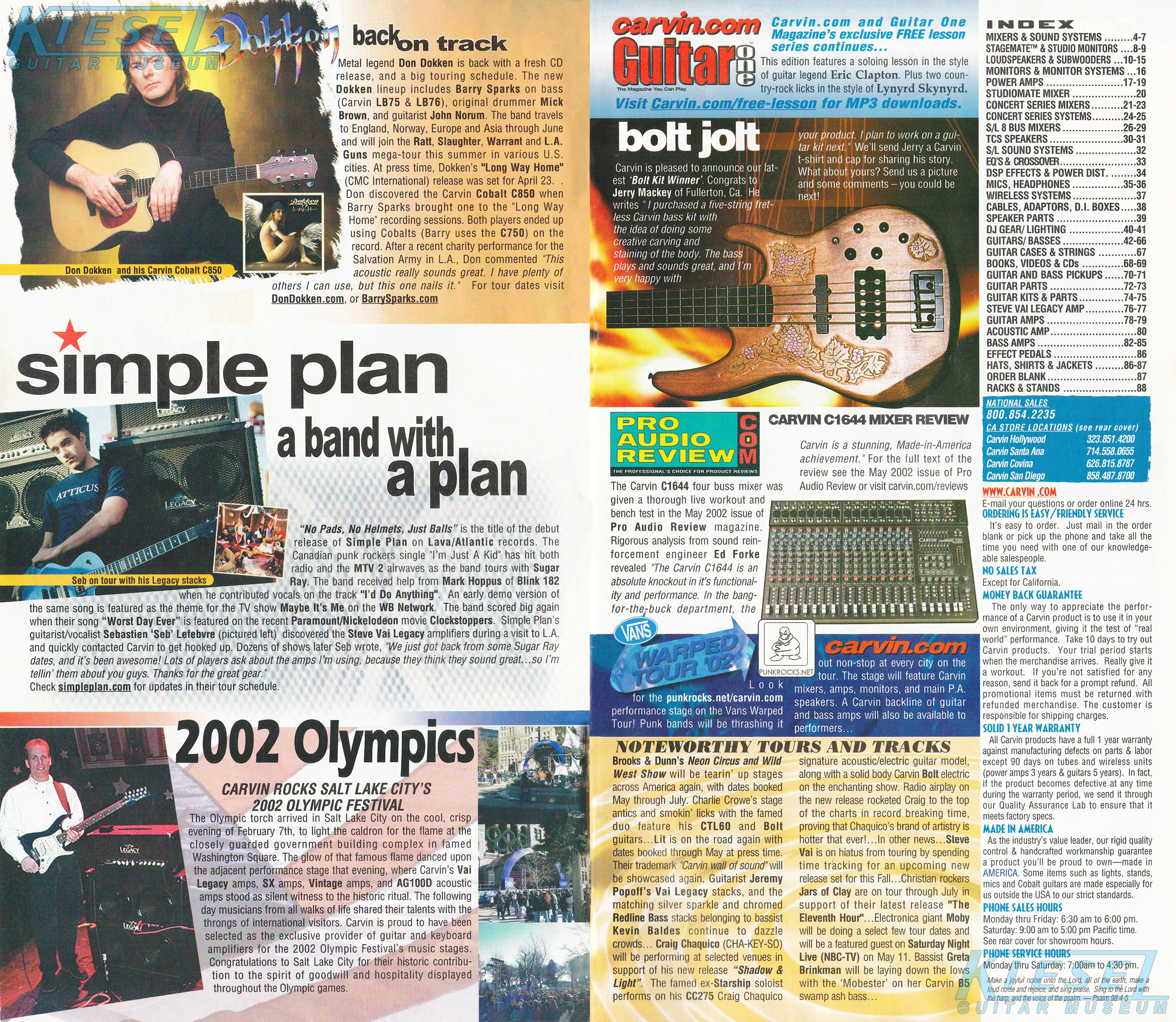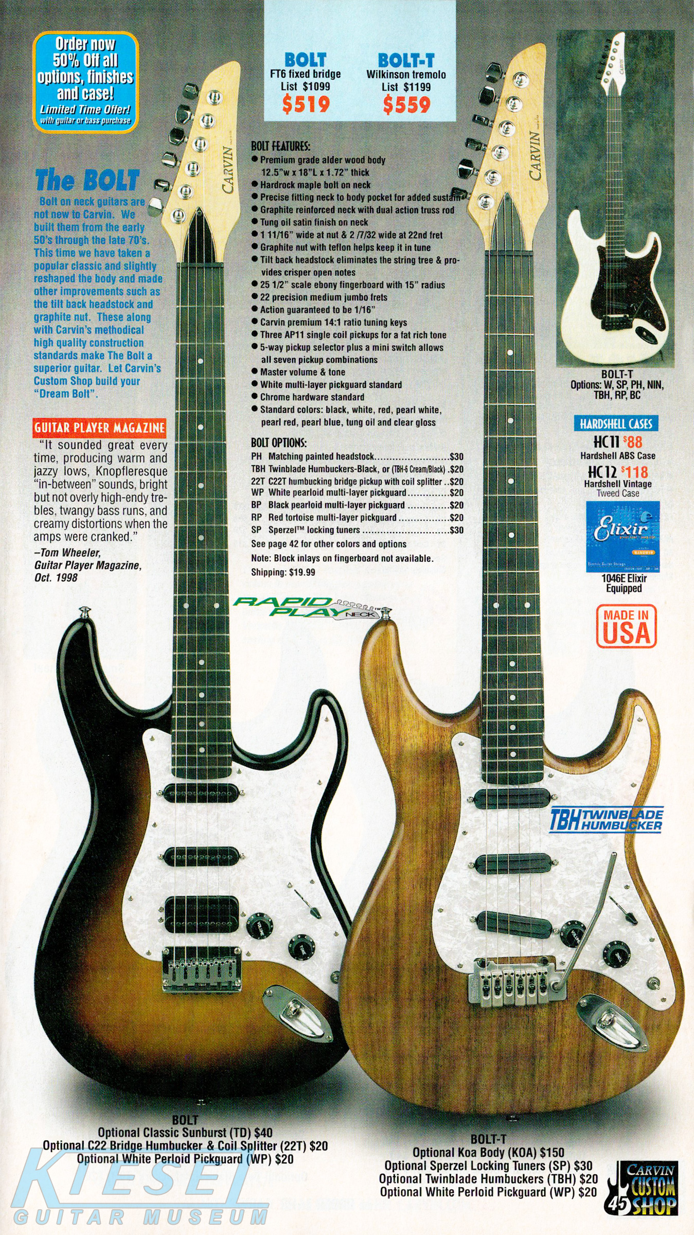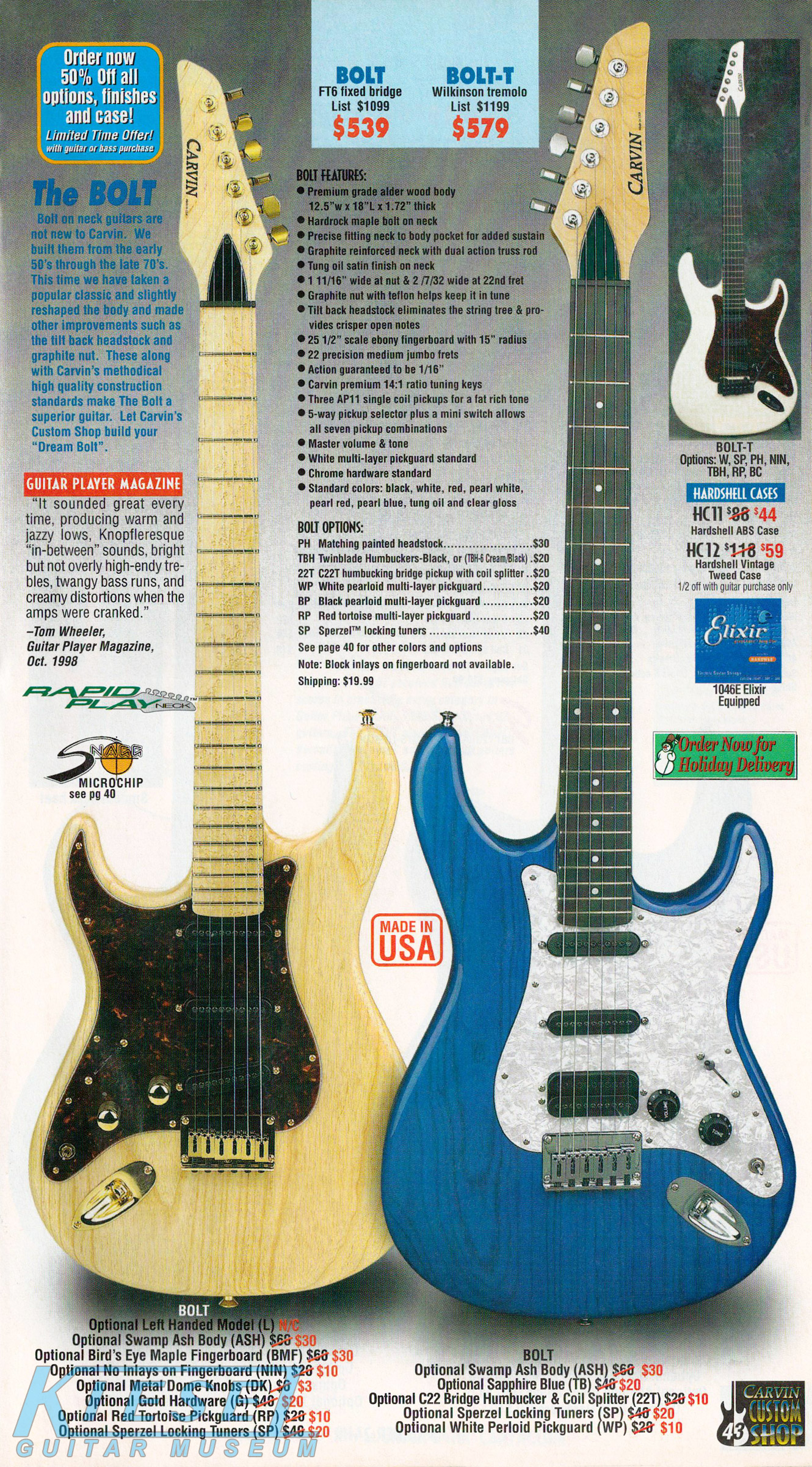 The Bolt and Bolt-T were unchanged for 2002. The base price of the Bolt was $519 at the beginning of the year, but had risen to $539 by the end of the year. The Bolt-T started at $559, but rose to $579 by the end of 2002. The Bolt was well represented in the catalog throughout the year, with different photos in every issue, including a Bolt-T in Ruby Red Stain on quilted maple with matching headstock, Sperzel tuners, black pearloid pickguard, black hardware, and Wilkinson tremolo; and a Bolt in Classic White with matching headstock, Sperzel locking tuners, no inlays, red tortoise pickguard, twinblade humbuckers and black hardware.