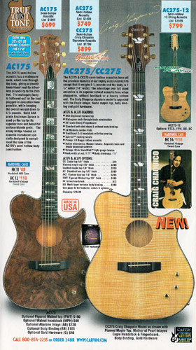 The AC175, AC275, and AC275-12 were unchanged for 2002. The base price of the AC175 dropped to $699, and the AC275 dropped to $749. The AC275-12 increased slightly, to $799. The catalog showed an AC175 in Classic Sunburst on flamed maple with matching headstock and body binding. The catalog did not show the AC275 or AC275-12.