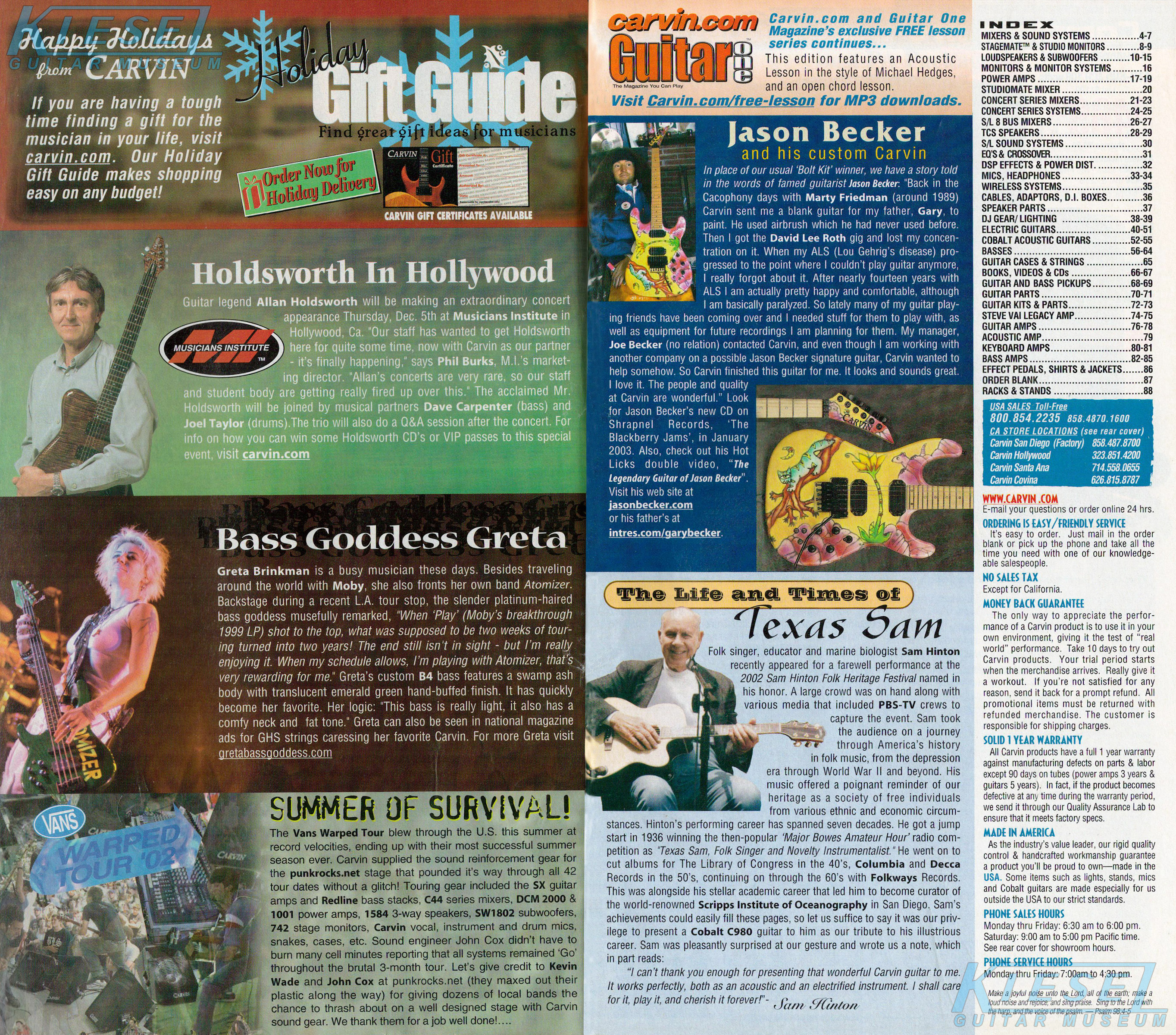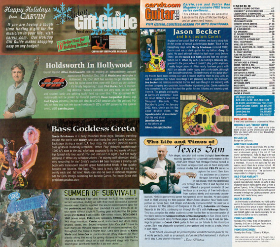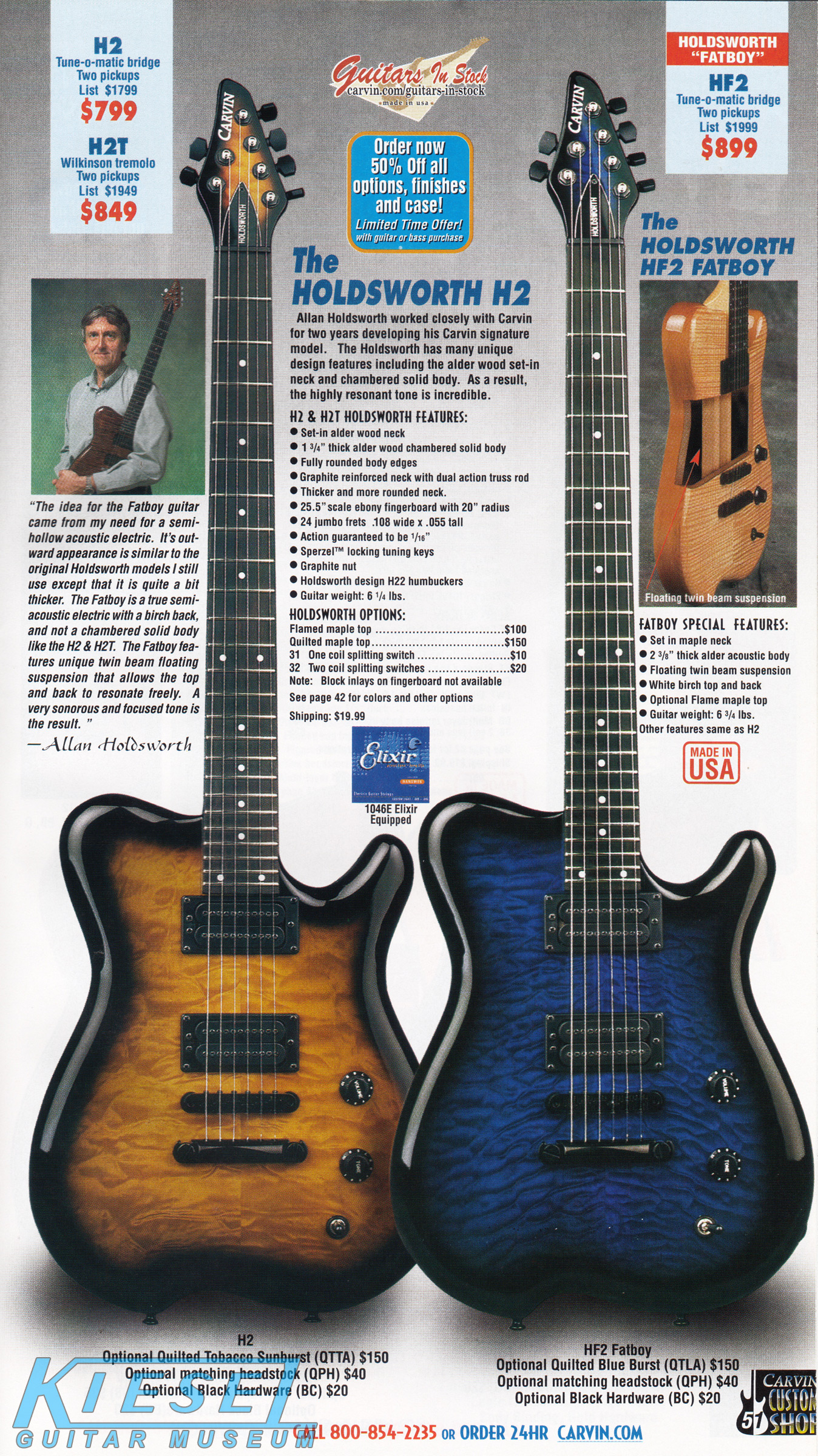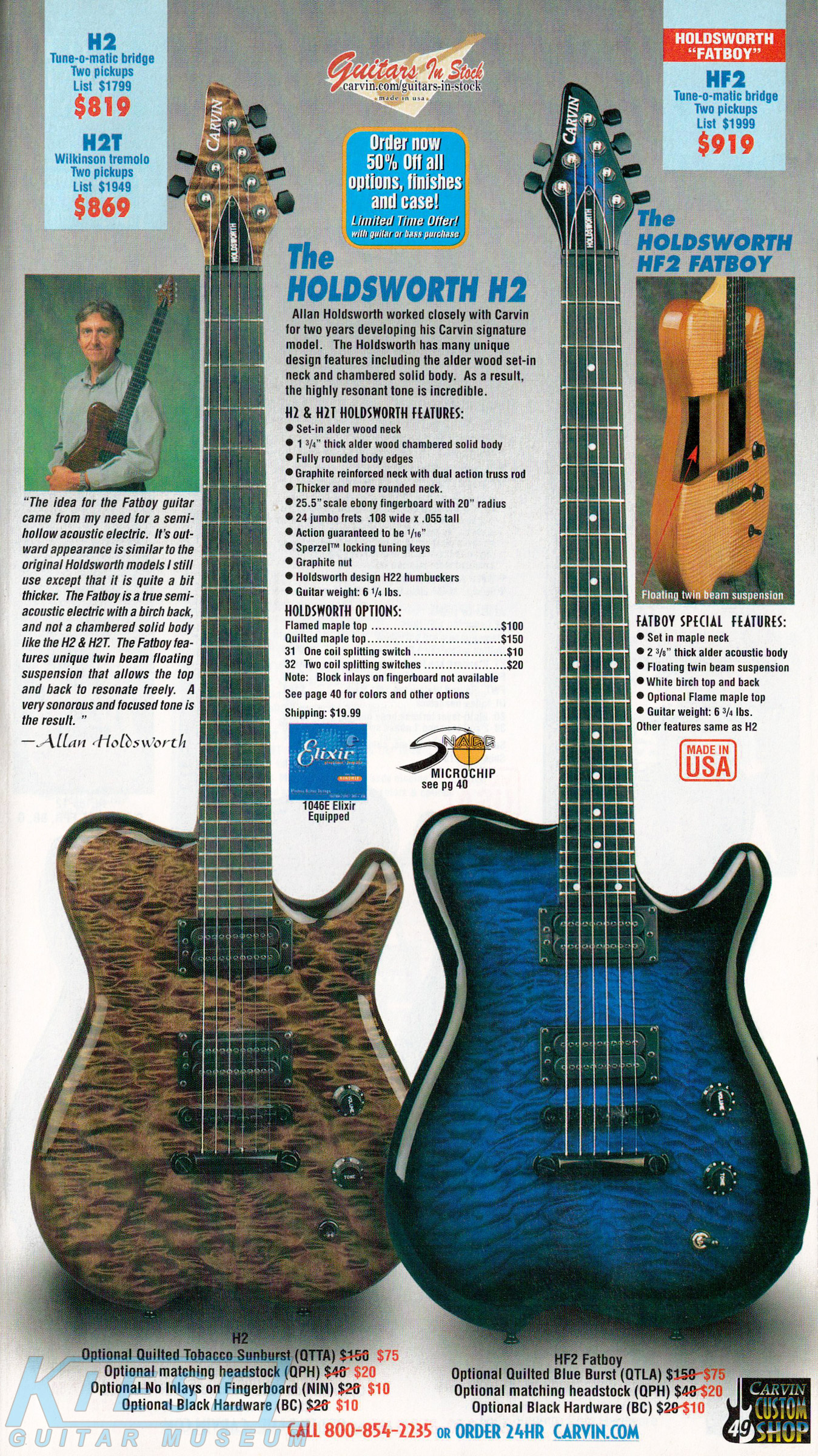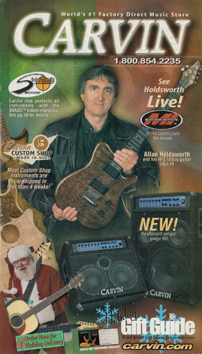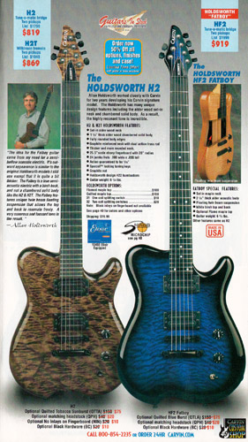 The Holdsworth H2 and HF2 Fatboy were unchanged, and used the same catalog photo as in 2001. The prices were also unchanged on all Holdsworth models for 2002. The catalog showed the H2 in Tobacco Sunburst on quilted maple with matching headstock and black hardware, and the HF2 Fatboy in Blueburst on quilted maple with matching headstock and black hardware.