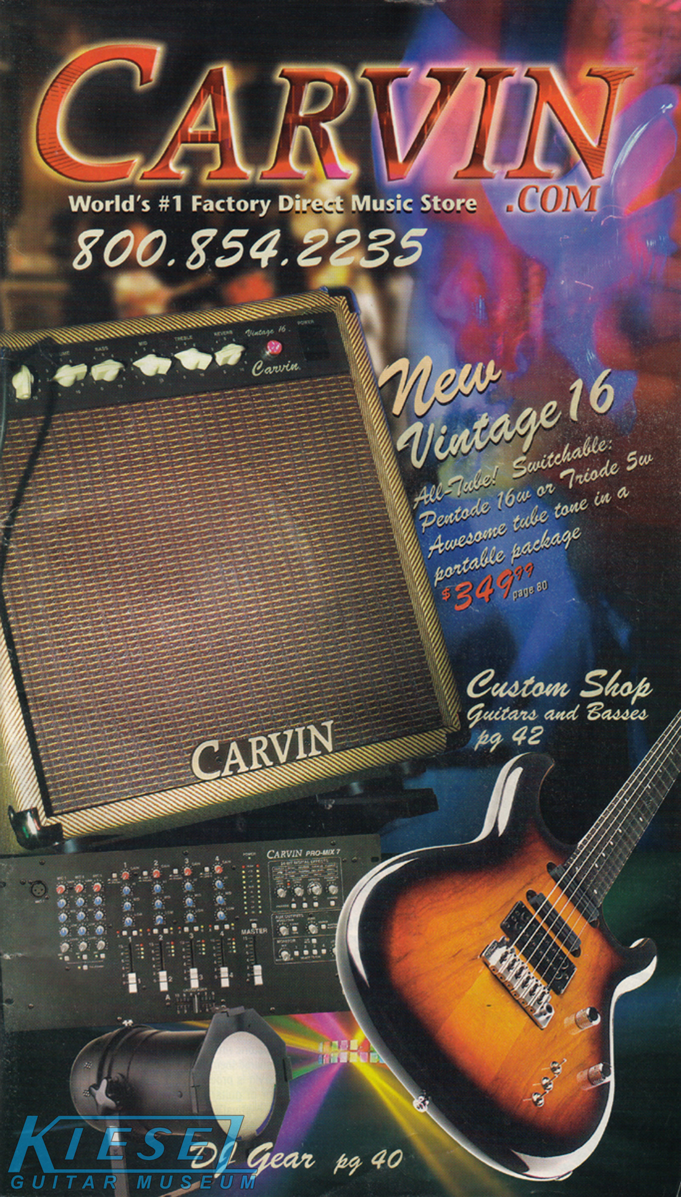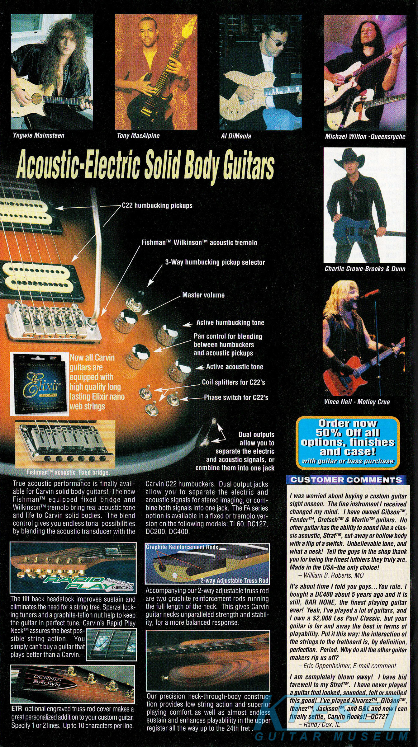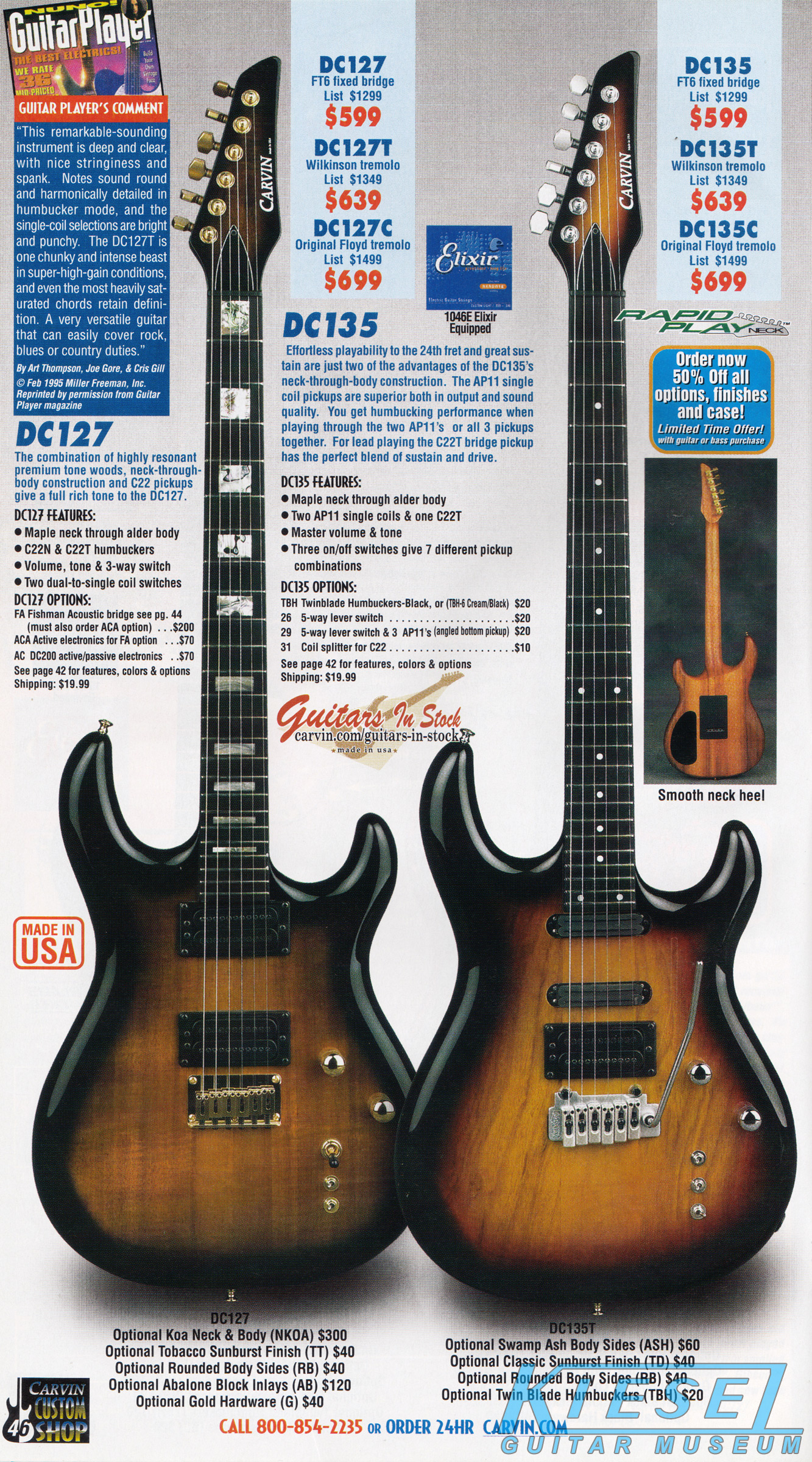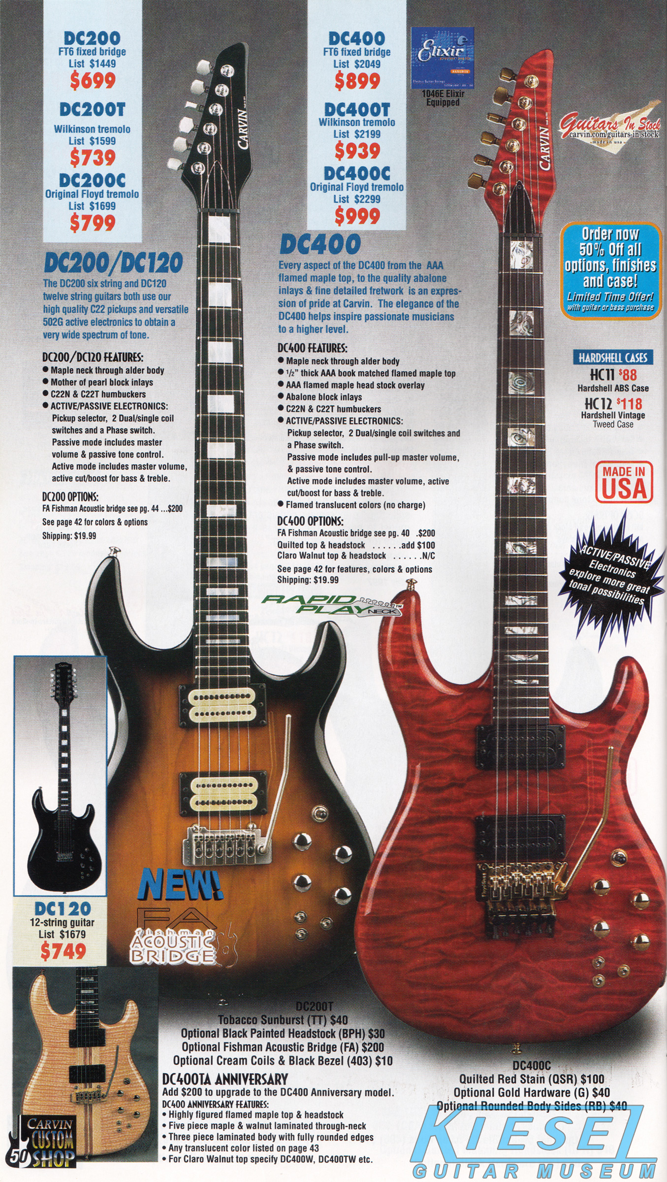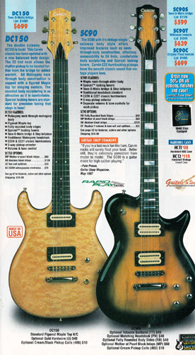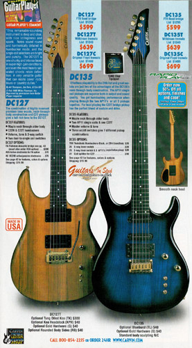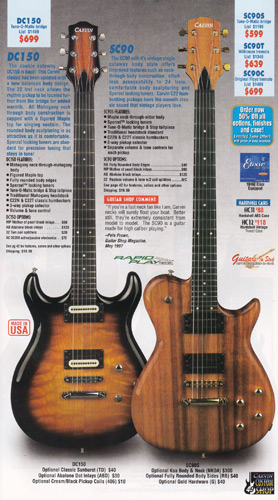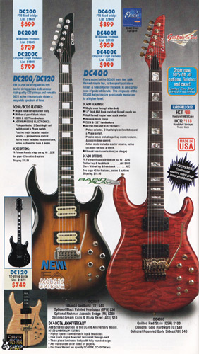 The DC200 and DC400 were unchanged, and used the same catalog photo. Base prices and Wilkinson-equipped prices remained the same, but the Floyd Rose-equipped models rose $20. The DC120 12-string (inset photo on the catalog page) remained $749. The DC400A Anniversary model (also shown in inset), which was a highly upgraded DC400, with 5-piece maple/koa neck, flamed maple top and matching headstock, and 3 piece alder/koa/flamed maple (or Claro Walnut) body was still available as a $200 upgrade to the DC400, DC400T or DC400C. The catalog photo showed the DC200 in Tobacco Sunburst with black painted headstock, Wilkinson tremolo, and cream pickups with black bezels, and the DC400 in Ruby Red Stain on quilted maple with matching headstock, Floyd Rose tremolo and gold hardware.