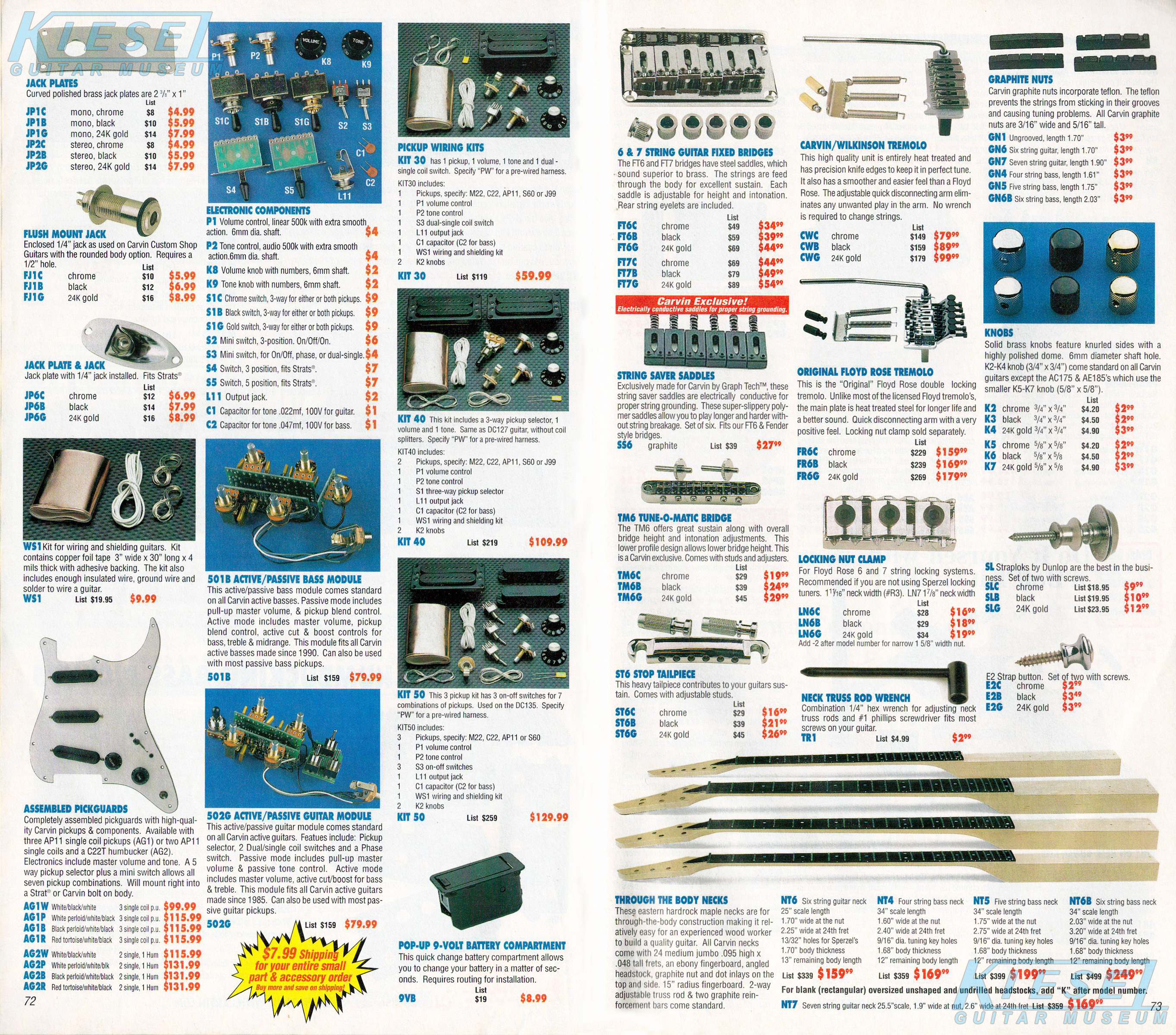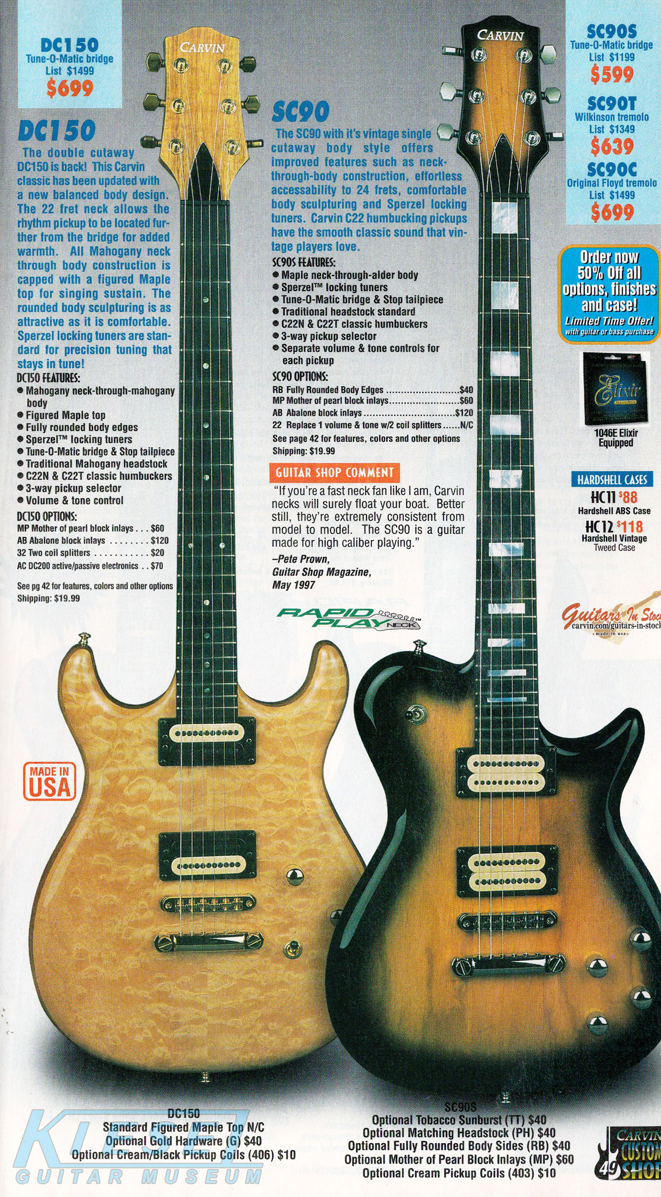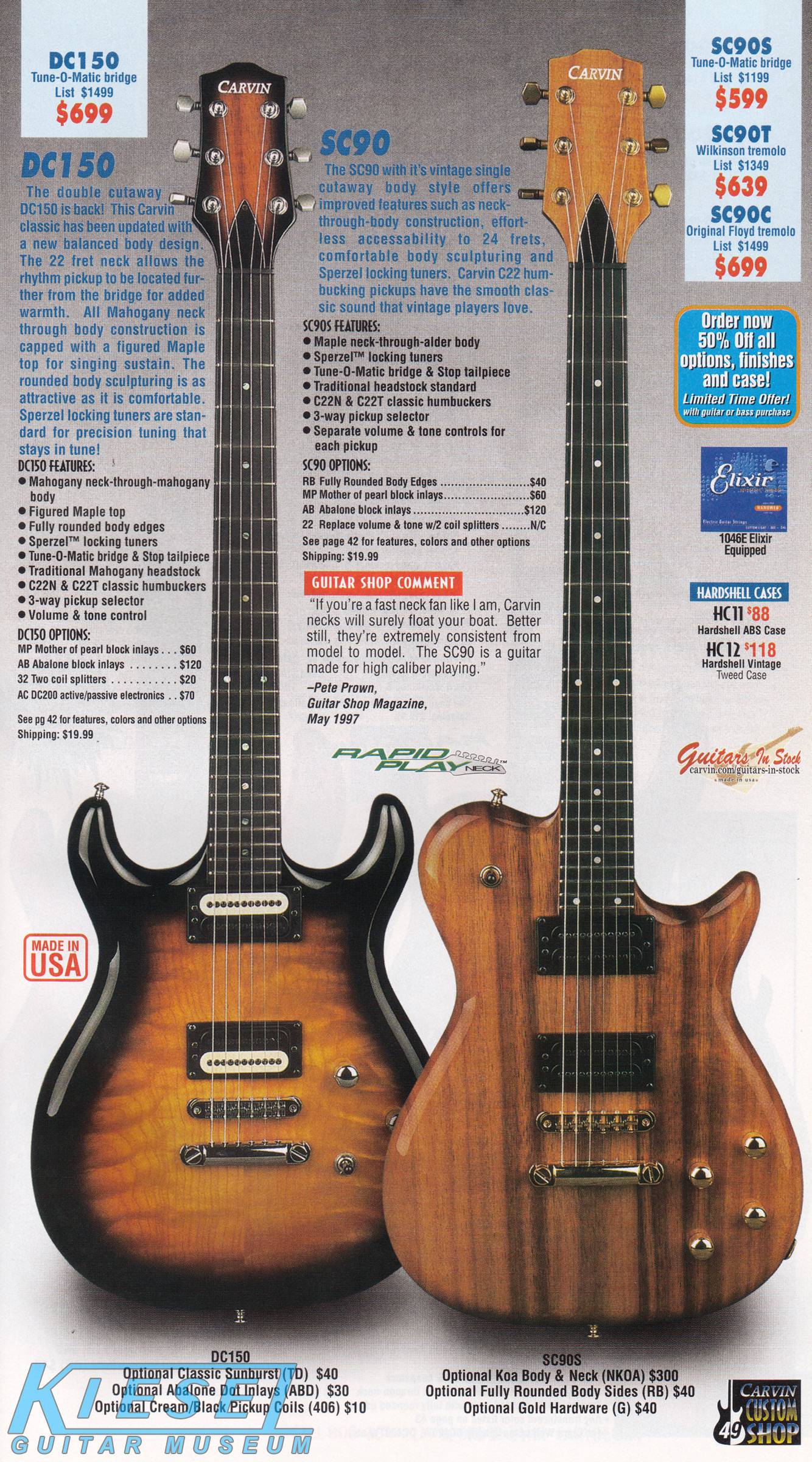 Unchanged for 2002 was the SC90. The base price on the hardtail model remained $599, and the Wilkinson-equipped SC90T remained $639. The SC90C, with original Floyd Rose tremolo, rose slightly to $699. The SC90 was shown in koa with rounded body sides and gold hardware.