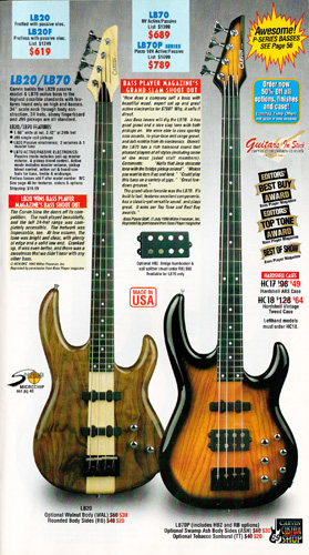 The passive LB20 and active LB70 were unchanged for 2002, and the prices were unchanged from 2001. The LB20 was priced at $589, and the LB70 was priced at $659. The LB70P was priced at $809. The May 2002 catalog showed an LB20F in Jet Black with fretlines, optional rounded body sides and black hardware, and an LB70P in Tobacco Sunburst on swamp ash with matching headstock and gold hardware.