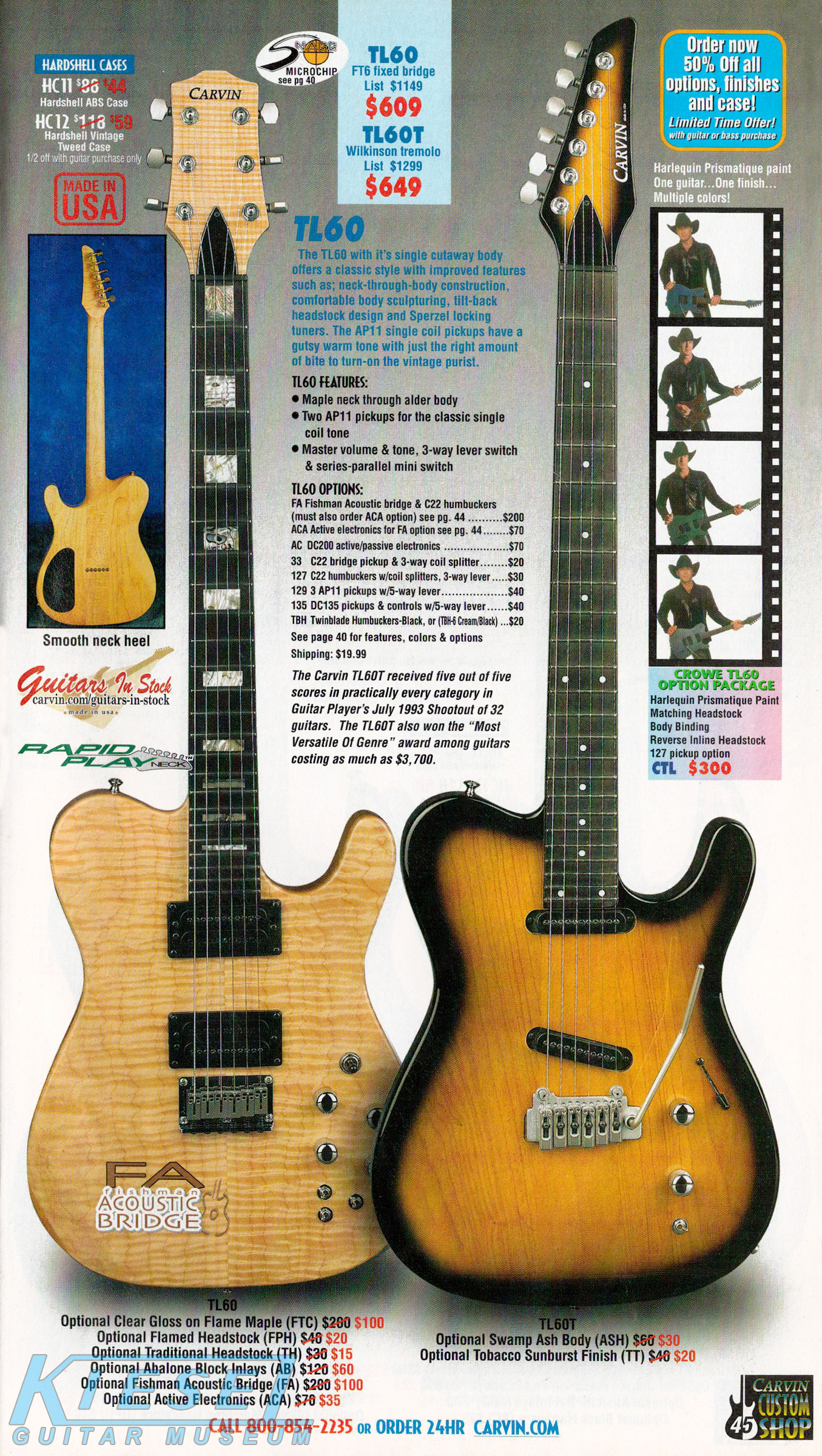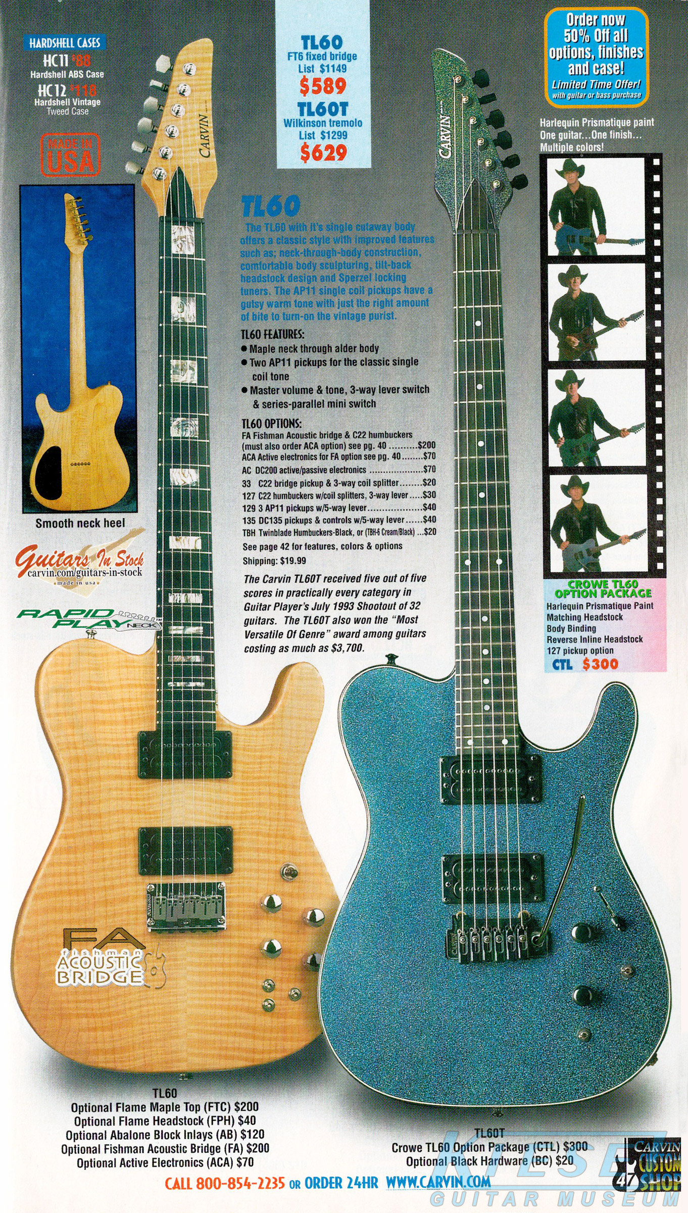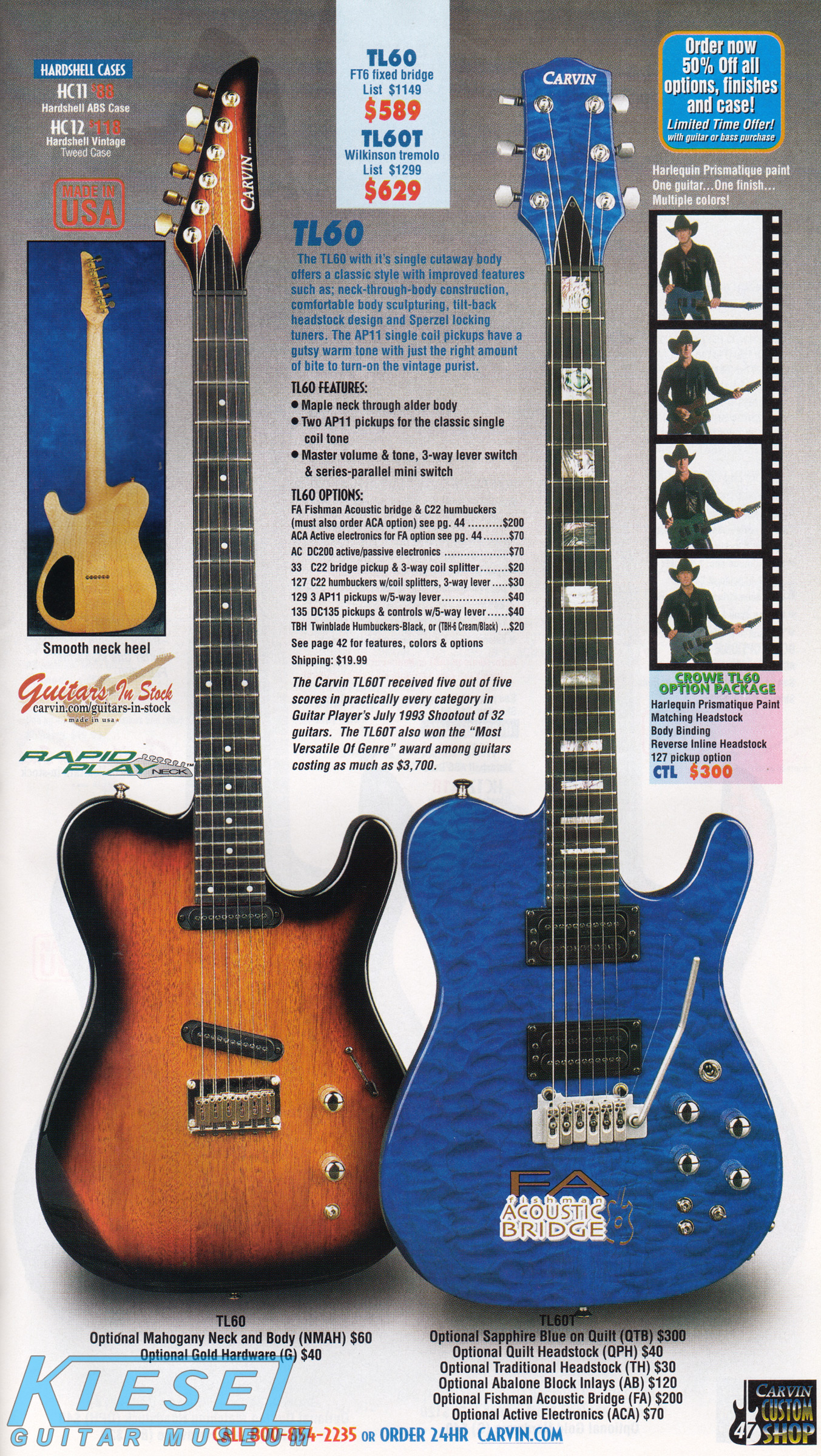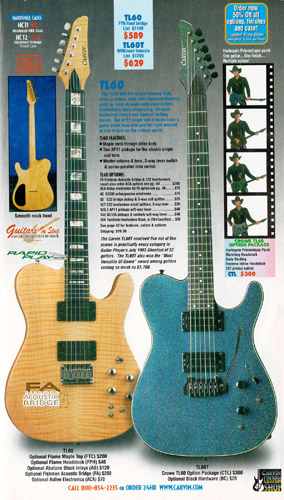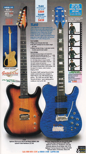 The TL60 got a new catalog photo for 2002, but was otherwise unchanged. The base price of the TL60 remained $589 (with the FT6 fixed bridge), or $629 with a Wilkinson tremolo. The Carvin-licensed Floyd Rose tremolo was not available on this model, although the Fishman acoustic bridge was offered. The catalog photo showed a TL60 in Classic Sunburst on mahogany with matching headstock, standard electronics and gold hardware, and a TL60T in Sapphire Blue on quilted maple with matching traditional headstock, abalone block inlays, Fishman acoustic bridge and active electronics with humbuckers.
