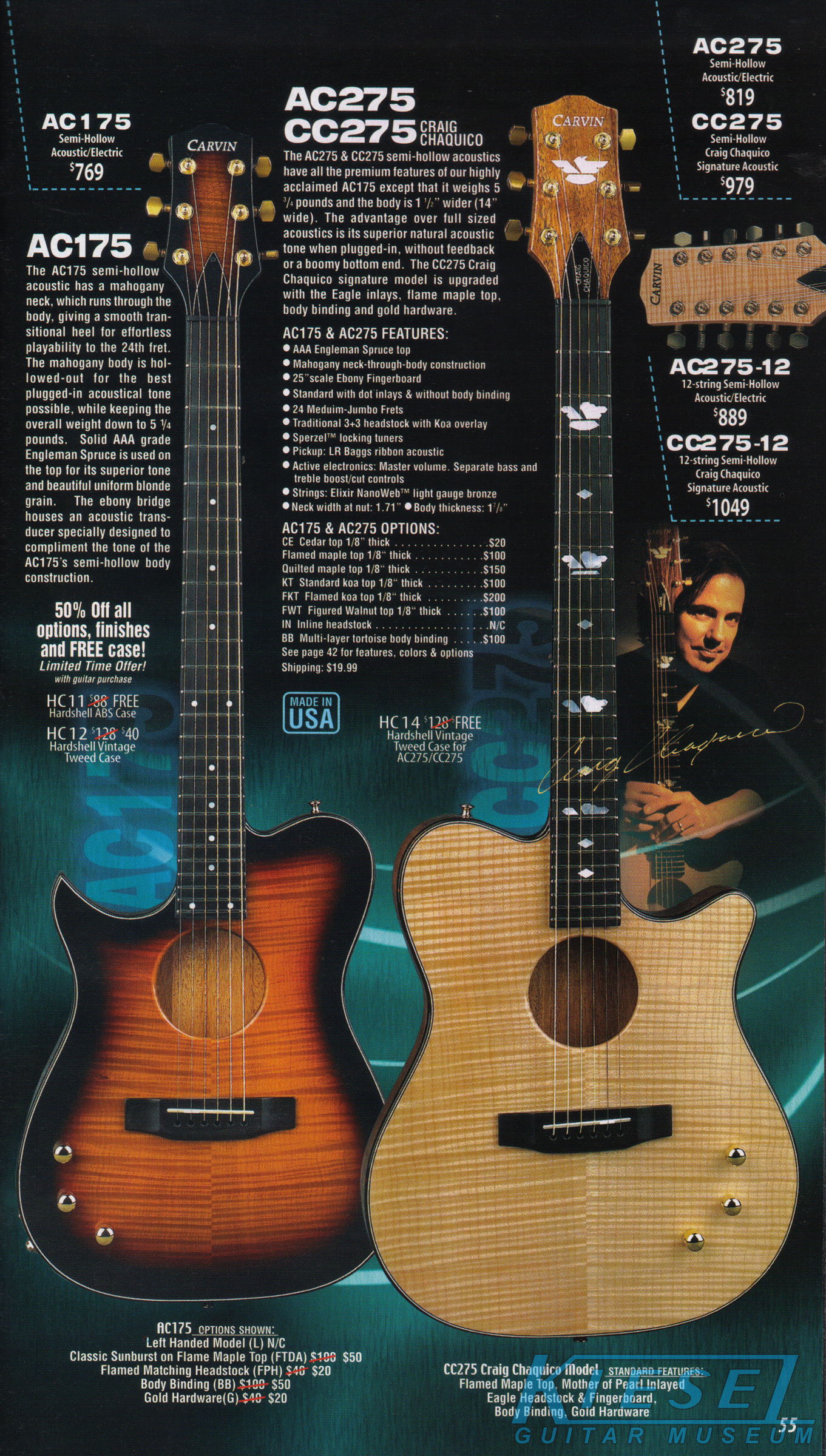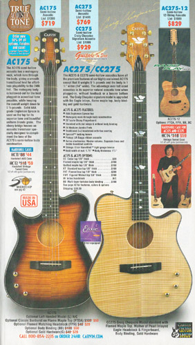 CC275 was $979. The Winter catalog photo showed a left-handed AC175 in Classic Sunburst on flamed maple with matching headstock, body binding, and gold hardware,