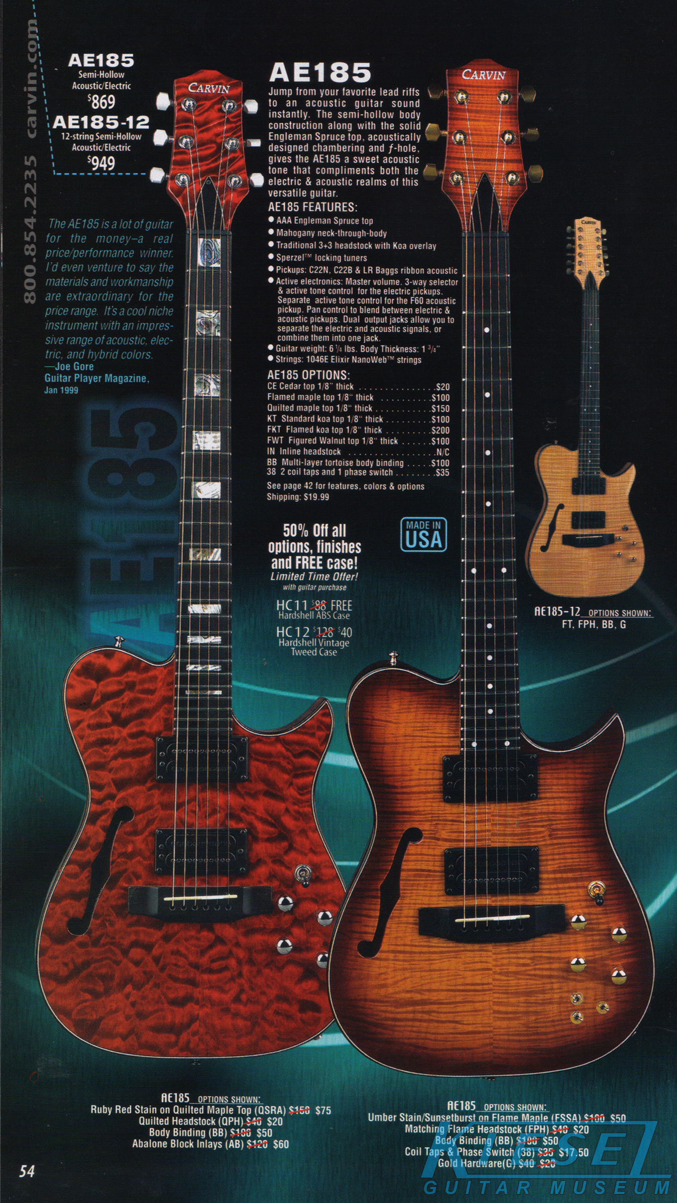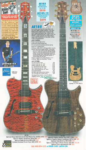 was $949. The Winter catalog photo showed an AE185 in Ruby Red Stain on quilted maple with matching headstock, body binding and abalone block inlays, and one in