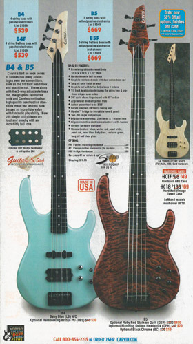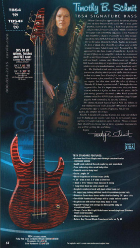 either fretted or fretless versions. The July catalog showed the TBS4 in Ruby Red Stain on quilted maple.