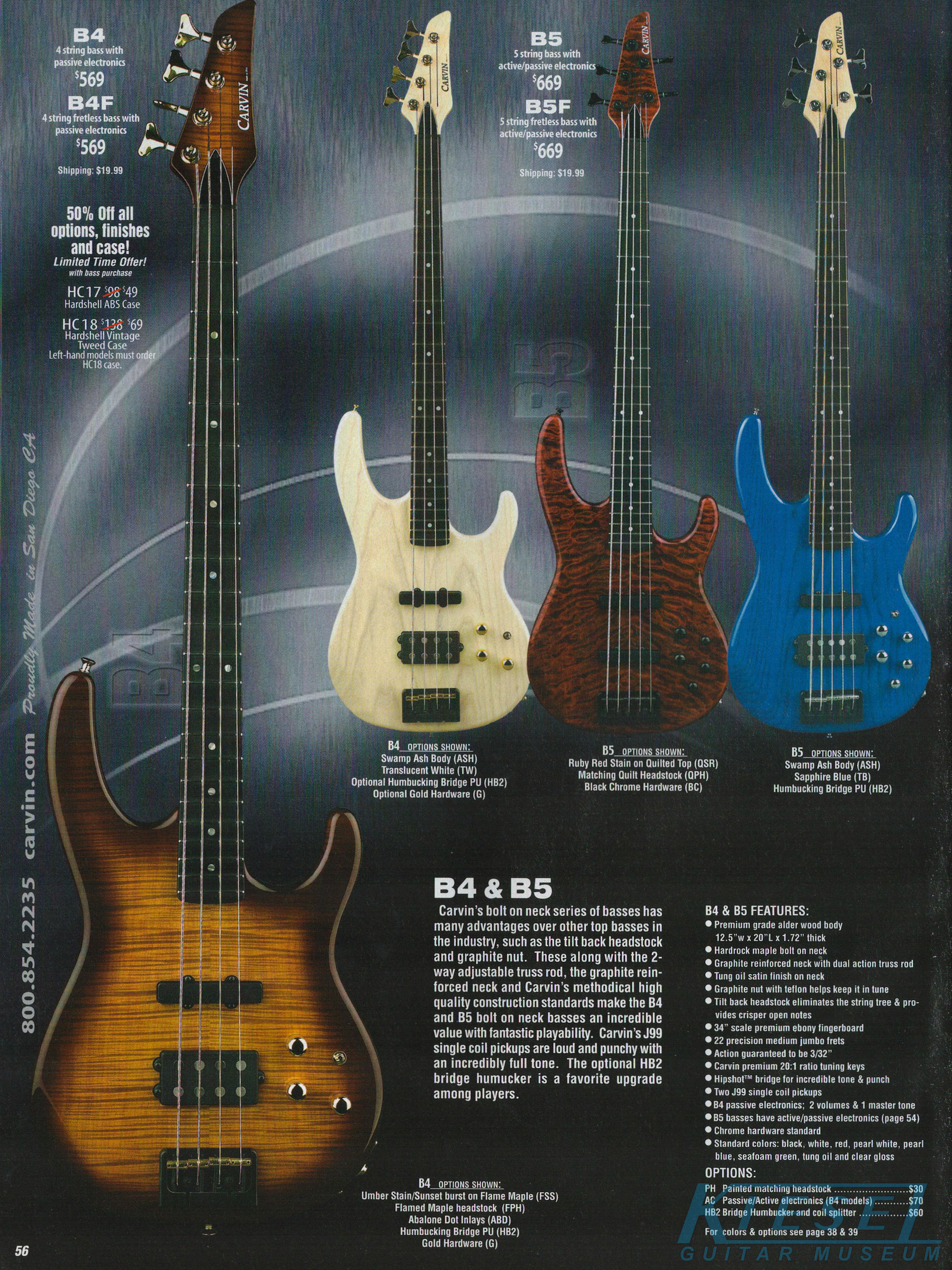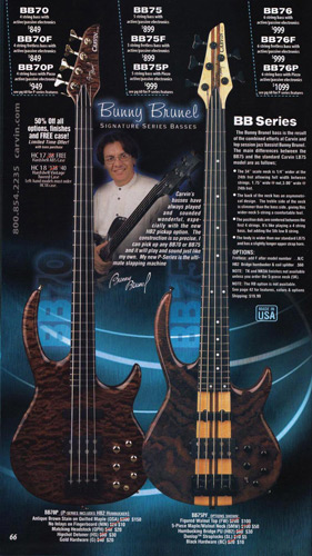 The 2003 catalog featured new photos of the long-running BB70 and BB75 four and five string models. The BB76 was not pictured. The