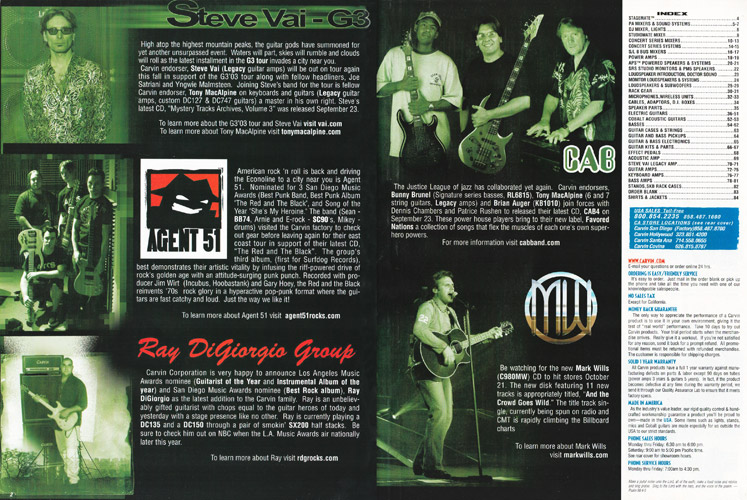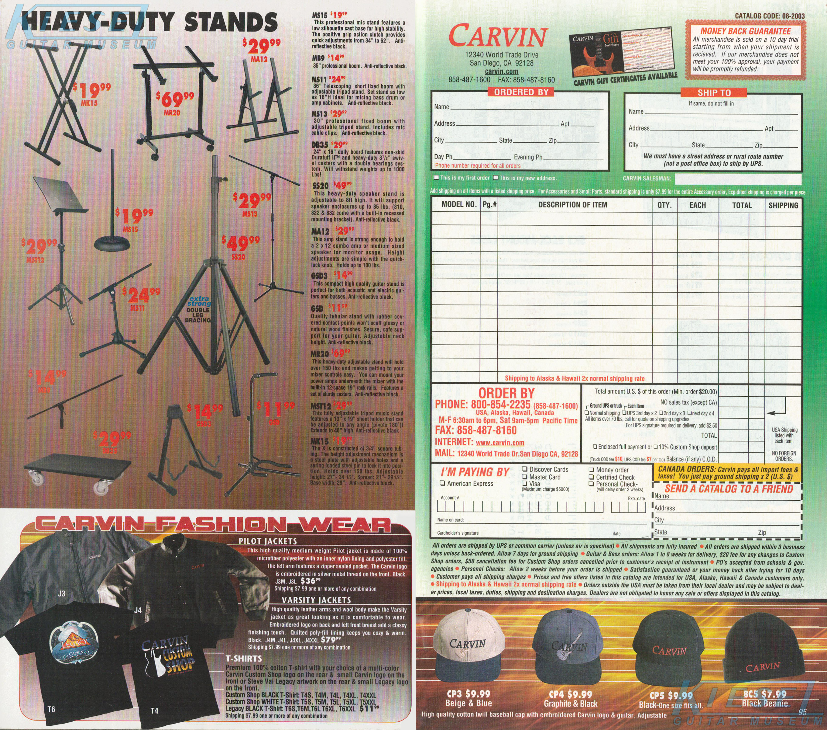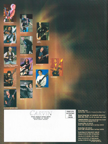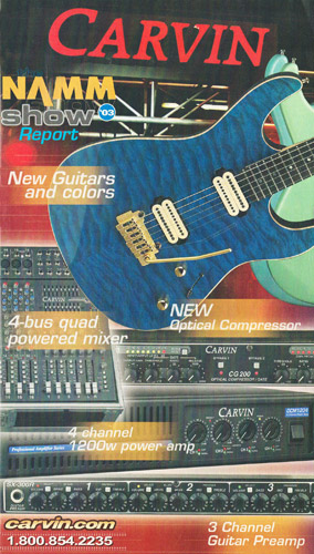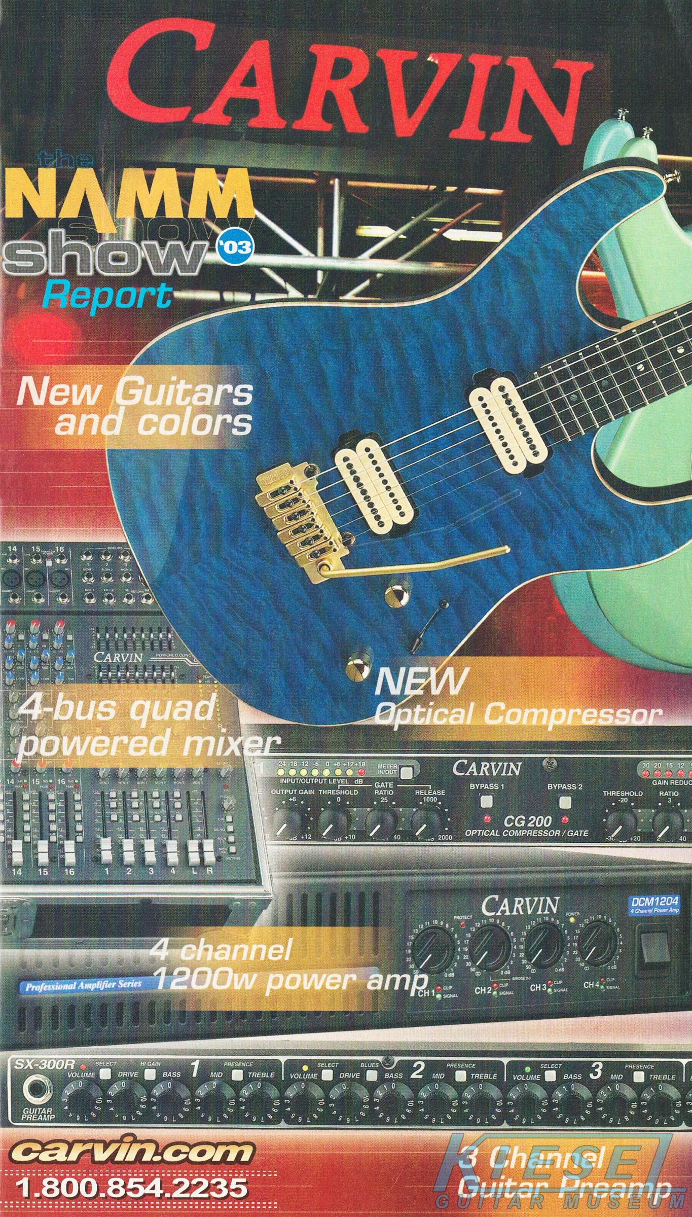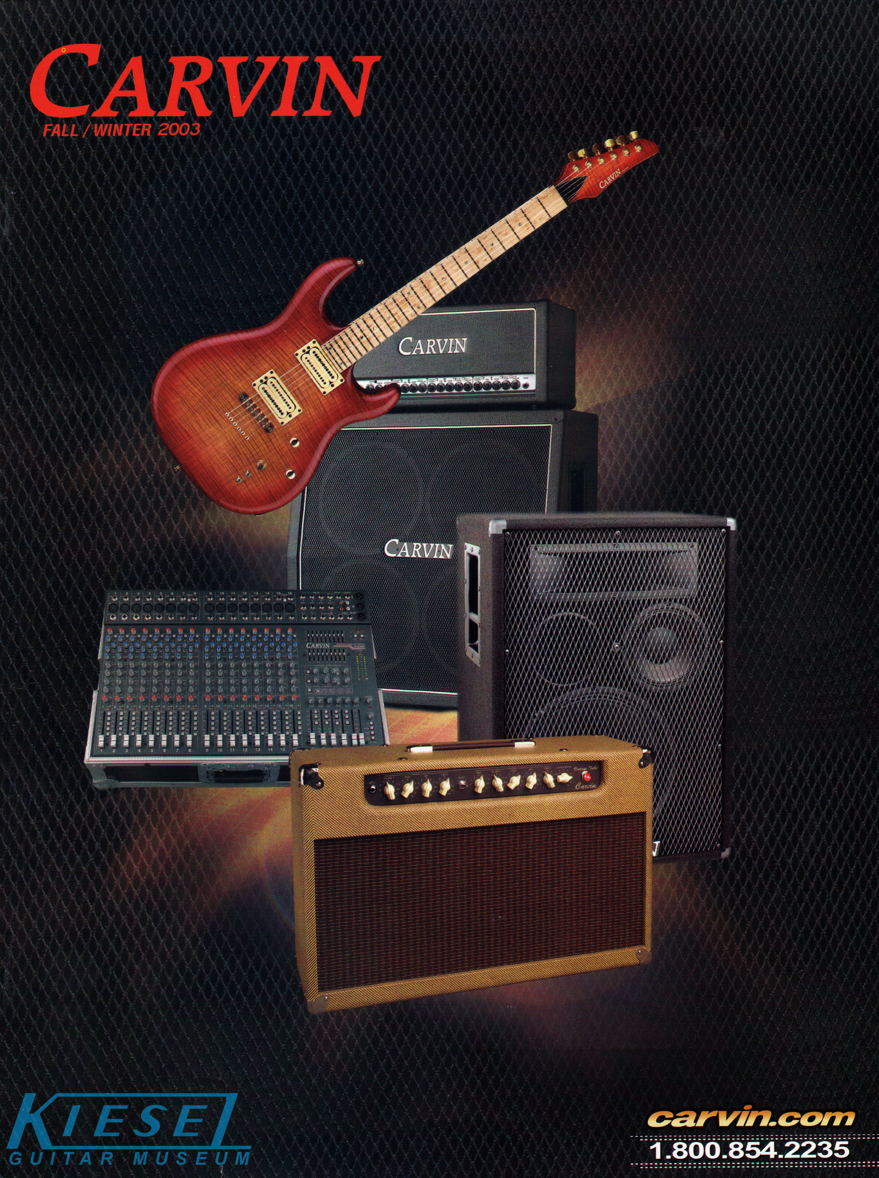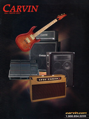 There was a significant change to the marketing in mid-2003. Since the inception of the smaller, quarterly catalogs, guitars and basses had been shown on relatively neutral backgrounds, primarily using earth tones or plain white. In mid-2003, this changed to a flashy computer generated black background, giving a high-tech, modern appearance to Carvin's guitars and basses. This would appear in one catalog only, and would lead up to the return of the large-format 8 1/2" X 11" catalog in 2004. In conjunction with the new catalog layout, the Carvin.com website also featured new guitar pictures on a similar computer-generated black background (shown throughout below). For the first time, the catalog and website layouts matched and complimented each other, and gave a fresh, new appearance to both. Carvin discontinued showing photographs of In-Stock instruments on their website in mid-2003, however, the In-Stock images were re-added after several months in response to customer's requests.