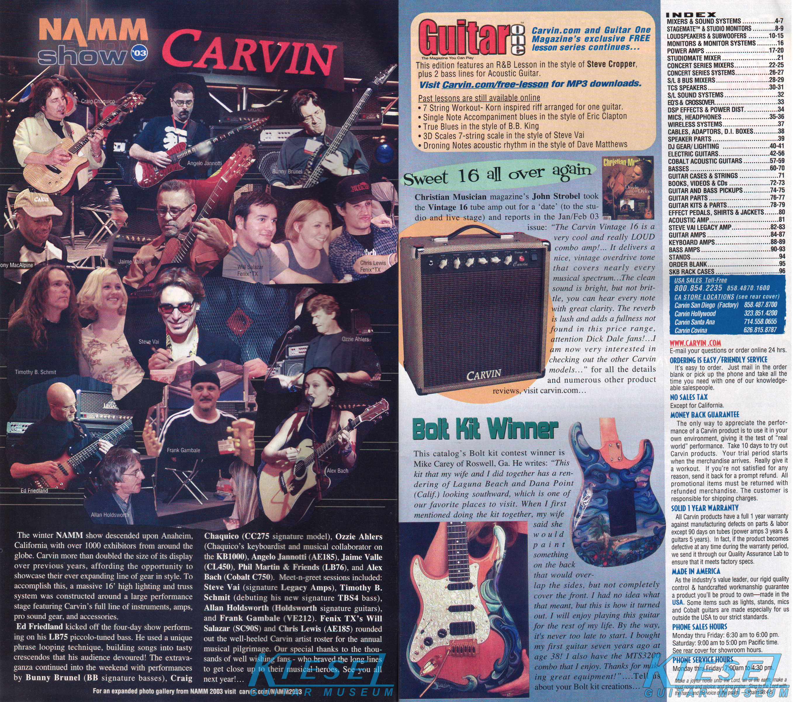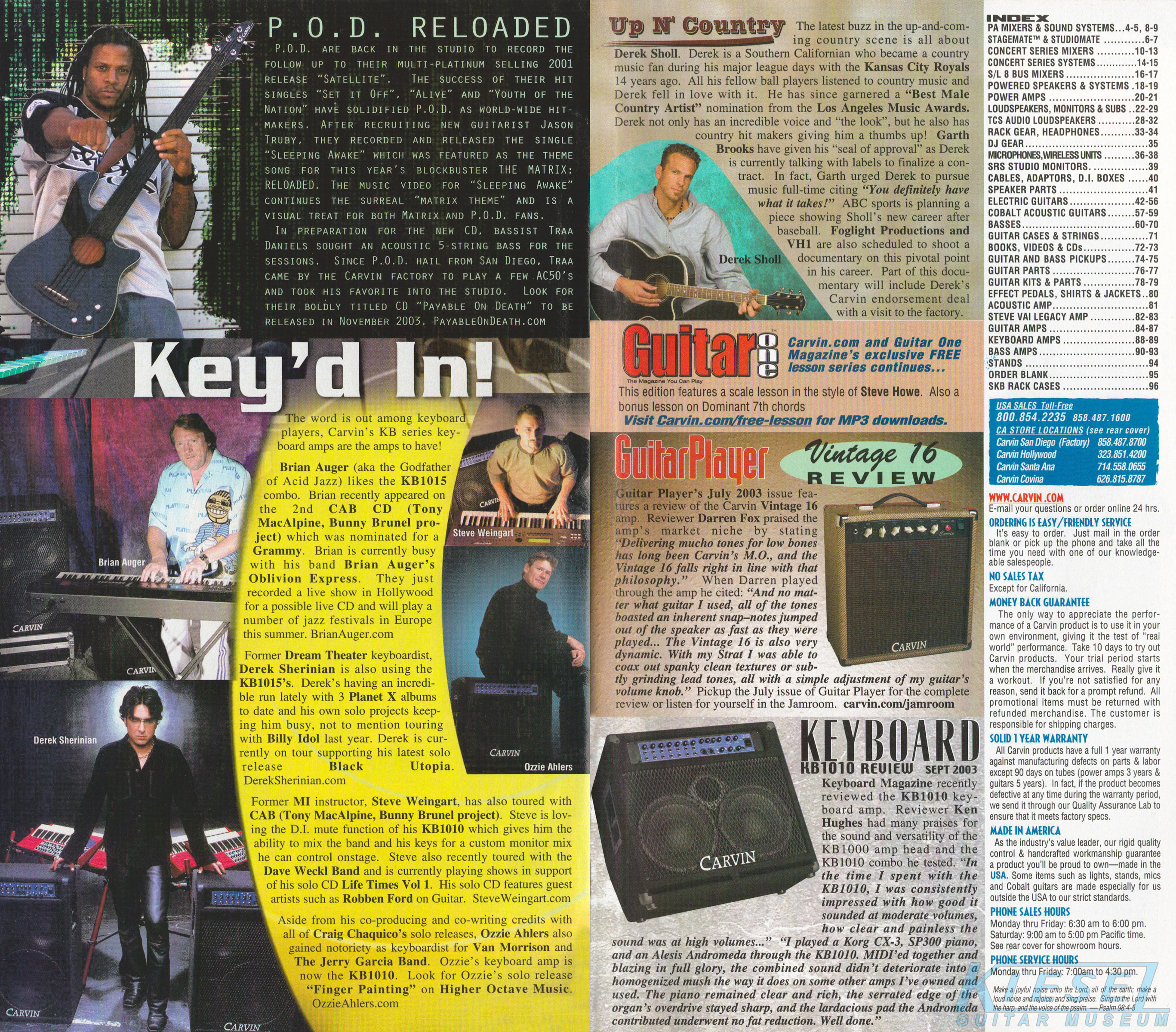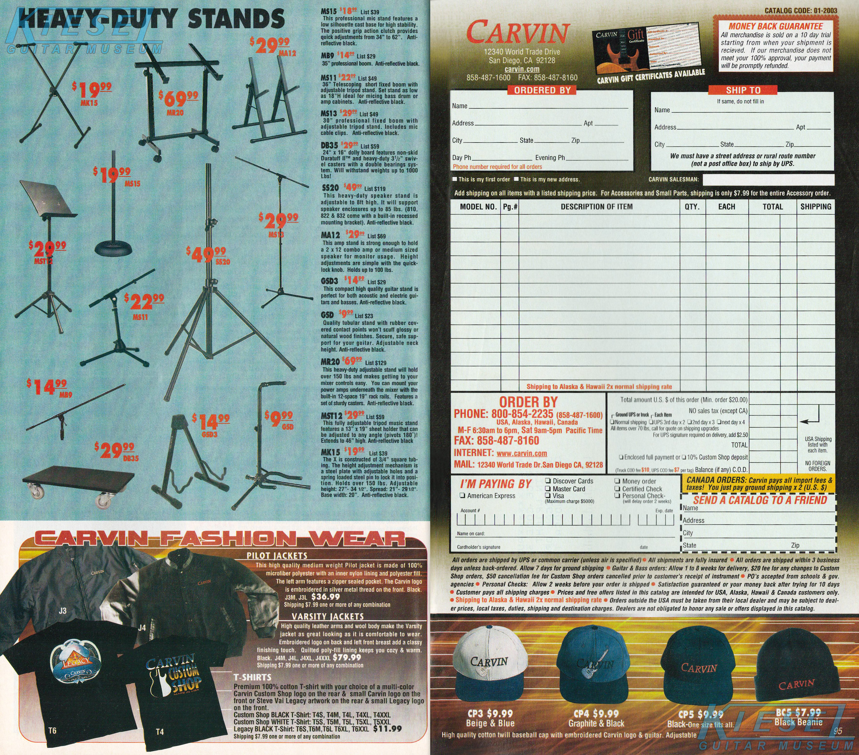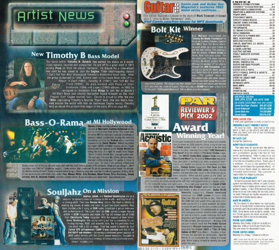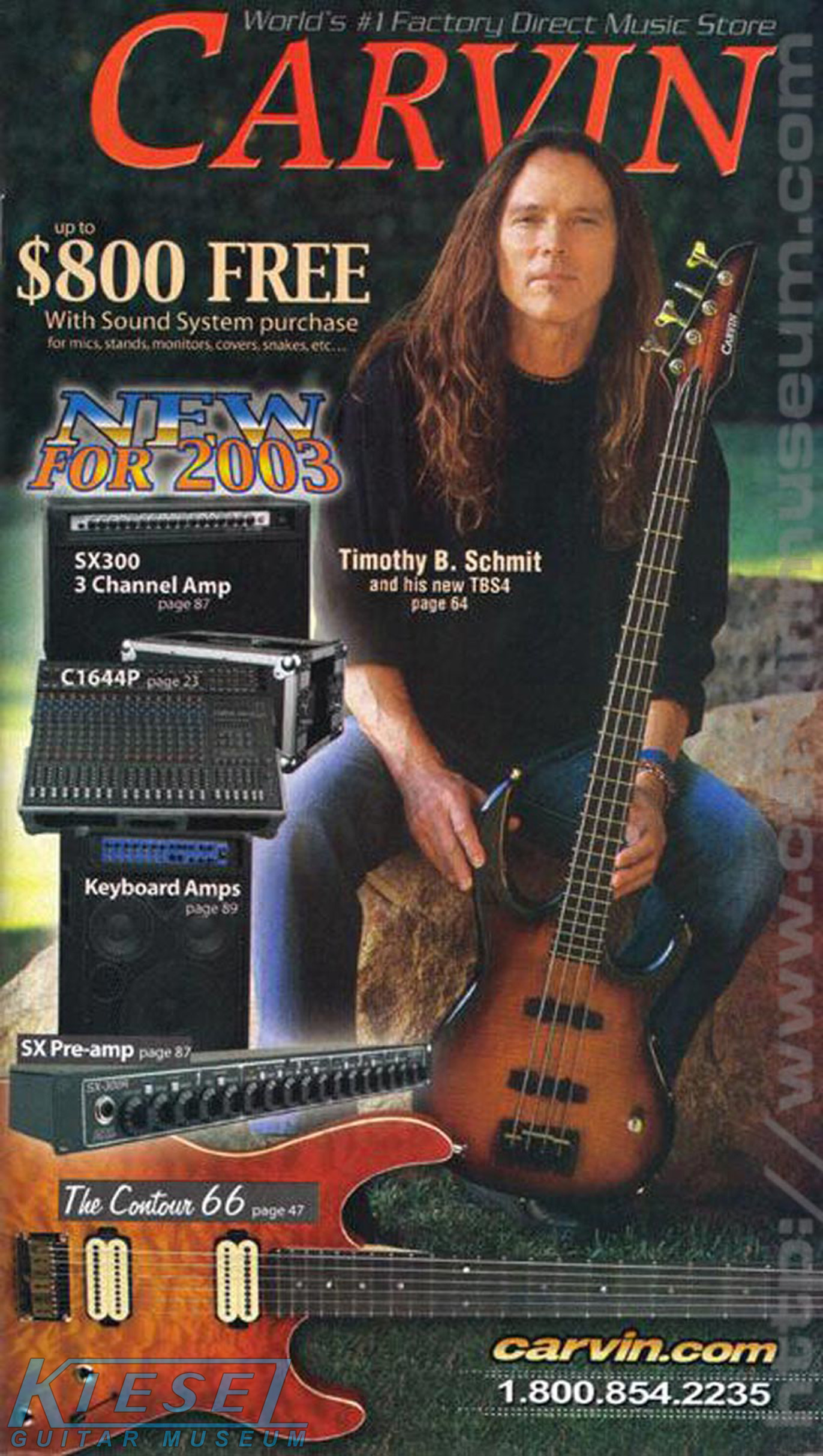 There was a significant change to the marketing in mid-2003. Since the inception of the smaller, quarterly catalogs, guitars and basses had been shown on relatively neutral backgrounds, primarily using earth tones or plain white. In mid-2003, this changed to a flashy computer generated black background, giving a high-tech, modern appearance to Carvin's guitars and basses. This would appear in one catalog only, and would lead up to the return of the large-format 8 1/2" X 11" catalog in 2004. In conjunction with the new catalog layout, the Carvin.com website also featured new guitar pictures on a similar computer-generated black background (shown throughout below). For the first time, the catalog and website layouts matched and complimented each other, and gave a fresh, new appearance to both. Carvin discontinued showing photographs of In-Stock instruments on their website in mid-2003, however, the In-Stock images were re-added after several months in response to customer's requests.